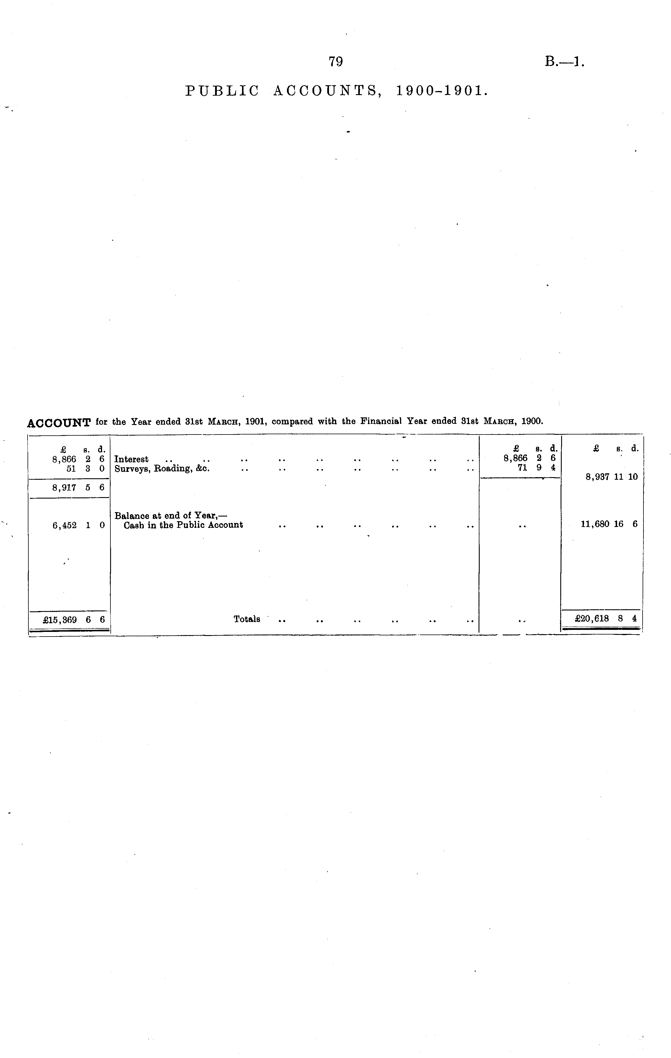 £ s. d. 8,866 2 6 51 3 0 Interest Surveys, Roading, &c. £ s. d. 8,866 2 6 71 9 4 £ s. d. 8,937 11 10 8,917 5 6 Balance at end of Year, — Cash in the Public Account 11,680 16 6 6,452 1 0 £15,369 6 6 Totals £20,618 8 4