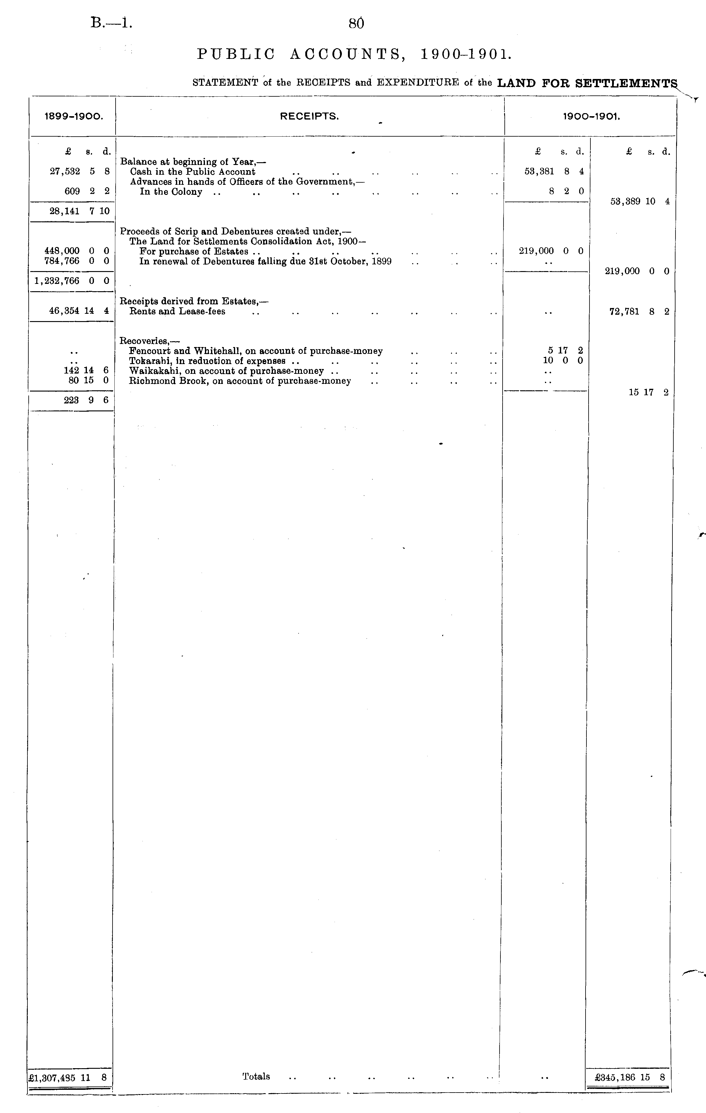 1899-1900. RECEIPTS. 1900-1901. £ s. d. £ s. d. £ s. d. 27,532 5 8 609 2 2 Balance at beginning of Year, — Cash in the Public Account Advances in hands of Officers of the Government, — In the Colony 53,381 8 4 8 2 0 53,389 10 4 28,141 7 10 Proceeds of Scrip and Debentures created under, — The Land for Settlements Consolidation Act, 1900— For purchase of Estates In renewal of Debentures falling due 31st October, 1899 219,000 0 0 448,000 0 0 784,766 0 0 219,000 0 0 1,232,766 0 0 46,354 14 4 Receipts derived from Estates, — Rents and Lease-fees 72,781 8 2 142 14 6 80 15 0 Recoveries, — Fencourt and Whitehall, on account of purchase-money Tokarahi, in reduotion of expenses Waikakahi, on account of purchase-money Richmond Brook, on account of purchase-money 5 17 2 10 0 0 15 17 2 223 9 6 !1,307,485 11 8 Totals £345,186 15 8