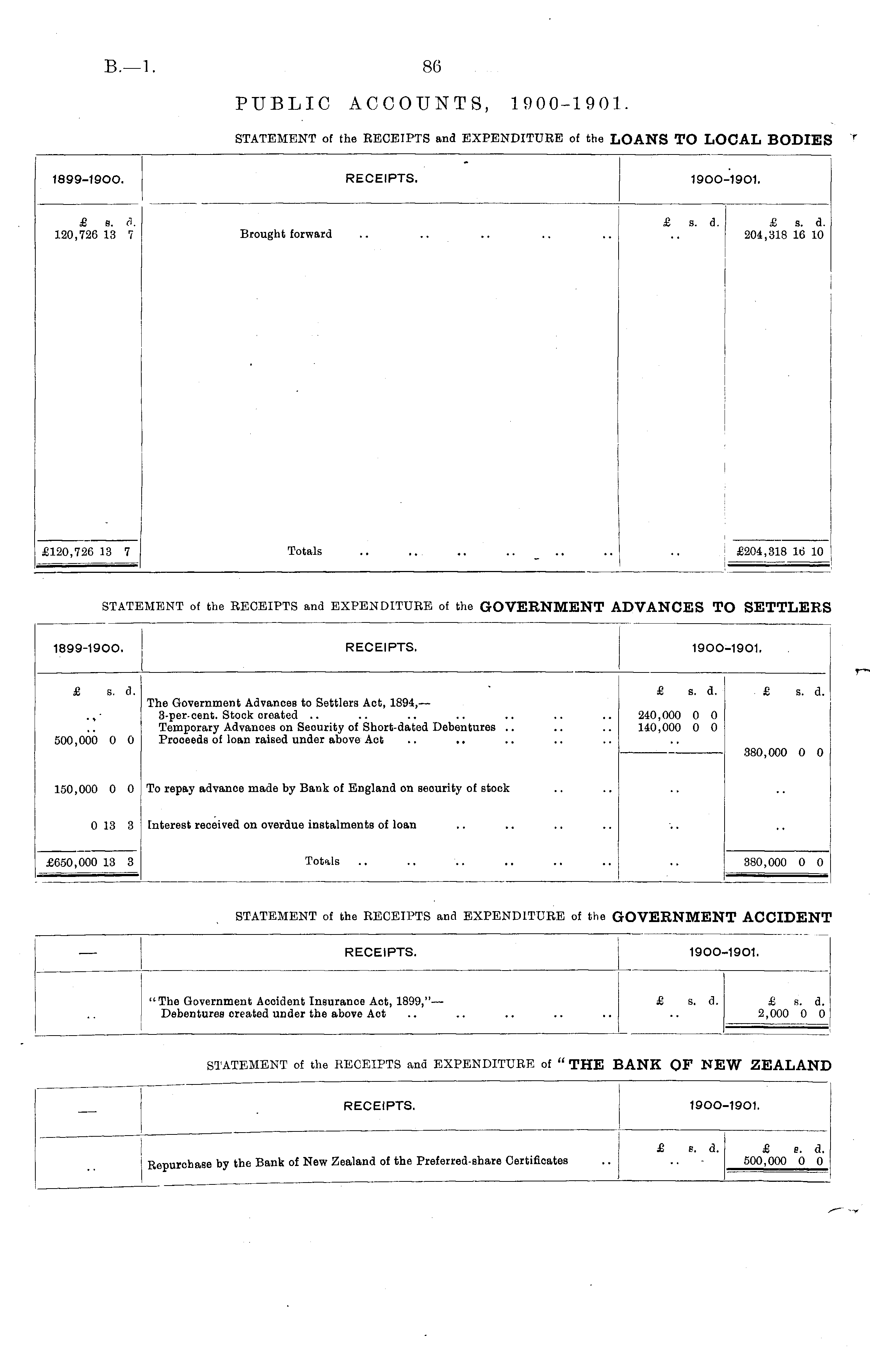 RECEIPTS. 1900-1901. " The Government Acoident Insurance Act, 1899,"— Debentures created under the above Act £ s. d. £ s. d. 2,000 0 0 STATEMENT of the RECEIPTS and EXPENDITURE of " THE BANK OF NEW ZEALAN RECEIPTS. 1900-1901. I Repurchase by the Bank of New Zealand of the Preferred-share Certificates £ s. d. £ s. d. 500,000 0 0