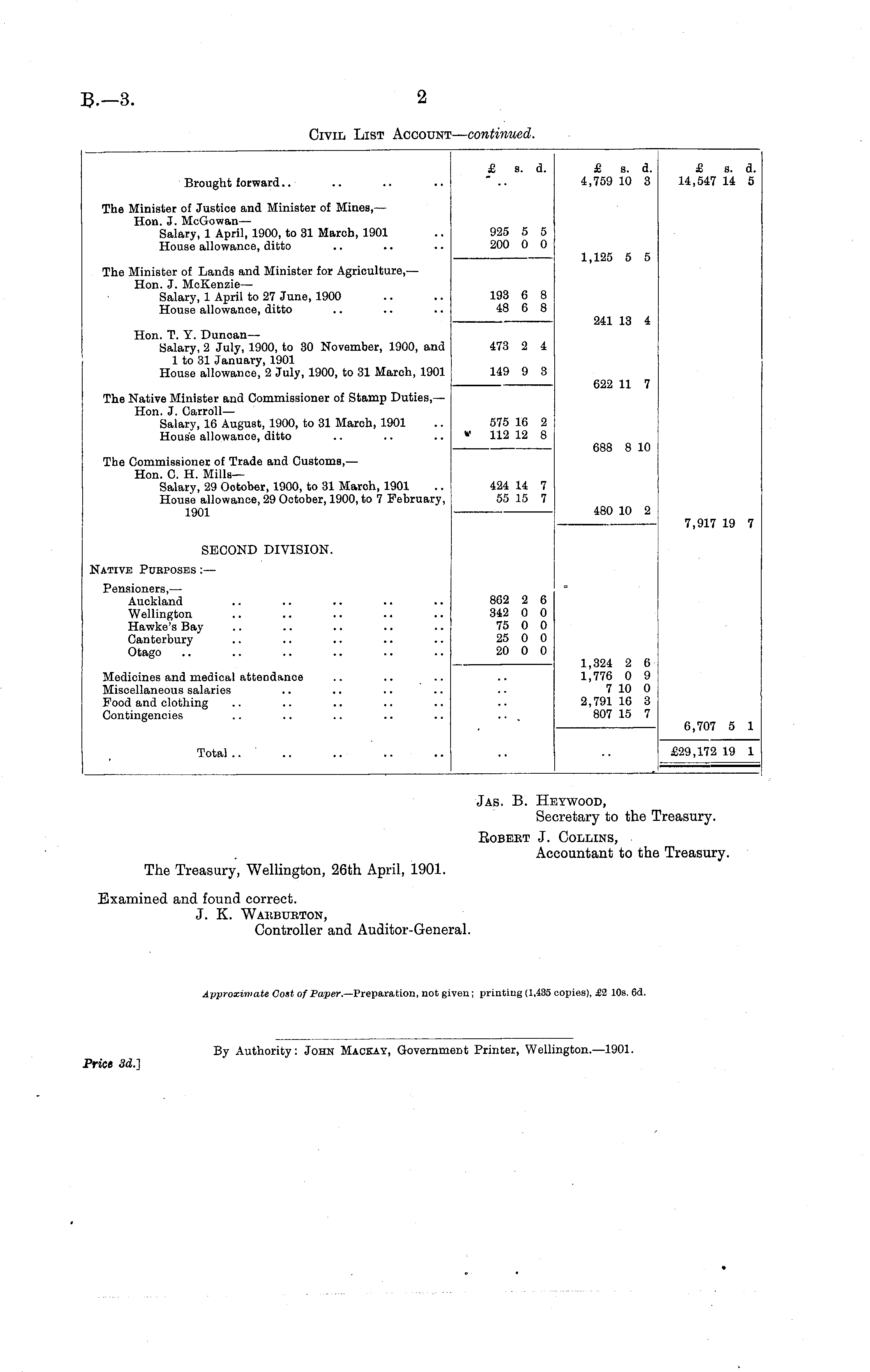 Jas. B. Heywood, Secretary to the Treasury. Robeet J. Collins, Accountant to the Treasury. The Treasury, Wellington, 26th April, 1901. Examined and found correct. J. K. Wakbukton, Controller and Auditor-General. Approximate Cost of Paper.— Preparation, not given ; printing (1,435 copies), £1 10s. Od.