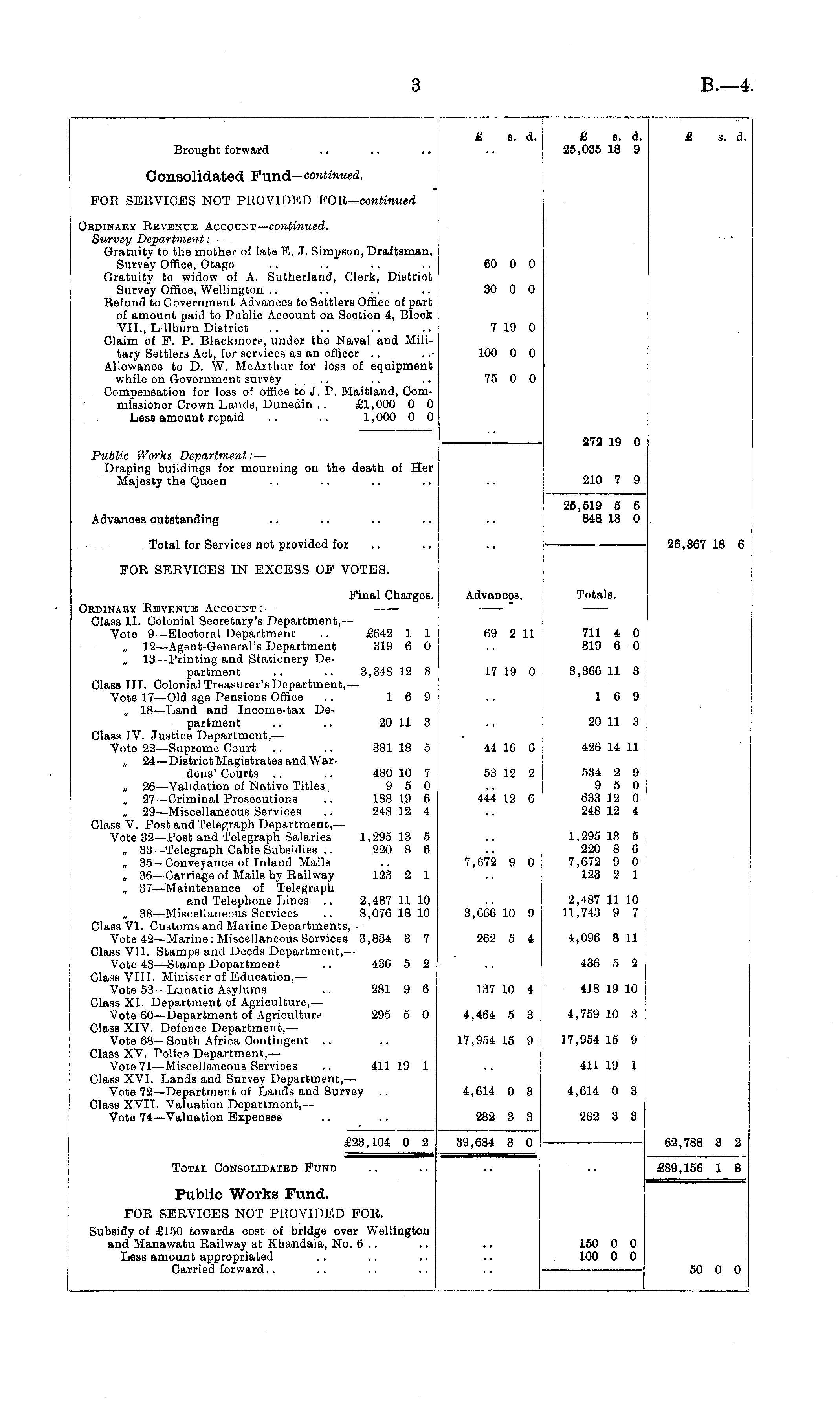 Brought forward £ s. d. £ I, d. 25,035 18 9 £ s. d. Consolidated Fund— continued. FOR SERVICES NOT PROVIDED FOR— continued IBDINAKY Revenue Account— continued. Survey Department: — Gratuity to the mother of late E. J. Simpson, Draftsman, Survey Office, Otago Gratuity to widow of A. Sutherland, Clerk, District Survey Office, Wellington Refund to Government Advances to Settlers Office of part of amount paid to Public Account on Seotion 4, Block VII., Lllburn District Claim of F. P. Blaekmorc, under the Naval and Military Settlers Act, for services as an officer Allowance to D. W. McArthur for loss of equipment while on Government survey Compensation for loss of office to J. P. Maitland, Commissioner Crown Lands, Dunedin .. £1,000 0 0 Less amount repaid .. .. 1,000 0 0 60 0 0 30 0 0 7 19 0 100 0 0 75 0 0 Public Works Department: — Draping buildings for mourning on the death of Her Majesty the Queen 272 19 0 210 7 9 Advances outstanding 25,519 5 6 848 13 0 Total for Services not provided for 26,367 18 6 FOR SERVICES IN EXCESS OF VOTES. Advanoee. Final Charges. Totals. •edinaby Revenue Account :— Class II. Colonial Secretary's Department,— Vote 9—Electoral Department .. £642 1 1 „ 12—Agent-General's Department 319 6 0 „ 13—Printing and Stationery Department .. .. 3,348 12 3 Class III. Colonial Treasurer's Department,— Vote 17—Old-age Pensions Office .. 16 9 „ 18—Land and Income-tax Department .. .. 20 11 3 Class IV. Justice Department,— Vote 22—Supreme Court .. .. 381 18 5 „ 24—District Magistrates and Wardens' Courts .. .. 480 10 7 „ 26—Validation of Native Titles 9 5 0 „ 27—Criminal Prosecutions .. 188 19 6 „ 29—Miscellaneous Services .. 248 12 4 Class V. Post and Telegraph Department,— Vote 32—Post and Telegraph Salaries 1,295 13 5 , 33—Telegraph Cable Subsidies .. 220 8 6 „ 35—Conveyance of Inland Mails „ 36—Carriage of Mails by Railway 123 2 1 „ 37 —Maintenance of Telegraph and Telephone Lines .. 2,487 11 10 „ 38—Miscellaneous Services .. 8,076 18 10 Class VI. Customs and Marine Departments,— Vote 42—Marine: Miscellaneous Services 3,834 3 7 Class VII. Stamps and Deeds Department,— Vote 43 —Stamp Department .. 436 5 2 Class VIII. Minister of Education, — Vote 53—Lunatic Asylums .. 281 9 6 Class XI. Department of Agriculture,— Vote 60—Department of Agriculture 295 5 0 Class XIV. Defence Department,— Vote 68—South Africa Contingent Class XV. Polica Department,— Vote 71—Miscellaneous Services .. 411 19 1 Class XVI. Lands and Survey Department,— Vote 72—Department of Lands and Survey .. Class XVII. Valuation Department,— Vote 74—Valuation Expenses 69 2 11 17 19 0 44 16 6 53 12 2 444 12 6 7,672 9 0 711 4 0 319 6 0 3,366 11 3 16 9 20 11 3 426 14 11 534 2 9 9 5 0 633 12 0 248 12 4 1,295 13 5 220 8 6 7,672 9 0 123 2 1 3,666 10 9 2,487 11 10 11,743 9 7 262 5 4 4,096 8 11 436 5 2 137 10 4 418 19 10 4,464 5 3 4,759 10 3 17,954 15 9 17,954 15 9 411 19 1 4,614 0 3 4,614 0 3 282 3 3 282 3 3 £23,104 0 2 39,684 3 0 62,788 3 2 Total Consolidated Fund £89,156 1 8 Public Works Fund. FOR SERVICES NOT PROVIDED FOR. Subsidy of £150 towards cost of bridge over Wellington and Manawatu Railway at Khandala, No. 6 .. Less amount appropriated Carried forward 150 0 0 100 0 0