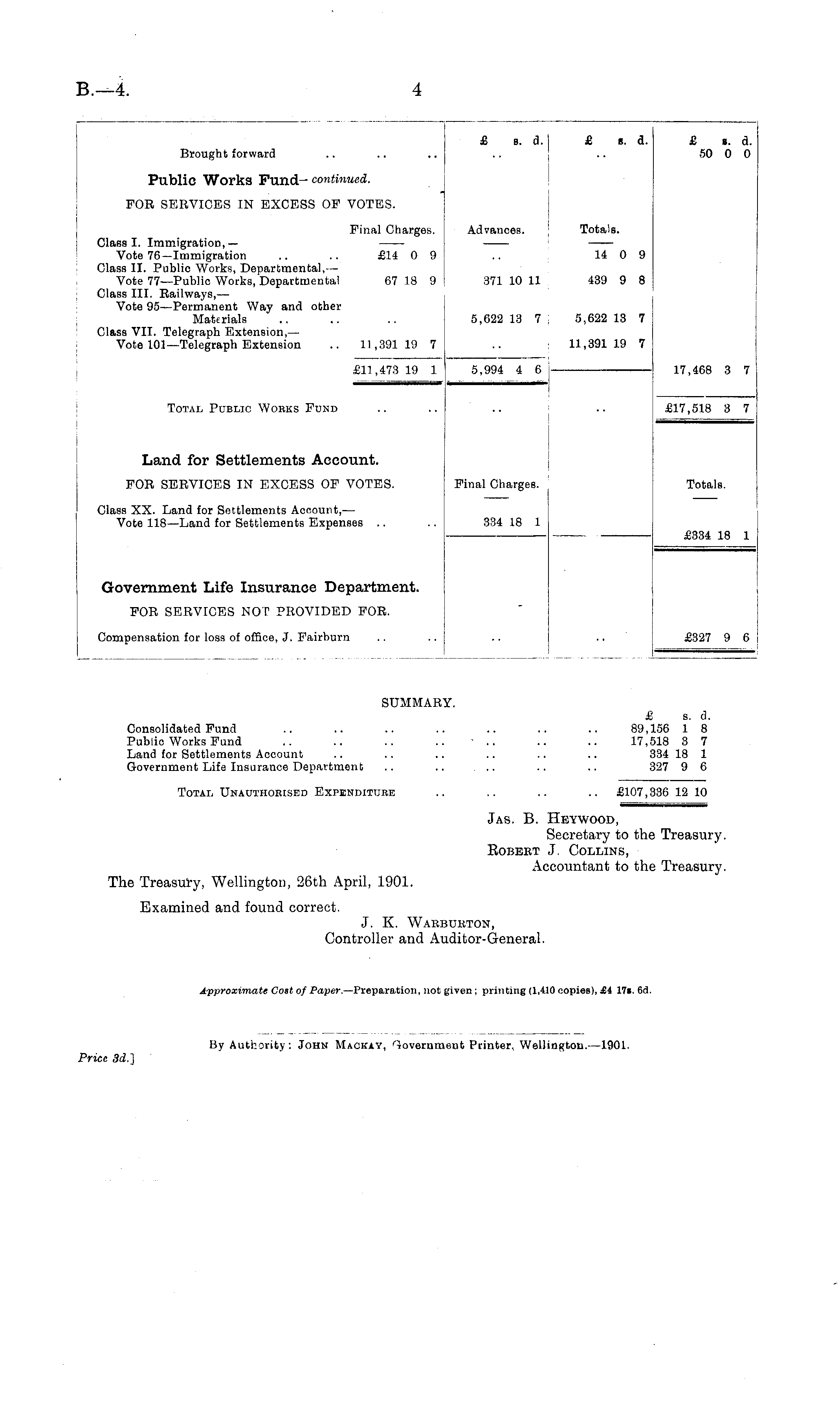 SUMMARY. £ s. d. Consolidated Fund .. .. .. .. .. .. .. 89,156 1 8 Public Works Fund .. .. .. .. - .. .. .. 17,518 3 7 Land for Settlements Account .. .. .. .. .. .. 334 18 1 Government Life Insurance Department .. .. ... .. .. 327 9 6 Total Unauthobised Expenditube .. .. .. .. £107,336 12 10 Jas. B. Heywood, Secretary to the Treasury. Robert J. Collins, Accountant to the Treasury. The Treasury, Wellington, 26th April, 1901. Examined and found correct. J. K. Wabbubton, Controller and Auditor-General. Approximate Cost of Paper. —Preparation, not given; printing (1,410 copies), £& 17«. 6d.