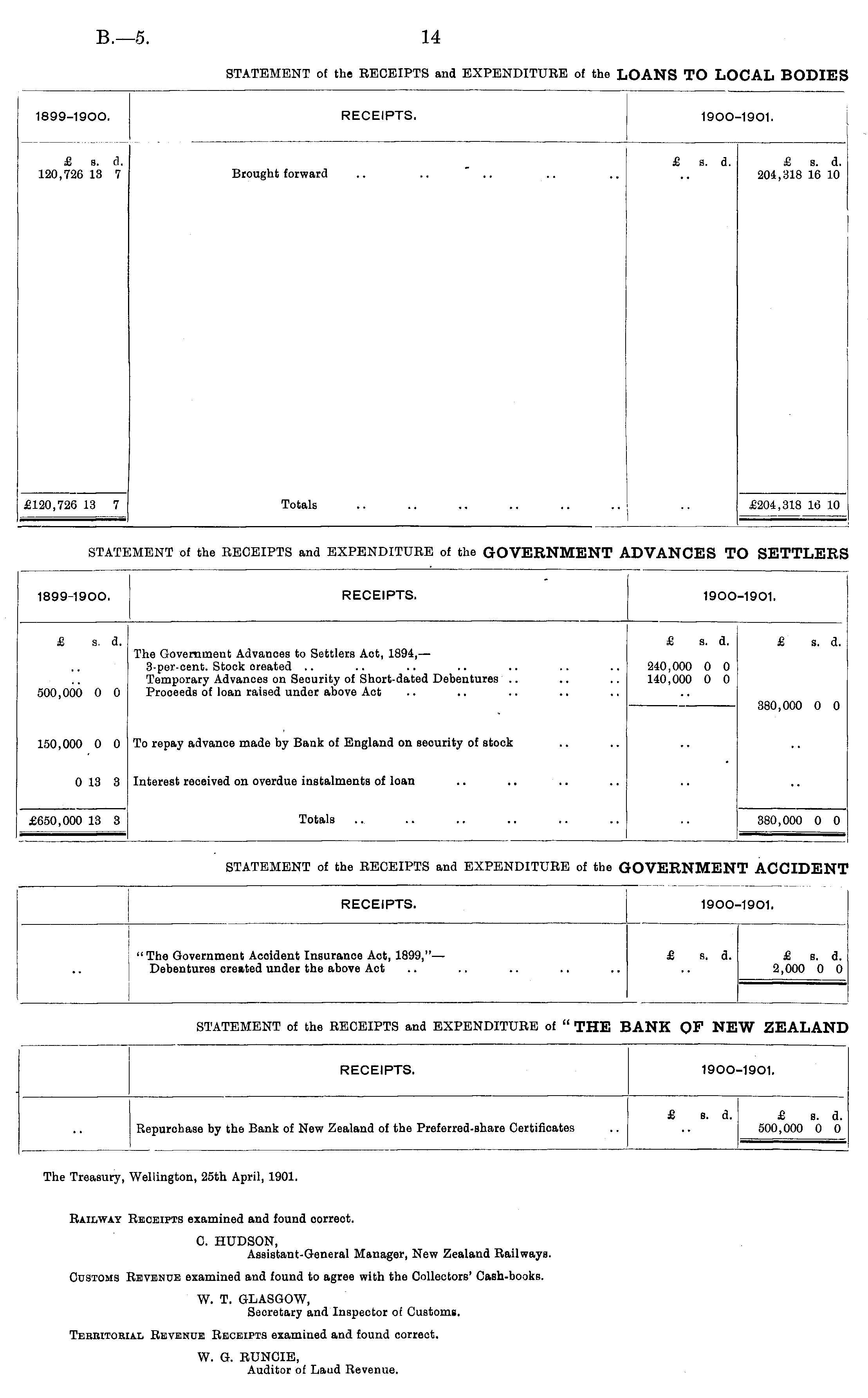 The Treasury, Wellington, 25th April, 1901. Railway Receipts examined and found oorreot. C. HUDSON, Assistant-General Manager, New Zealand Railways. Customs Revenue examined and found to agree with the Collectors' Cash-books. W. T. GLASGOW, Secretary and Inspector oi Customs. Territorial Revenue Receipts examined and found correct. W. G. RUNCIE, Auditor of Laud Revenue.