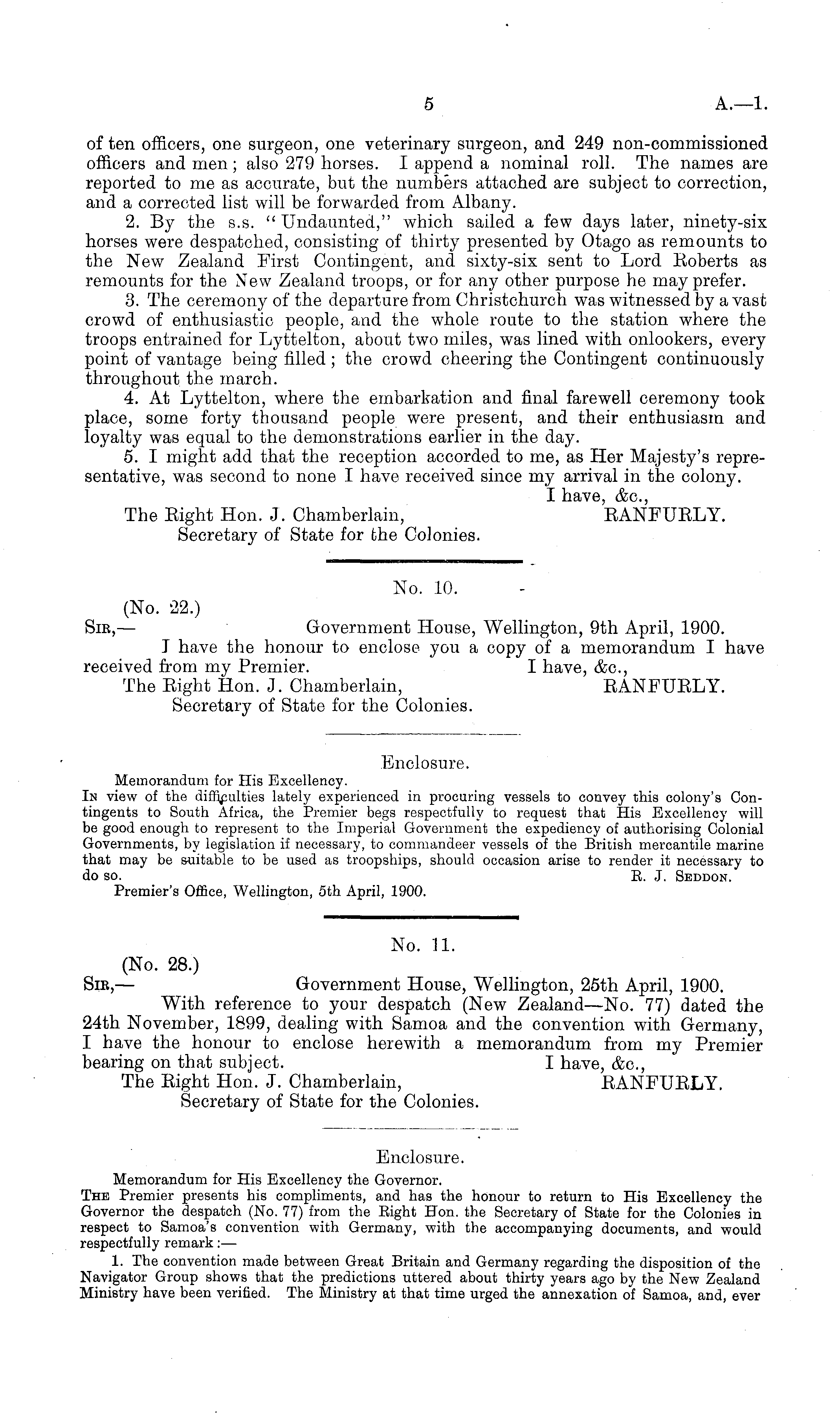 No. 10. (No. 22.) Sic, — Government House, Wellington, 9th April, 1900. I have the honour to enclose you a copy of a memorandum I have received from my Premier. I have, <fee, The Eight Hon. J. Chamberlain, EANFUELY. Secretary of State for the Colonies.