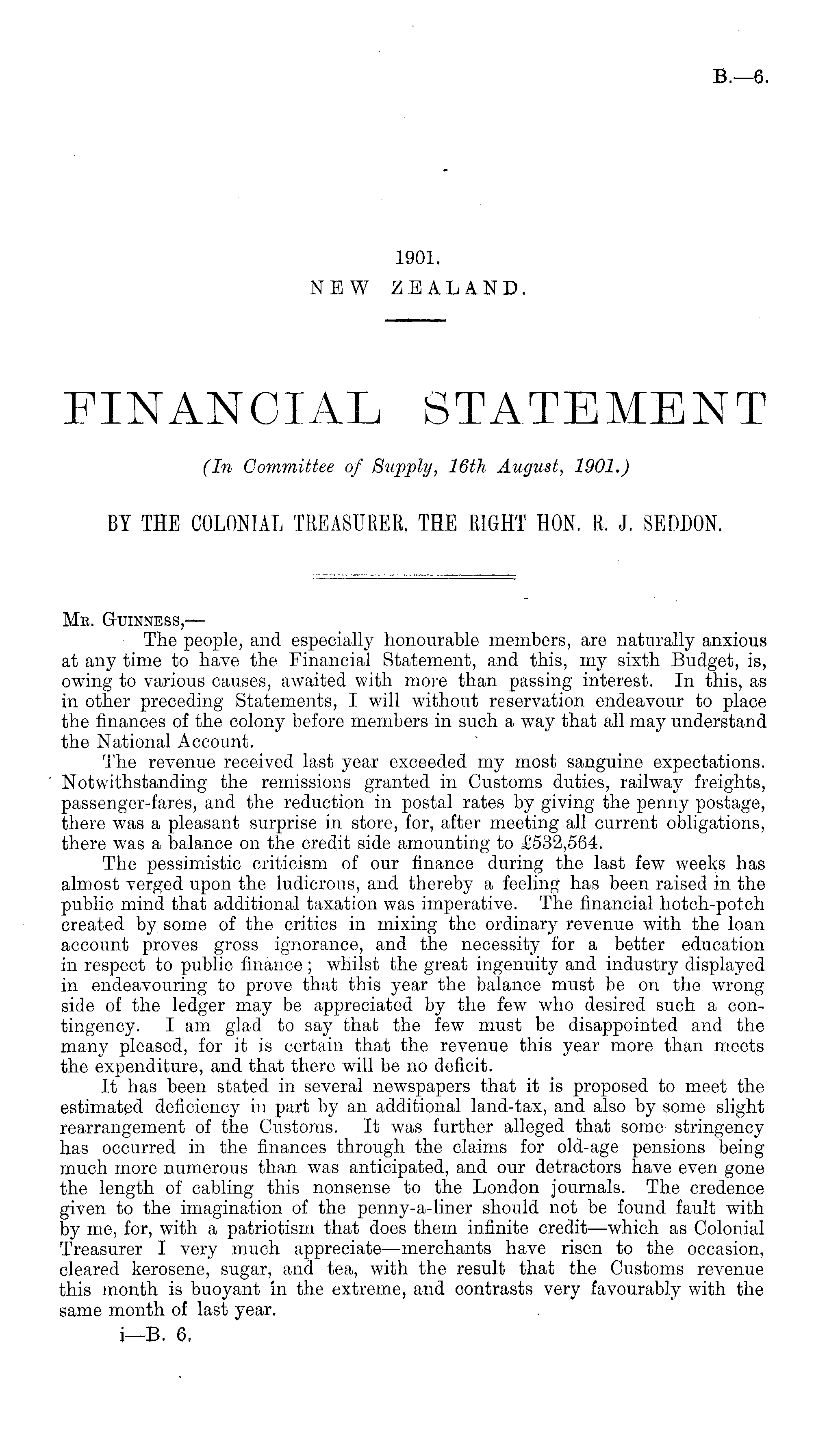 FINANCIAL STATEMENT (In Committee of Supply, 16th August, 1901.) BY THE COLONIAL TREASURER, THE RIGHT HON. R.J. SEDDON.