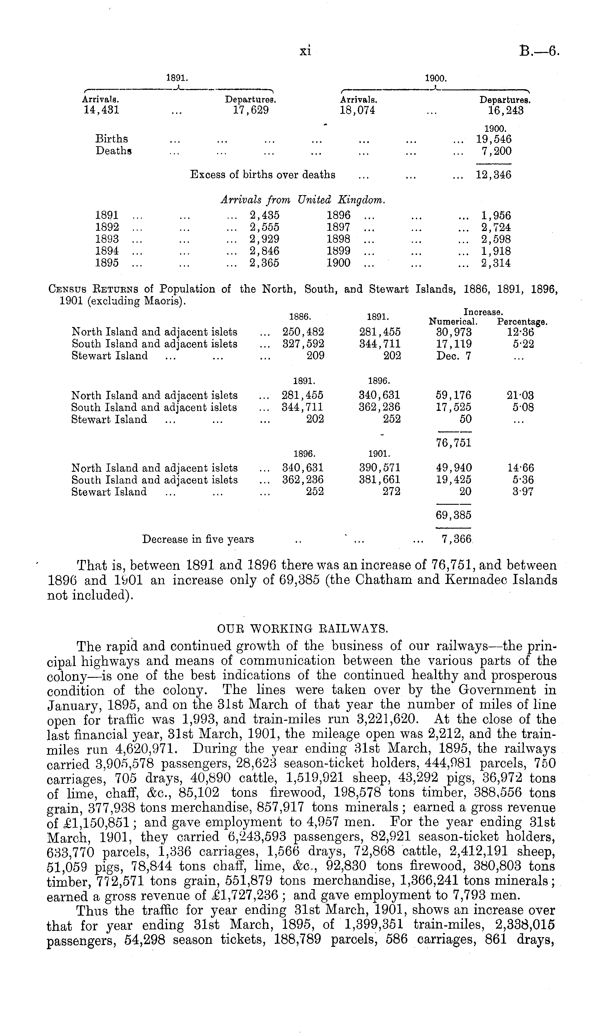 1891. 1900. , 1 , , . , Arrivals. Departures. Arrivals. Departures. 14,431 ... 17,629 18,074 ... 16,243 1900. Births ... ... ... ... ... ... ... 19,546 Deaths ... ... ... ... ... ... ... 7,200 Excess of births over deaths ... ... ... 12,346 Arrivals from United Kingdom. 1891 ... ... ... 2,435 1896 ... ... ... 1,956 1892 ... ... ... 2,555 1897 ... ... ... 2,724 1893 ... ... ... 2,929 1898 ... ... ... 2,598 1894 ... ... ... 2,846 1899 ... ... ... 1,918 1895 ... ... ... 2,365 1900 ... ... ... 2,314 Census Returns of Population of the North, South, and Stewart Islands, 1886, 1891, 1896, 1901 (excluding Maoris). 1886 1891 Increase. Numerical. Percentage. North Island and adjacent islets ... 250,482 281,455 30,973 12-36 South Island and adjacent islets ... 327,592 344,711 17,119 5-22 Stewart Island ... ... ... 209 202 Dec. 7 1891. 1896. North Island and adjacent islets ... 281,455 340,631 59,176 21-03 South Island and adjacent islets ... 344,711 362,236 17,525 soB Stewart Island ... ... ... 202 252 50 76,751 1896. 1901. North Island and adjacent islets ... 340,631 390,571 49,940 14-66 South Island and adjacent islets ... 362,236 381,661 19,425 5-36 Stewart Island ... ... ... 252 272 20 3-97 69,385 Decrease in five years .. "... ... 7,366 That is, between 1891 and 1896 there was an increase of 76,751, and between 1896 and 1901 an increase only of 69,385 (the Chatham and Kermadec Islands not included). OUR WORKING RAILWAYS. The rapid and continued growth of the business of our railways—the principal highways and means of communication between the various parts of the colony—is one of the best indications of the continued healthy and prosperous condition of the colony. The lines were taken over by the Government in January, 1895, and on the 31st March of that year the number of miles of line open for traffic was 1,993, and train-miles run 3,221,620. At the close of the last financial year, 31st March, 1901, the mileage open was 2,212, and the trainmiles run 4,620,971. During the year ending 31st March, 1895, the railways carried 3,905,578 passengers, 28,623 season-ticket holders, 444,981 parcels, 750 carriages, 705 drays, 40,890 cattle, 1,519,921 sheep, 43,292 pigs, 36,972 tons of lime, chaff, &c, 85,102 tons firewood, 198,578 tons timber, 388,556 tons grain, 377,938 tons merchandise, 857,917 tons minerals ; earned a gross revenue of £1,150,851; and gave employment to 4,957 men. For the year ending 31st March, 1901, they carried 6,243,593 passengers, 82,921 season-ticket holders, 633,770 parcels, 1,336 carriages, 1,566 drays, 72,868 cattle, 2,412,191 sheep, 51,059 pigs, 78,844 tons chaff, lime, &c, 92,830 tons firewood, 380,803 tons timber, 772,571 tons grain, 551,879 tons merchandise, 1,366,241 tons minerals; earned a gross revenue of .£1,727,236 ; and gave employment to 7,793 men. Thus the traffic for year ending 31st March, 1901, shows an increase over that for year ending 31st March, 1895, of 1,399,351 train-miles, 2,338,015 passengers, 54,298 season tickets, 188,789 parcels, 586 carriages, 86.1 drays,