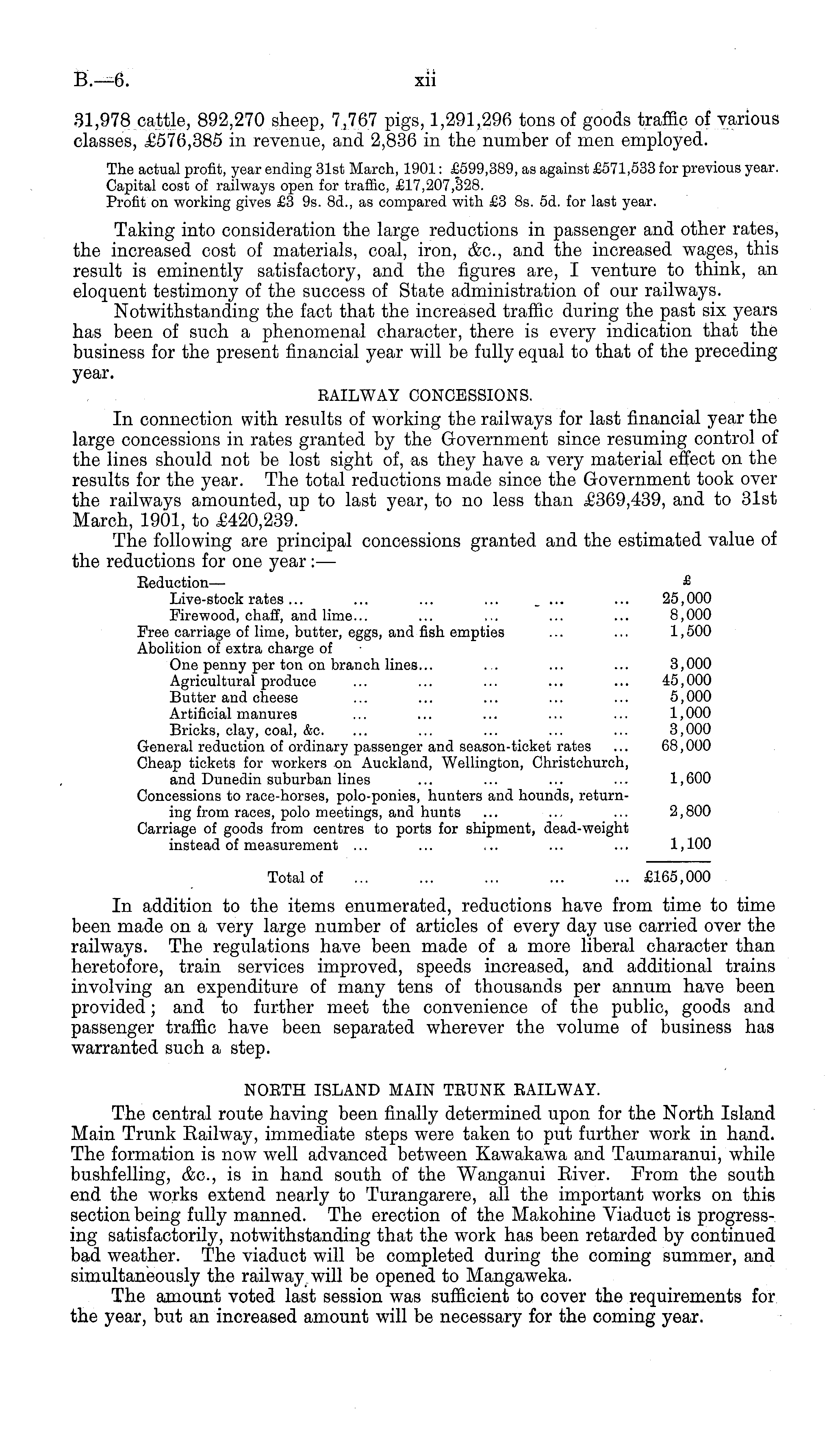 31,978 cattle, 892,270 sheep, 7,767 pigs, 1,291,296 tons of goods traffic of various classes, £576,385 in revenue, and 2,836 in the number of men employed. The actual profit, year ending 31st March, 1901: £599,389, as against £571,533 for previous year. Capital cost of railways open for traffic, £17,207,328. Profit on working gives £3 9s. Bd., as compared with £3 Bs. sd. for last year. Taking into consideration the large reductions in passenger and other rates, the increased cost of materials, coal, iron, &c, and the increased wages, this result is eminently satisfactory, and the figures are, I venture to think, an eloquent testimony of the success of State administration of our railways. Notwithstanding the fact that the increased traffic during the past six years has been of such a phenomenal character, there is every indication that the business for the present financial year will be fully equal to that of the preceding year. RAILWAY CONCESSIONS. In connection with results of working the railways for last financial year the large concessions in rates granted by the Government since resuming control of the lines should not be lost sight of, as they have a very material effect on the results for the year. The total reductions made since the Government took over the railways amounted, up to last year, to no less than £369,439, and to 31st March, 1901, to £420,239. The following are principal concessions granted and the estimated value of the reductions for one year: — Reduction — £ Live-stock rates... ... ... ... ... ... 25,000 Firewood, chaff, and lime... ... ... ... ... 8,000 Free carriage of lime, butter, eggs, and fish empties ... ... 1,500 Abolition of extra charge of One penny per ton on branch lines... ... ... ... 3,000 Agricultural produce ... ... ... ... ... 45,000 Butter and cheese ... ... ... ... ... 5,000 Artificial manures ... ... ... ... ... 1,000 Bricks, clay, coal, &c. ... ... ... ... ... 3,000 General reduction of ordinary passenger and season-ticket rates ... 68,000 Cheap tickets for workers on Auckland, Wellington, Christchurch, and Dunedin suburban lines ... ... ... ... 1,600 Concessions to race-horses, polo-ponies, hunters and hounds, returning from races, polo meetings, and hunts ... ... ... 2,800 Carriage of goods from centres to ports for shipment, dead-weight instead of measurement ... ... ... ... ... 1,100 Total of ... ... ... ... ... £165,000 In addition to the items enumerated, reductions have from time to time been made on a very large number of articles of every day use carried over the railways. The regulations have been made of a more liberal character than heretofore, train services improved, speeds increased, and additional trains involving an expenditure of many tens of thousands per annum have been provided; and to further meet the convenience of the public, goods and passenger traffic have been separated wherever the volume of business has warranted such a step. NORTH ISLAND MAIN TRUNK RAILWAY. The central route having been finally determined upon for the North Island Main Trunk Eailway, immediate steps were taken to put further work in hand. The formation is now well advanced between Kawakawa and Taumaranui, while bushfelling, &c, is in hand south of the Wanganui Biver. From the south end the works extend nearly to Turangarere, all the important works on this section being fully manned. The erection of the Makohine Viaduct is progressing satisfactorily, notwithstanding that the work has been retarded by continued bad weather. The viaduct will be completed during the coming summer, and simultaneously the railway will be opened to Mangaweka. The amount voted last session was sufficient to cover the requirements for the year, but an increased amount will be necessary for the coming year.