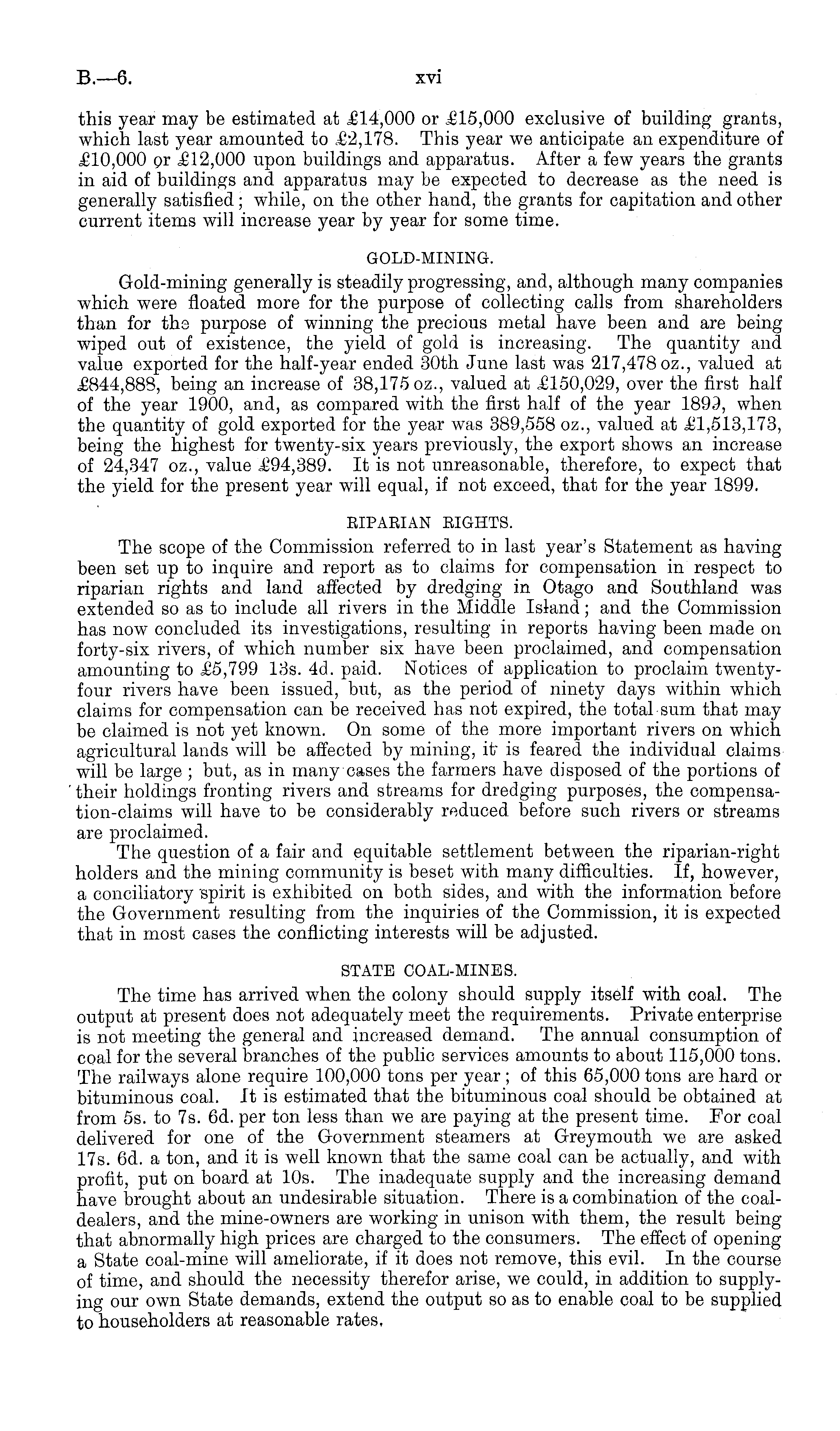 this year may be estimated at £14,000 or £15,000 exclusive of building grants, which last year amounted to £2,178. This year we anticipate an expenditure of £10,000 or £12,000 upon buildings and apparatus. After a few years the grants in aid of buildings and apparatus may be expected to decrease as the need is generally satisfied; while, on the other hand, the grants for capitation and other current items will increase year by year for some time. GOLD-MINING. Gold-mining generally is steadily progressing, and, although many companies which were floated more for the purpose of collecting calls from shareholders than for the purpose of winning the precious metal have been and are being wiped out of existence, the yield of gold is increasing. The quantity and value exported for the half-year ended 30th June last was 217,478 oz., valued at £844,888, being an increase of 38,175 oz., valued at £150,029, over the first half of the year 1900, and, as compared with the first half of the year 189,9, when the quantity of gold exported for the year was 389,558 oz., valued at £1,513,173, being the highest for twenty-six years previously, the export shows an increase of 24,347 oz., value £94,389. It is not unreasonable, therefore, to expect that the yield for the present year will equal, if not exceed, that for the year 1899. RIPARIAN RIGHTS. The scope of the Commission referred to in last year's Statement as having been set up to inquire and report as to claims for compensation in respect to riparian rights and land affected by dredging in Otago and Southland was extended so as to include all rivers in the Middle Island; and the Commission has now concluded its investigations, resulting in reports having been made on forty-six rivers, of which number six have been proclaimed, and compensation amounting to £5,799 13s. 4d. paid. Notices of application to proclaim twentyfour rivers have been issued, but, as the period of ninety days within which claims for compensation can be received has not expired, the total sum that may be claimed is not yet known. On some of the more important rivers on which agricultural lands will be affected by mining, it is feared the individual claims will be large ; but, as in many cases the farmers have disposed of the portions of their holdings fronting rivers and streams for dredging purposes, the compensa-tion-claims will have to be considerably reduced, before such rivers or streams are proclaimed. The question of a fair and equitable settlement between the riparian-right holders and the mining community is beset with many difficulties. If, however, a conciliatory spirit is exhibited on both sides, and with the information before the Government resulting from the inquiries of the Commission, it is expected that in most cases the conflicting interests will be adjusted. STATE COAL-MINES. The time has arrived when the colony should supply itself with coal. The output at present does not adequately meet the requirements. Private enterprise is not meeting the general and increased demand. The annual consumption of coal for the several branches of the public services amounts to about 115,000 tons. The railways alone require 100,000 tons per year ; of this 65,000 tons are hard or bituminous coal. It is estimated that the bituminous coal should be obtained at from ss. to 7s. 6d. per ton less than we are paying at the present time. For coal delivered for one of the Government steamers at Greymouth we are asked 17s. 6d. a ton, and it is well known that the same coal can be actually, and with profit, put on board at 10s. The inadequate supply and the increasing demand have brought about an undesirable situation. There is a combination of the coaldealers, and the mine-owners are working in unison with them, the result being that abnormally high prices are charged to the consumers. The effect of opening a State coal-mine will ameliorate, if it does not remove, this evil. In the course of time, and should the necessity therefor arise, we could, in addition to supplying our own State demands, extend the output so as to enable coal to be supplied to householders at reasonable rates.