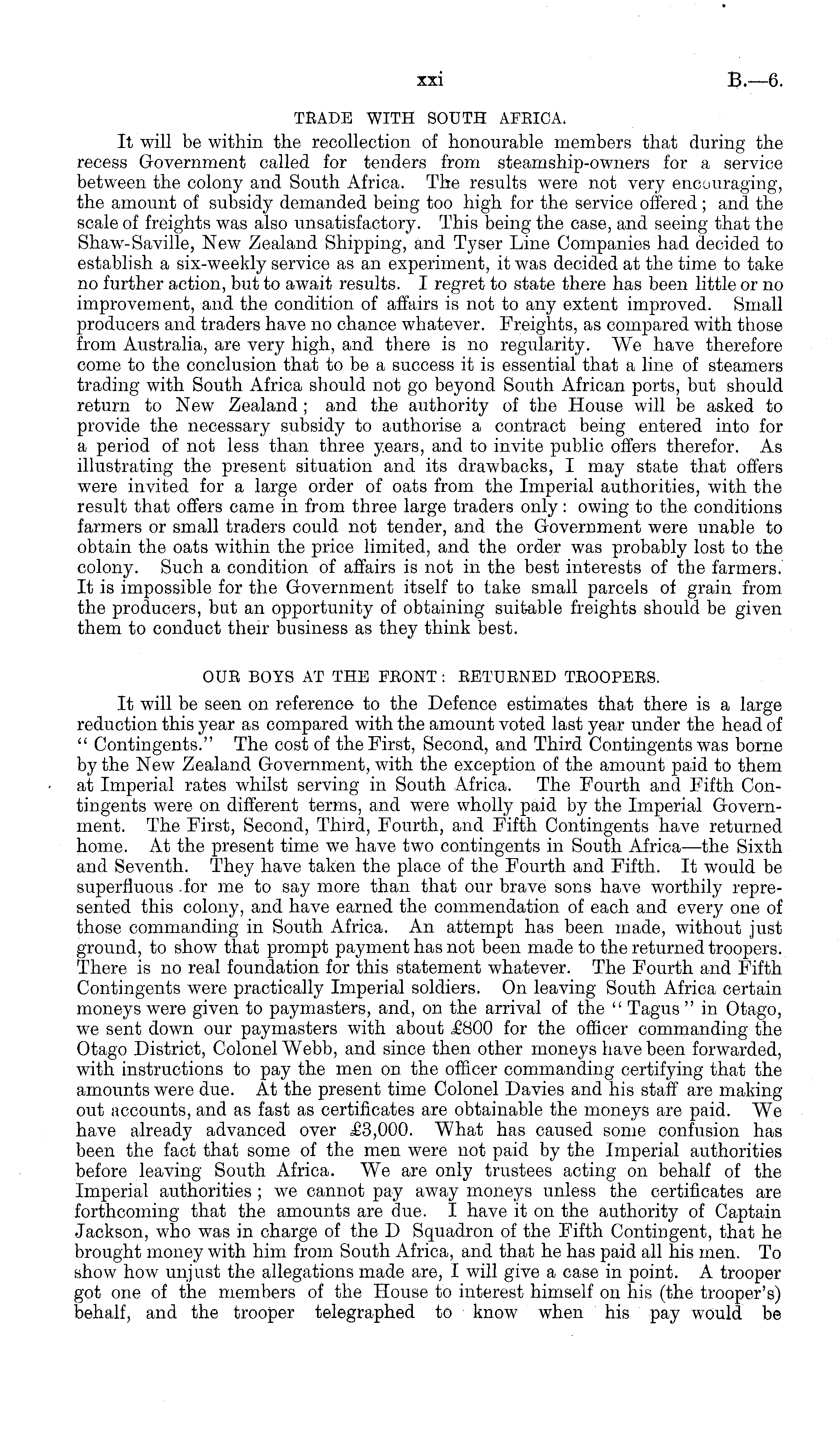 TRADE WITH SOUTH AFRICA. It will be within the recollection of honourable members that during the recess Government called for tenders from steamship-owners for a service between the colony and South Africa. The results were not very encouraging, the amount of subsidy demanded being too high for the service offered; and the scale of freights was also unsatisfactory. This being the case, and seeing that the Shaw-Saville, New Zealand Shipping, and Tyser Line Companies had decided to establish a six-weekly service as an experiment, it was decided at the time to take no further action, but to await results. I regret to state there has been little or no improvement, and the condition of affairs is not to any extent improved. Small producers and traders have no chance whatever. Freights, as compared with those from Australia, are very high, and there is no regularity. We have therefore come to the conclusion that to be a success it is essential that a line of steamers trading with South Africa should not go beyond South African ports, but should return to New Zealand; and the authority of the House will be asked to provide the necessary subsidy to authorise a contract being entered into for a period of not less than three years, and to invite public offers therefor. As illustrating the present situation and its drawbacks, I may state that offers were invited for a large order of oats from the Imperial authorities, with the result that offers came in from three large traders only : owing to the conditions farmers or small traders could not tender, and the Government were unable to obtain the oats within the price limited, and the order was probably lost to the colony. Such a condition of affairs is not in the best interests of the farmers. It is impossible for the Government itself to take small parcels of grain from the producers, but an opportunity of obtaining suitable freights should be given them to conduct their business as they think best. OUR BOYS AT THE FRONT : RETURNED TROOPERS. It will be seen on reference to the Defence estimates that there is a large reduction this year as compared with the amount voted last year under the head of " Contingents." The cost of the First, Second, and Third Contingents was borne by the New Zealand Government, with the exception of the amount paid to them at Imperial rates whilst serving in South Africa. The Fourth and Fifth Contingents were on different terms, and were wholly paid by the Imperial Government. The First, Second, Third, Fourth, and Fifth Contingents have returned home. At the present time we have tw r o contingents in South Africa—the Sixth and Seventh. They have taken the place of the Fourth and Fifth. It would be superfluous .for me to say more than that our brave sons have worthily represented this colony, and have earned the commendation of each and every one of those commanding in South Africa. An attempt has been made, without just ground, to show tbat prompt payment has not been made to the returned troopers. There is no real foundation for this statement whatever. The Fourth and Fifth Contingents were practically Imperial soldiers. On leaving South Africa certain moneys were given to paymasters, and, on the arrival of the " Tagus " in Otago, we sent dowm our paymasters with about £800 for the officer commanding the Otago District, Colonel Webb, and since then other moneys have been forwarded, with instructions to pay the men on the officer commanding certifying that the amounts were due. At the present time Colonel Davies and his staff are making out accounts, and as fast as certificates are obtainable the moneys are paid. We have already advanced over £3,000. What has caused some confusion has been the fact that some of the men were not paid by the Imperial authorities before leaving South Africa. We are only trustees acting on behalf of the Imperial authorities ; we cannot pay away moneys unless the certificates are forthcoming that the amounts are due. I have it on the authority of Captain Jackson, who was in charge of the D Squadron of the Fifth Contingent, that he brought money wdth him from South Africa, and that he has paid all his men. To show how unjust the allegations made are, I wdll give a case in point. A trooper got one of the members of the House to interest himself on his (the trooper's) behalf, and the trooper telegraphed to know when his pay would be