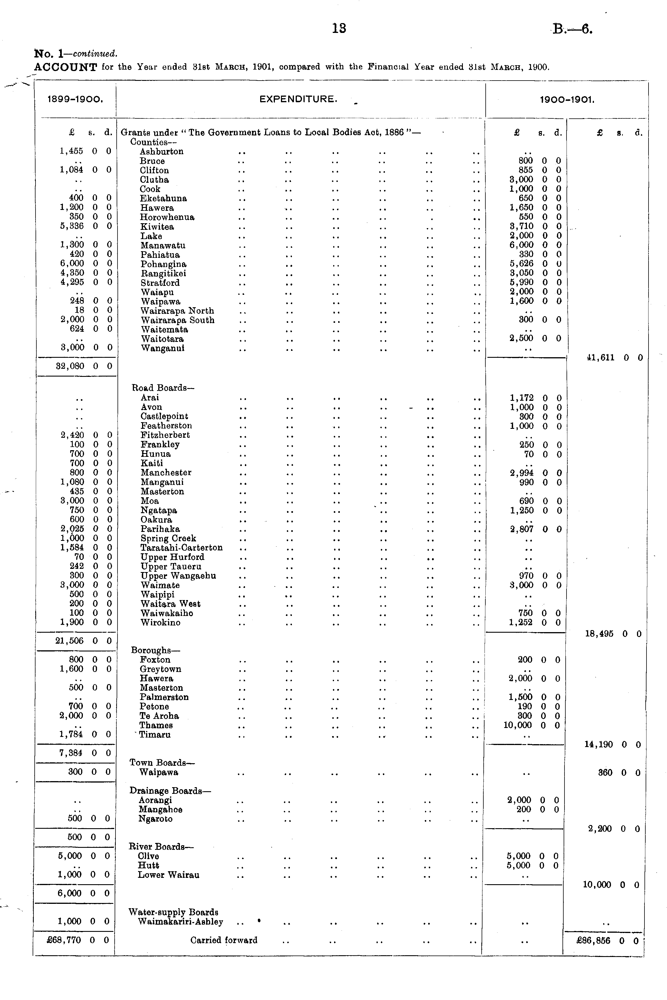 iOO- £ s. d. 1,455 0 0 1,084 0 0 400 0 0 1,200 0 0 350 0 0 5,336 0 0 1,300 0 0 420 0 0 6,000 0 0 4,350 0 0 4,295 0 0 Grants under " The Government Loans to Local Bodies Aot, 1886 " — Counties— Ashburton Bruce Clifton Clutha Cook Eketahuna Hawera Horowhenua Kiwitea Lake Manawatu Pahiatua Pohangina Rangitikei Stratford Waiapu Waipawa Wairarapa North Wairarapa South Waitemata Waitotara Wanganui £ s. d. 800 0 0 855 0 0 3,000 0 0 1,000 0 0 650 0 0 1,650 0 0 550 0 0 3,710 0 0 2,000 0 0 6,000 0 0 330 0 0 5,626 0 0 3,050 0 0 5,990 0 0 2,000 0 0 1,600 0 0 £ 8. d 248 0 0 18 0 0 2,000 0 0 624 0 0 300 0 0 3,000 0 0 2,500 0 0 41,611 0 32,080 0 0 2,420 0 0 100 0 0 700 0 0 700 0 0 800 0 0 1,080 0 0 435 0 0 3,000 0 0 750 0 0 600 0 0 2,025 0 0 1,000 0 0 1,584 0 0 70 0 0 242 0 0 300 0 0 3,000 0 0 500 0 0 200 0 0 100 0 0 1,900 0 0 Road Boards— Arai Avon Castlepoint Featherston Fitzherbert Frankley Hunua Kaiti Manchester Manganui Masterton Moa Ngatapa .. .. .. Oakura Parihaka Spring Creek Taratahi-Carterton Upper Hurford Upper Taueru Upper Wangaehu Waimate .. Waipipi Waitara West Waiwakaiho Wirokino 1,172 0 0 1,000 0 0 300 0 0 1,000 0 0 250 0 0 70 0 0 2,994 0 0 990 0 0 690 0 0 1,250 0 0 2,807 0 0 970 0 0 3,000 0 0 750 0 0 1,252 0 0 21,506 0 0 Boroughs— Foxton Greytown Hawera Masterton Palmerston Petone Te Aroha Thames Timaru 18,495 0 0 800 0 0 1,600 0 0 200 0 0 2,000 0 0 500 0 0 700 0 0 2,000 0 0 1,500 0 0 190 0 0 300 0 0 10,000 0 0 1,784 0 0 7,384 0 0 Town Boards— Waipawa 14,190 0 0 300 0 0 360 0 0 500 0 0 Drainage Boards— Aorangi Mangahoe Ngaroto 2,000 0 0 200 0 0 2,200 0 0 5,000 0 0 500 0 0 River Boards— Clive Hutt Lower Wairau 5,000 0 0 5,000 0 0 10,000 0 0 1,000 0 0 6,000 0 0 Water-supply Boards Waimakariri-Ashley .. • 1,000 0 0 £68,770 0 0 Carried forward £86,856 0 0