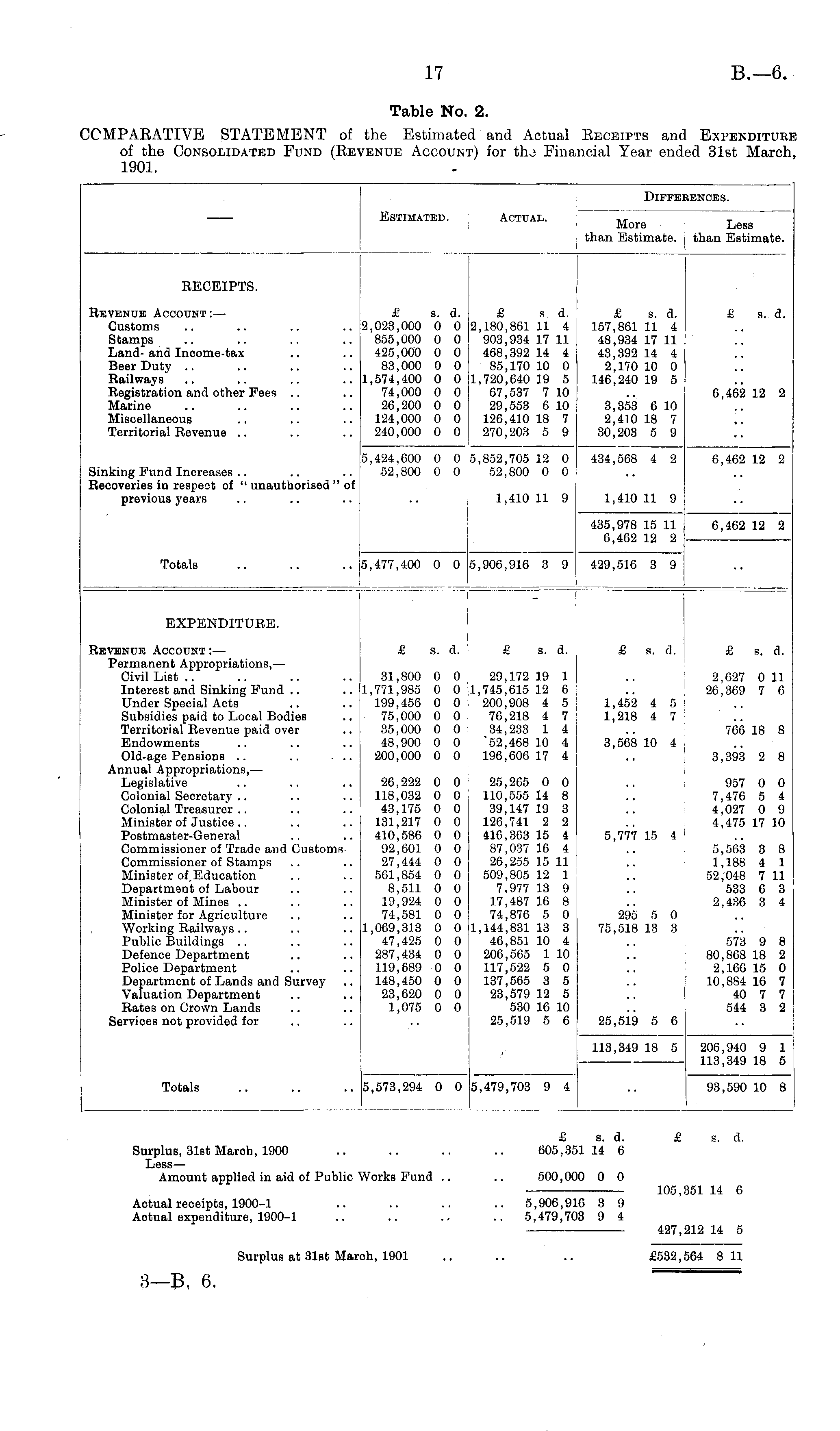 £ s. d. £ s. d. Surplus, 31st March, 1900 .. .. .. .. 605,351 14 0 Less— Amount applied in aid of Public Works Fund .. .. 500,000 0 0 105,351 14 6 Actual receipts, 1900-1 .. .. .. .. 5,906,916 3 9 Actual expenditure, 1900-1 .. .. .. .. 5,479,703 9 4 427,212 14 5 Surplus at 31st March, 1901 .. .. .. £532,564 8 11 3—B, 6.