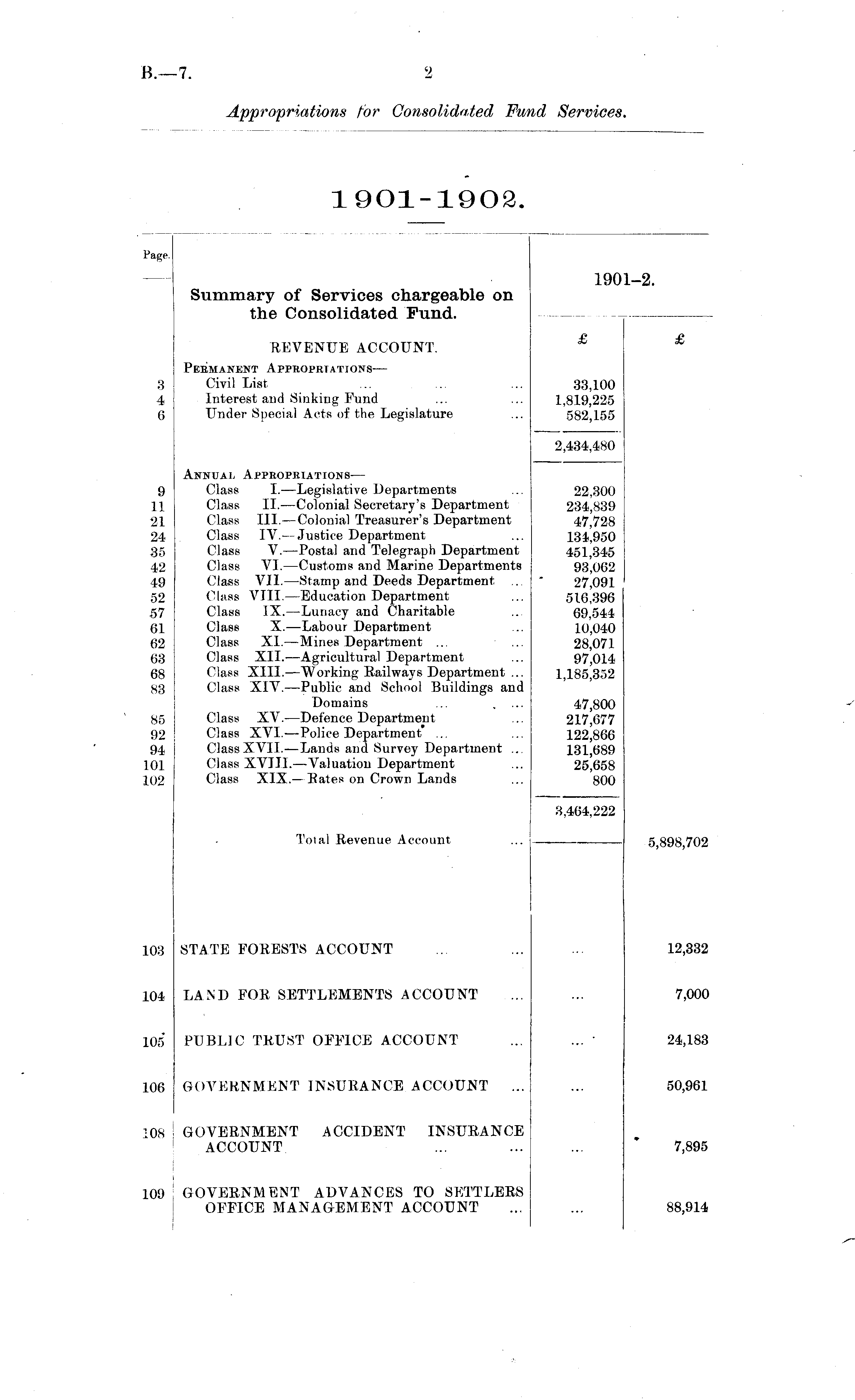 ■age. Summary of Services chargeable on the Consolidated Fund. 1901-2. REVENUE ACCOUNT. £ £ 3 6 Permanent AppROPRrA/rroNS— Civil List Interest and Sinking Fund Under Special Acts of the Legislature 33,100 1,819,225 582,155 Annual Appropriations— Class I. —Legislative Departments Class II. —Colonial Secretary's Department Class III. —Colonial Treasurer's Department Class IV.— Justice Department Class V.—Postal and Telegraph Department Class VI. —Customs and Marine Departments Class VII. —Si amp and Deeds Department Class VIII.—Education Department Class IX. —Lunacy and Charitable Class X.—Labour Department Class XI.—Mines Department ... Class XII.—Agricultural Department Class XIII. —Working Railways Department ... Class XIV. —Public and School Buildings and Domains Class XV. —Defence Department Class XVI.—Police Department ... ClassXV11.—Lands and Survey Department ... Class XVIII.—Valuation Department Class XIX.—Rates on Crown Lands 2,434,480 9 11 21 24 35 42 49 52 57 61 62 63 68 83 22,300 234,839 47,728 134,950 451,345 93,002 27,091 516,396 69,544 10,040 28,071 97,014 1,185,352 85 92 94 101 102 47,800 217,677 122,866 131,689 25,658 800 5,898,702 8,464,222 Total Revenue Account STATE FORESTS ACCOUNT 12,332 03 LAND FOR SETTLEMENTS ACCOUNT 7,000 .04 05 PUBLIC TRUST OFFICE ACCOUNT 24,183 06 GOVERNMENT INSURANCE ACCOUNT 50,961 108 GOVERNMENT ACCIDENT INSURANCE ACCOUNT 7,895 .09 GOVERNMENT ADVANCES TO SETTLERS OFFICE MANAGEMENT ACCOUNT 88,914