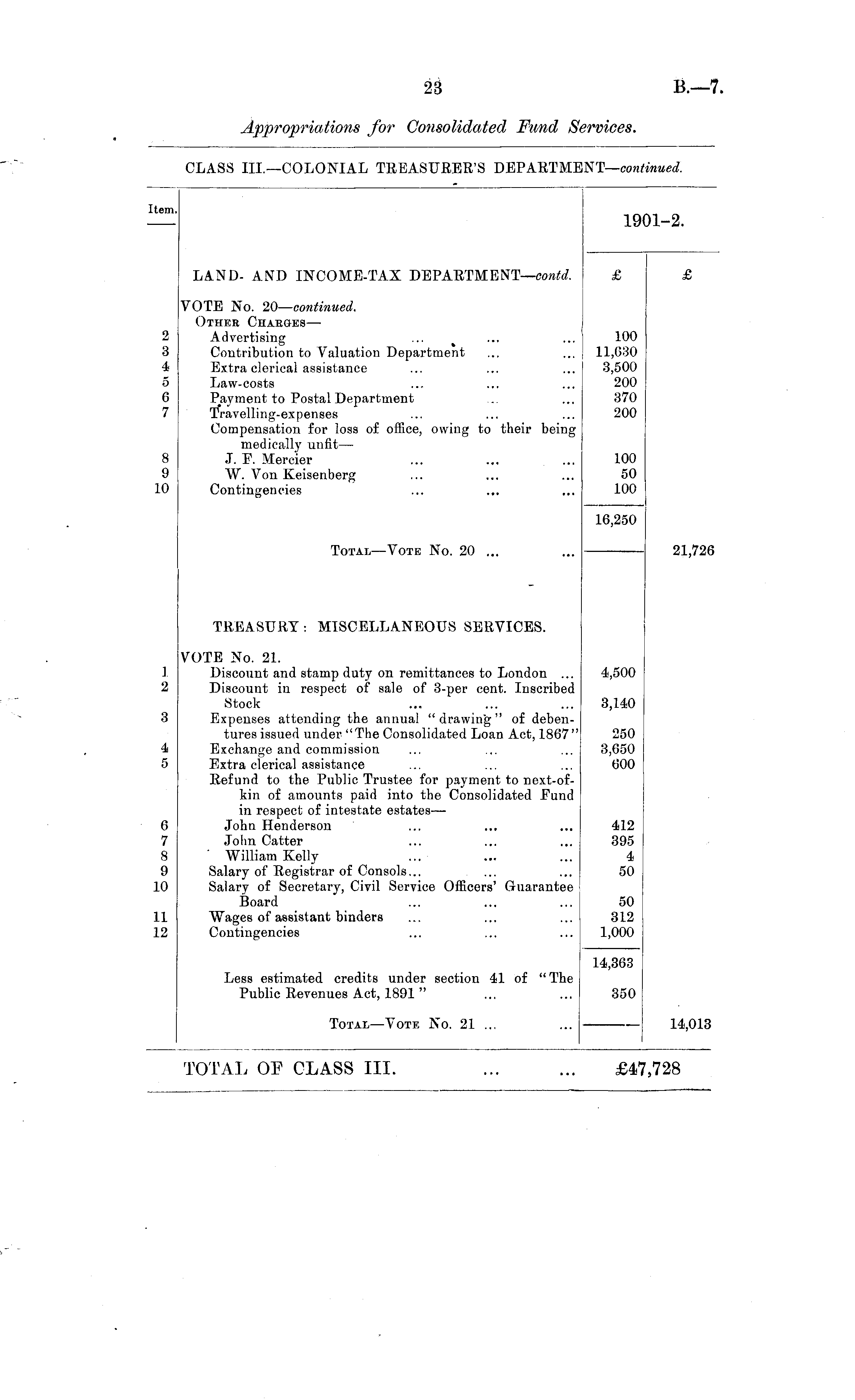 .tern. 19 1-2. LAND- AND INCOME-TAX DEPARTMENT— contd. £ 2 8 4 5 6 7 VOTE No. 20— continued. Other Charges— Advertising Contribution to Valuation Department Extra clerical assistance Law-costs Pjiyment to Postal Department Travelling-expenses Compensation for loss of office, owing to their being medically unfit — J. F. Mercier W. Von Keisenberg Contingencies 100 11,630 3,500 200 370 200 8 9 10 100 50 100 Total—Vote No. 20 ... 16,250 21,72 TREASURY : MISCELLANEOUS SERVICES. 1 2 3 4 5 VOTE No. 21. Discount and stamp duty on remittances to London ... Discount in respect of sale of 3-per cent. Inscribed Stock Expenses attending the annual "drawing" of debentures issued under "The Consolidated Loan Act, 1867" Exchange and commission Extra clerical assistance Refund to the Public Trustee for payment to next-of-kin of amounts paid into the Consolidated Fund in respect of intestate estates — John Henderson John Catter ' William Kelly Salary of Registrar of Consols... Salary of Secretary, Civil Service Officers' Guarantee Board Wages of assistant binders Contingencies 4,500 3,140 250 3,650 600 412 395 4 50 8 7 8 9 10 11 12 50 312 1,000 Less estimated credits under section 41 of " The Public Revenues Act, 1891 " 14,363 350 Total —Vote No. 21 ... 14,013 TOTAL OE CLASS III. £47,728