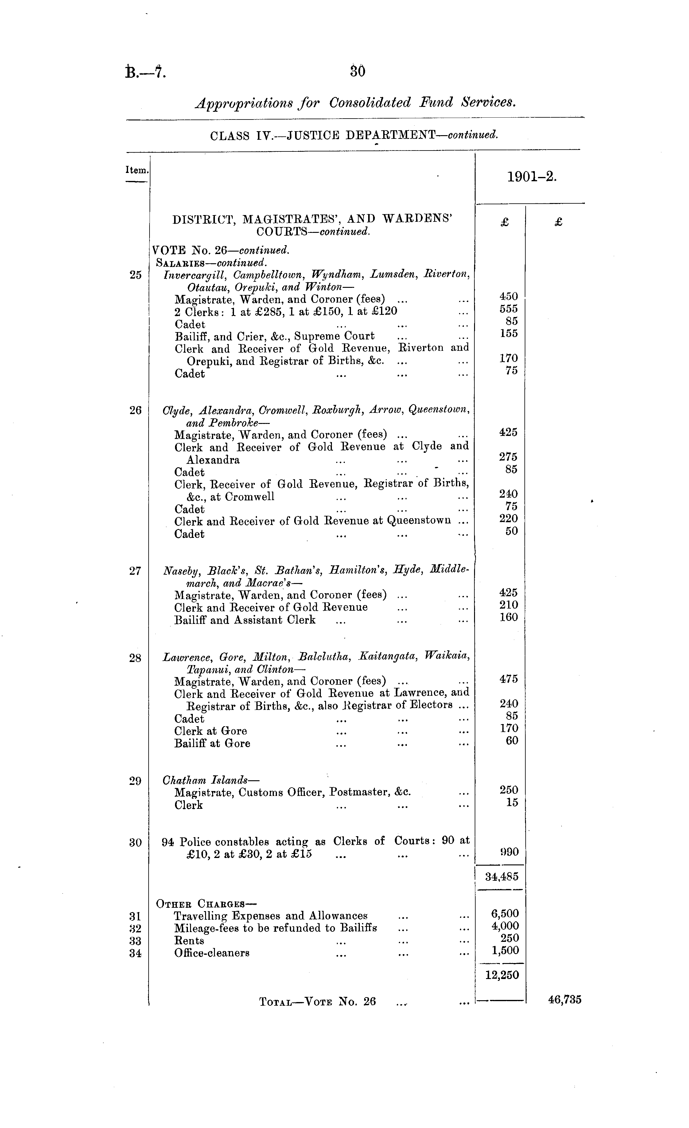 tern. 19 1-2. DISTRICT, MAGISTRATES', AND WARDENS' COURTS— continued. 25 VOTE No. 26— continued. Salariks — continued. Invercargill, Campbelltown, Wyndham, Lumsden, Biverton, Otautau, Orepuki, and Winton — Magistrate, Warden, and Coroner (fees) ... 2 Clerks: 1 at £285, 1 at £150, 1 at £120 Cadet Bailiff, and Crier, &c, Supreme Court Clerk and Receiver of Gold Revenue, Riverton and Orepuki, and Registrar of Births, &c. ... Cadet 450 555 85 155 170 75 20 Glyde, Alexandra, Cromwell, Roxburgh, Arrow, Queenstown, and Pembroke — Magistrate, Warden, and Coroner (fees) ... Clerk and Receiver of Gold Revenue at Clyde and Alexandra Cadet Clerk, Receiver of Gold Revenue, Registrar of Births, &c, at Cromwell Cadet Clerk and Receiver of Gold Revenue at Queenstown ... Cadet 425 275 85 240 75 220 50 27 Naseby, Blade's, St. Bathan's, Hamilton's, Hyde, Middlemarch, and Macrae's — Magistrate, Warden, and Coroner (fees) ... Clerk and Receiver of Gold Revenue Bailiff and Assistant Clerk 425 210 160 28 Lawrence, Gore, Milton, Balclutha, Kaitangatu, Waikaia, Tapanui, and Clinton — Magistrate, Warden, and Coroner (fees) ... Clerk and Receiver of Gold Revenue at Lawrence, and Registrar of Births, &c, also .Registrar of Electors ... Cadet Clerk at Gore Bailiff at Gore 475 240 85 170 60 l>0 Chatham Islands — Magistrate, Customs Officer, Postmaster, &c. Clerk 250 15 80 94 Police constables acting as Clerks of Courts: 90 at £10, 2 at £30, 2 at £15 990 I 34,485 :si :j2 33 Othee Chabges— Travelling Expenses and Allowances Mileage-fees to be refunded to Bailiffs Rents Office-cleaners 6,500 4,000 250 1,500 Total—Vote No. 26 12,250 46,735