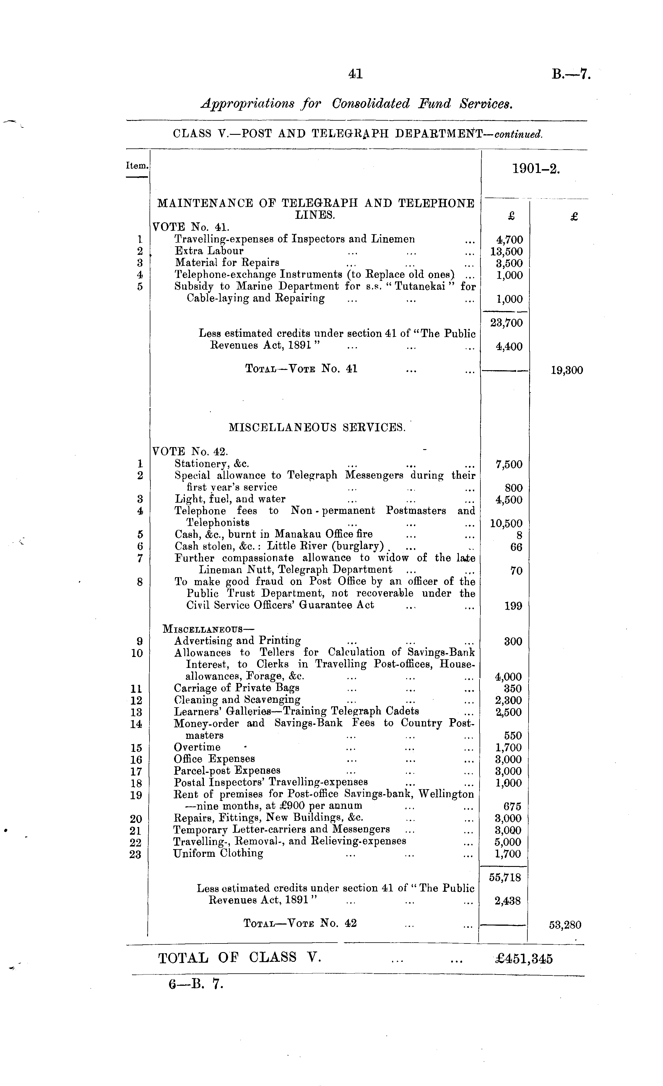 .tern. 19( 1-2. MAINTENANCE OF TELEGRAPH AND TELEPHONE LINES. £ £ 1 2 3 1 5 VOTE No. 41. Travelling-expenses of Inspectors and Linemen , Extra Labour Material for Repairs Telephone-exchange Instruments (to Replace old ones) ... Subsidy to Marine Department for s.s. " Tutanekai " for Cable-laying and Repairing 4,700 13,500 3,500 1,000 1,000 Less estimated credits under section 41 of "The Public Revenues Act, 1891 " 23,700 4,400 Total—Vote No. 41 19,300 MISCELLANEOUS SERVICES. 1 2 3 4 5 t; 7 VOTE No. 42. Stationery, &c. Special allowance to Telegraph Messengers during their first vear's service Light, fuel, and water Telephone fees to Non - permanent Postmasters and Telephonists Cash, &c, burnt in Manakau Office fire Cash stolen, &c.: Little River (burglary) Further compassionate allowance to widow of the late Lineman Nutt, Telegraph Department To make good fraud on Post Office by an officer of the Public Trust Department, not recoverable under the Civil Service Officers' Guarantee Act 7,500 800 4,500 10,500 8 66 8 70 199 11 12 13 14 15 16 17 18 19 9 10 Miscellaneous — Advertising and Printing Allowances to Tellers for Calculation of Savings-Bank Interest, to Clerks in Travelling Post-offices, Houseallowances, Forage, &c. Carriage of Private Bags Cleaning and Scavenging Learners' Galleries —Training Telegraph Cadets Money-order and Savings-Bank Fees to Country Postmasters Overtime Office Expenses Parcel-post Expenses Postal Inspectors' Travelling-expenses Rent of premises for Post-office Savings-bank, Wellington —nine months, at £900 per annum Repairs, Fittings, New Buildings, &c. Temporary Letter-carriers and Messengers Travelling-, Removal-, and Relieving-expenses Uniform Clothing 300 4,000 350 2,300 2,500 550 1,700 3,000 3,000 1,000 20 21 22 23 675 3,000 3,0Q0 5,000 1,700 Less estimated credits under section 41 of " The Public Revenues Act, 1891" 55,718 2,438 Total —Vote No. 42 53,280 TOTAL OF CLASS V. £451,345