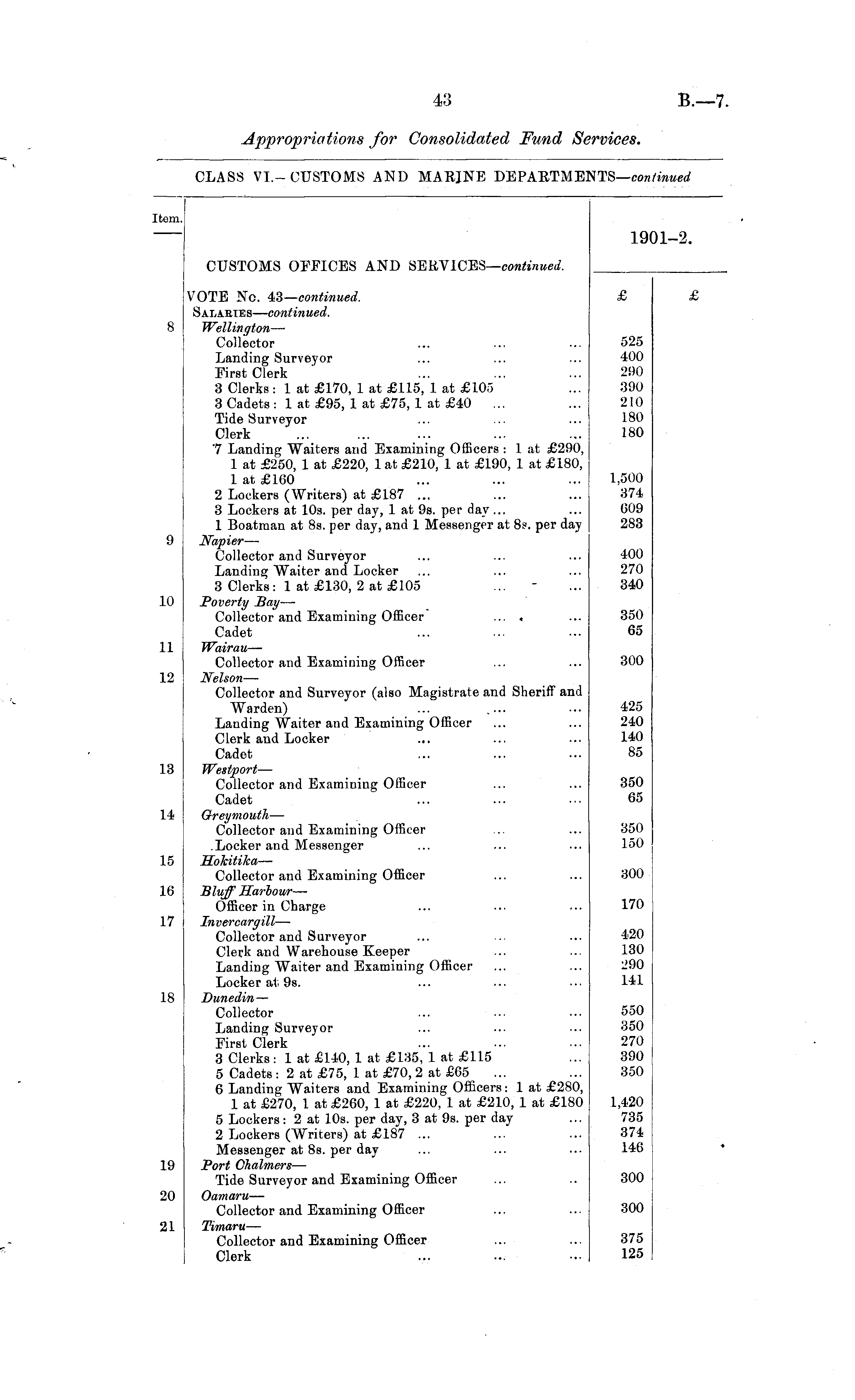 :tem. 19 1-2. CUSTOMS OFFICES AND SERVICES—continued. VOTE No. 43— continued. Salaries— continued. Wellington — Collector Landing Surveyor First Clerk 3 Clerks: 1 at £170, 1 at £115, 1 at £105 3 Cadets : 1 at £95, 1 at £75, 1 at £40 ... Tide Surveyor Clerk '7 Landing Waiters and Examining Officers : 1 at £290, 1 at £250, 1 at £220, 1 at £210, 1 at £190, 1 at £180, 1 at £160 2 Lockers (Writers) at £187 ... 3 Lockers at 10s. per day, 1 at 9s. per day ... 1 Boatman at 8s. per day, and 1 Messenger at 8?. per day Napier- —• Collector and Surveyor Landing Waiter and Locker 3 Clerks: 1 at £130, 2 at £105 Poverty Bay — Collector and Examining Officer .... Cadet Wairau — Collector and Examining Officer Nelson — Collector and Surveyor (also Magistrate and Sheriff and Warden) Landing Waiter and Examining Officer Clerk and Locker Cadet Westport — Collector and Examining Officer Cadet £ 525 400 290 390 210 180 180 1,500 374 609 283 400 270 340 L0 350 65 11 300 12 425 240 140 85 18 350 65 14 15 Iβ 17 18 Qreymouth — Collector and Examining Officer .Locker and Messenger Hokitika —■ Collector and Examining Officer Bluff Harbour— Officer in Charge Invercargill — Collector and Surveyor Clerk and Warehouse Keeper Landing Waiter and Examining Officer Locker at, 9s. Dunedin — Collector Landing Surveyor First Clerk 3 Clerks: 1 at £140, 1 at £135, 1 at £115 5 Cadets: 2 at £75, 1 at £70,2 at £65 6 Landing Waiters and Examining Officers: 1 at £280, 1 at £270, 1 at £260, 1 at £220, 1 at £210, 1 at £180 5 Lockers: 2 at 10s. per day, 3 at 9s. per day 2 Lockers (Writers) at £187 ... Messenger at 8s. per day Port Chalmers — Tide Surveyor and Examining Officer 350 150 300 170 420 130 290 141 550 350 270 390 350 1,420 735 374 146 19 300 20 Oamaru — Collector and Examining Officer 300 21 Timaru — Collector and Examining Officer 375 125 Clerk