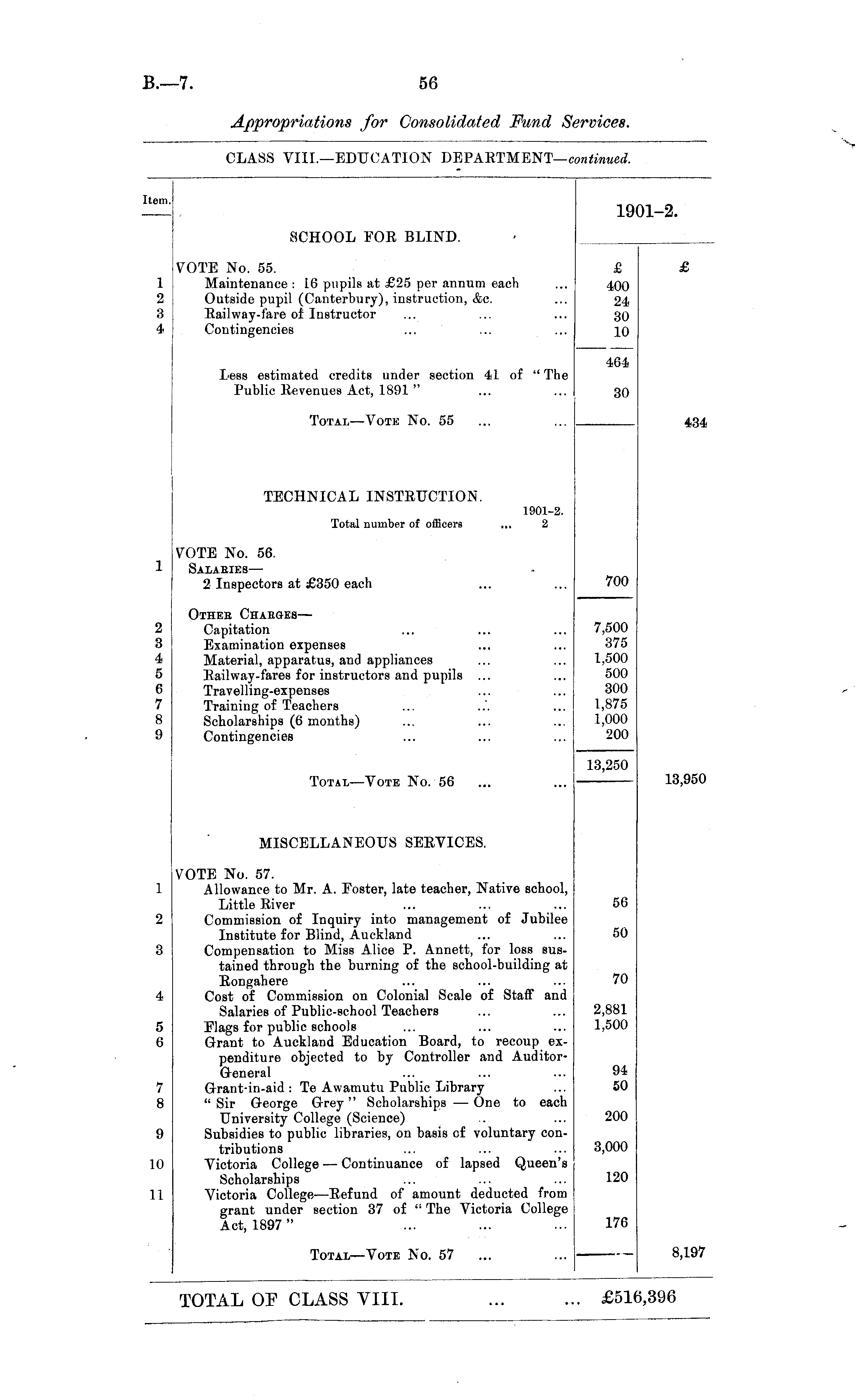 tern. 19 H-2. SCHOOL FOE BLIND. 1 2 3 4 VOTE No. 55. Maintenance : 16 pupils at £25 per annum each Outside pupil (Canterbury), instruction, &c. Eailway-fare of Instructor Contingencies £ 400 24 30 10 Less estimated credits under section 41 of " The Public Eevenues Act, 1891 " 464 30 Total —Vote No. 55 434 TECHNICAL INSTRUCTION. 1901-2. Total number of officers ,., 2 VOTE No. 56. Salabies — 2 Inspectors at £350 each 700 2 8 4 5 6 7 8 9 Otheb Chabges— Capitation Examination expenses Material, apparatus, and appliances Bailway-fares for instructors and pupils Travelling-expenses Training of Teachers Scholarships (6 months) Contingencies 7,500 375 1,500 500 300 1,875 1,000 200 Total—Vote No. 56 13,250 13,950 MISCELLANEOUS SEEVICES. 1 2 3 4 5 G VOTE No. 57. Allowance to Mr. A. Foster, late teacher, Native school, Little River Commission of Inquiry into management of Jubilee Institute for Blind, Auckland Compensation to Miss Alice P. Annett, for loss sustained through the burning of the school-building at Bongahere Cost of Commission on Colonial Scale of Staff and Salaries of Public-school Teachers Flags for public schools Grant to Auckland Education Board, to recoup expenditure objected to by Controller and AuditorGeneral G-rant-in-aid : Te Awamutu Public Library " Sir George Grey" Scholarships — One to each University College (Science) Subsidies to public libraries, on basis of voluntary contributions Victoria College — Continuance of lapsed Queen's Scholarships Victoria College —Refund of amount deducted from grant under section 37 of " The Victoria College Act, 1897" 56 50 70 2,881 1,500 94 50 7 8 200 e 3,000 10 120 ii 176 Total —Vote No. 57 8,197 TOTAL OF CLASS VIII. £51 3,396