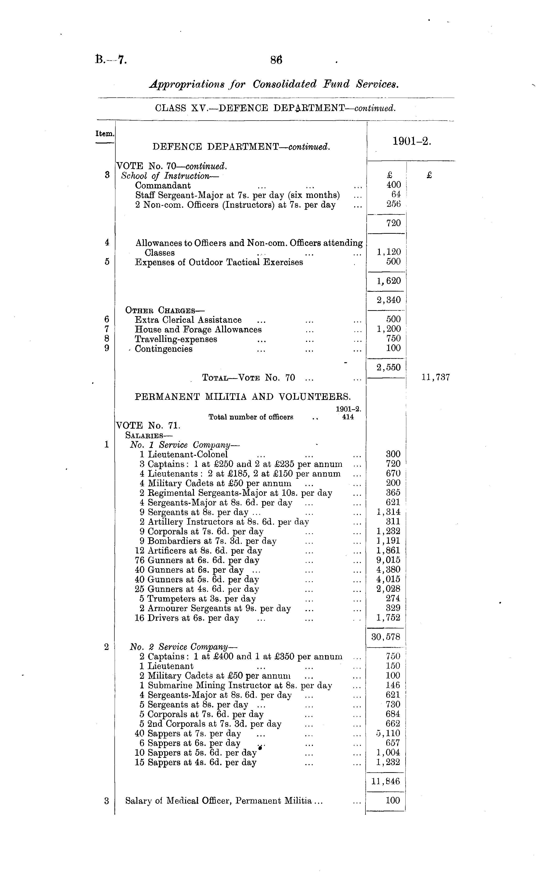 item. 1901-2. DEFENCE DEPARTMENT— continued. VOTE No. 70— continued. School of Instruction — Commandant Staff Sergeant-Major at 7s. per day (six months) 2 Non-com. Officers (Instructors) at 7s. per day £ 400 64 256 £ 720 4 5 Allowances to Officers and Non-com. Officers attending Classes Expenses of Outdoor Tactical Exercises 1,120 500 1,620 6 7 8 0 Other Charges— Extra Clerical Assistance House and Forage Allowances Travelling-expenses - Contingencies 2,340 500 1,200 750 100 2,550 Total—Vote No. 70 ... 11,73' PERMANENT MILITIA AND VOLUNTEERS. 1901-2. Total number of officers .. 414 VOTE No. 71. Sal Abies — No. 1 Service Company — 1 Lieutenant-Colonel 3 Captains: 1 at £250 and 2 at £235 per annum 4 Lieutenants : 2 at £185, 2 at £150 per annum 4 Military Cadets at £50 per annum 2 Regimental Sergeants-Major at 10s. per day 4 Sergeants-Major at 8s. 6d. per day 9 Sergeants at 8s. per day ... 2 Artillery Instructors at 8s. 6d. per day 9 Corporals at 7s. 6d. per day 9 Bombardiers at 7s. 3d. per day 12 Artificers at 8s. 6d. per day 76 Gunners at 6s. 6d. per day 40 Gunners at 6s. per day ... 40 Gunners at 5s. 6d. per day 25 Gunners at 4s. 6d. per day 5 Trumpeters at 3s. per day 2 Armourer Sergeants at 9s. per day 16 Drivers at 6s. per day 300 720 670 200 365 621 1,314 311 1,232 1,191 1,861 9,015 4,380 4,015 2,028 274 329 1,752 No. 2 Service Company — 2 Captains: 1 at £400 and 1 at £350 per annum 1 Lieutenant 2 Military Cadets at £50 per annum 1 Submarine Mining Instructor at 8s. per day 4 Sergeants-Major at 8s. 6d. per day 5 Sergeants at 8s. per day ... 5 Corporals at 7s. 6d. per day 5 2nd Corporals at 7s. 3d. per day 40 Sappers at 7s. per day 6 Sappers at 6s. per day 10 Sappers at 5s. 6d. per day 15 Sappers at 4s. 6d. per day 30,578 760 150 100 146 621 730 684 662 5,110 657 1,004 1,232 11,846 Salary oi Medical Officer, Permanent Militia ... 100