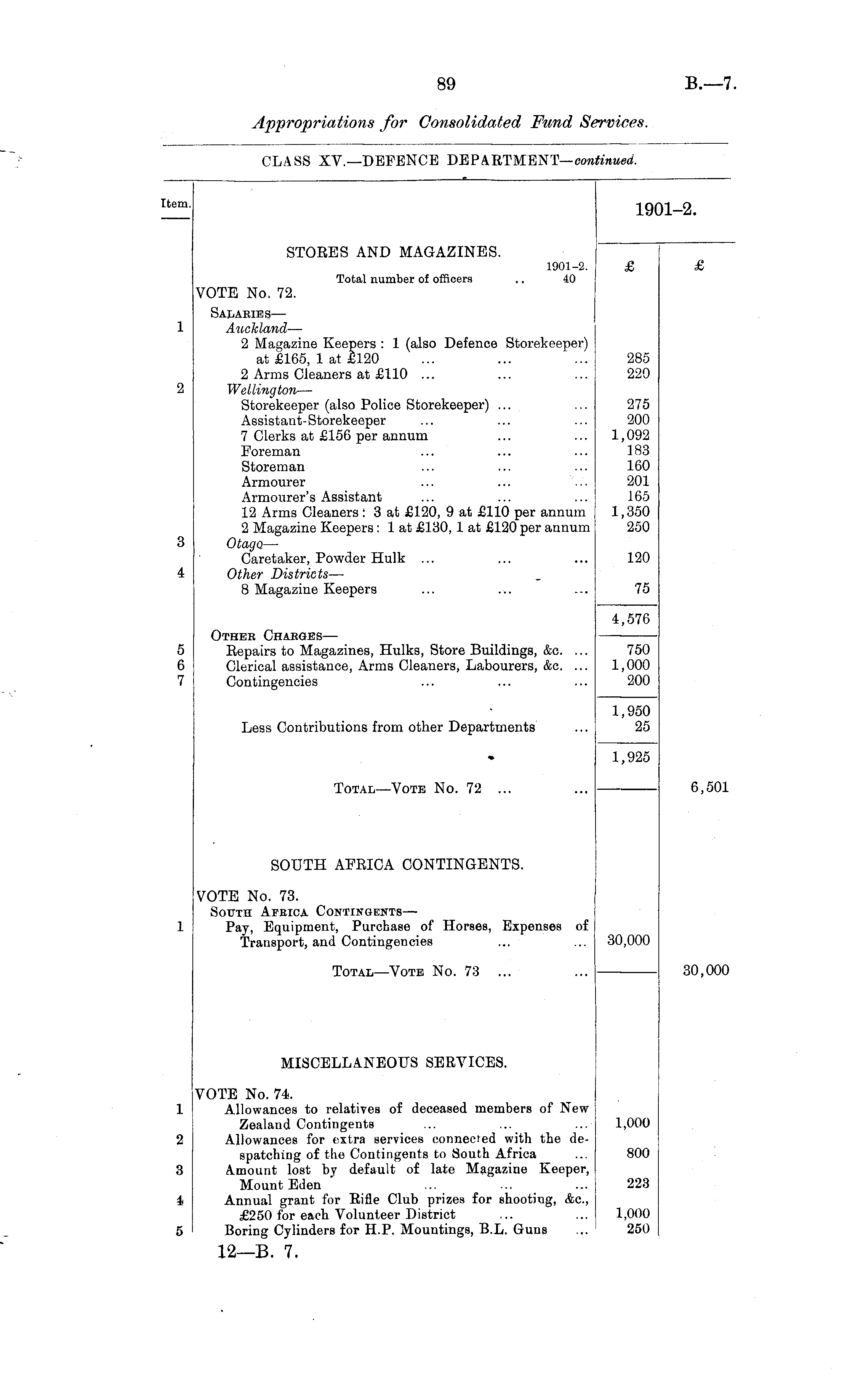 ;em. 19i 1-2. STOEES AND MAGAZINES. 1901-2. Total number of officers .. 40 VOTE No, 72. Salaries— Auckland — 2 Magazine Keepers : 1 (also Defence Storekeeper) at £165, 1 at £120 2 Arms Cleaners at £110 ... Wellington — Storekeeper (also Police Storekeeper) ... Assistant-Storekeeper 7 Clerks at £156 per annum Foreman Storeman Armourer Armourer's Assistant 12 Arms Cleaners: 3 at £120, 9 at £110 per annum 2 Magazine Keepers: 1 at £130,1 at £120 per annum Otaga — Caretaker, Powder Hulk ... Other Districts — 8 Magazine Keepers 285 220 275 200 1,092 183 160 201 165 1,350 250 3 120 4 75 Other Charges— Eepairs to Magazines, Hulks, Store Buildings, &e. ... Clerical assistance, Arms Cleaners, Labourers, &c. ... Contingencies 4,576 5 6 7 750 1,000 200 Less Contributions from other Departments 1,950 25 % 1,925 Total—Vote No. 72 ... 6,501 SOUTH AEBICA CONTINGENTS. VOTE No. 73. South Africa Contingents— Pay, Equipment, Purchase of Horses, Expenses of Transport, and Contingencies 30,000 Total—Vote No. 73 ... 30,000 MISCELLANEOUS SERVICES. 1 2 3 VOTE No. 74. Allowances to relatives of deceased members of New Zealand Contingents Allowances for extra services connected with the despatching of the Contingents to South Africa Amount lost by default of late Magazine Keeper, Mount Eden Annual grant for Eifle Club prizes for shooting, &c, £250 for each Volunteer District Boring Cylinders for H.P. Mountings, B.L. Guns 1,000 800 223 is 1,000 250 5