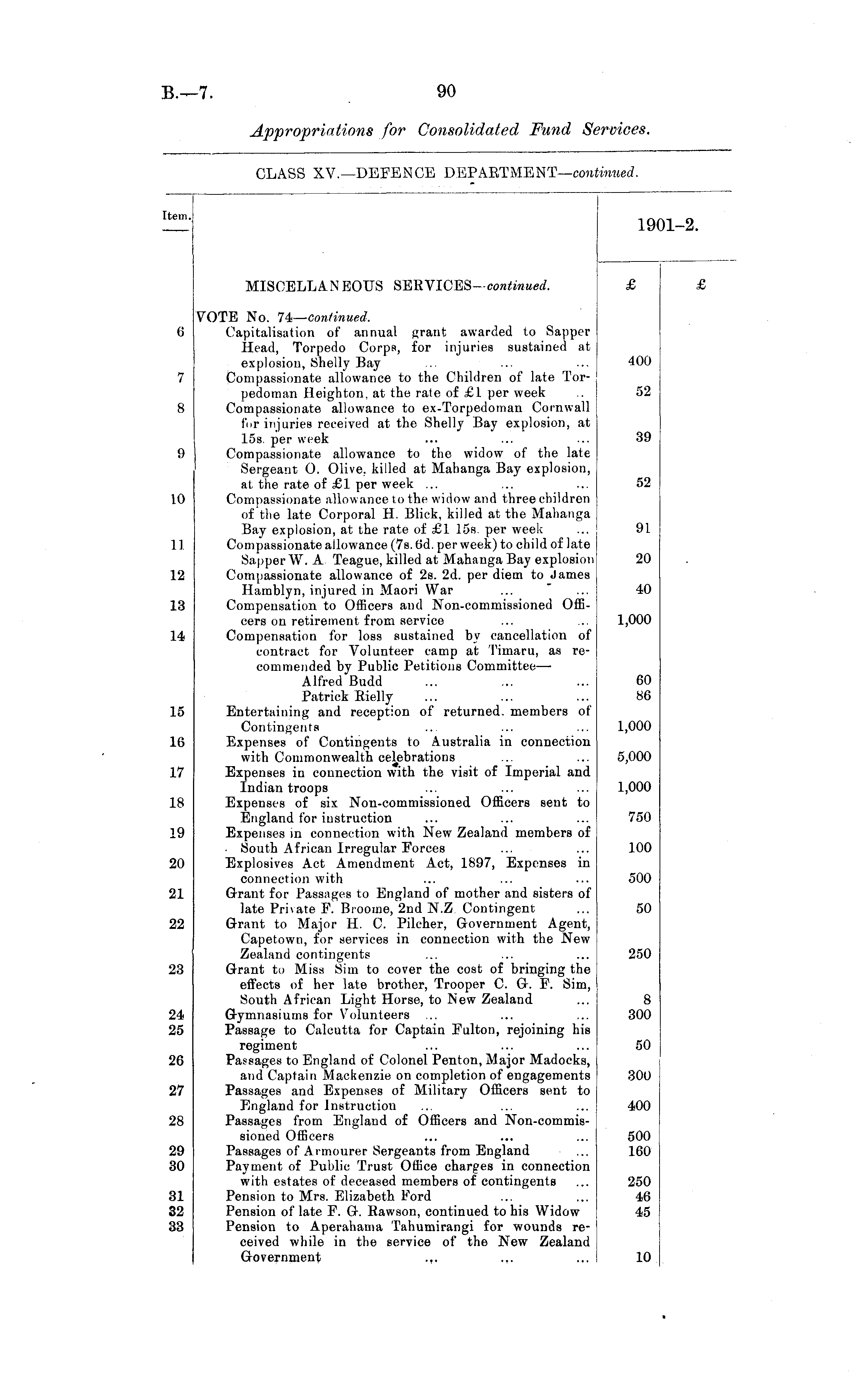 tern. 19' '1-2. MISCELLANEOTJS SERVICES— continued. 10 11 12 13 14 15 1G 17 G 7 8 VOTE No. 74— continued. Capitalisation of annual grant awarded to Sapper Head, Torpedo Corps, for injuries sustained at explosion, Shelly Bay Compassionate allowance to the Children of late Torpedoman Heighton. at the rate of £1 per week Compassionate allowance to ex-Torpedoinan Cornwall for injuries received at the Shelly Bay explosion, at 15s. per week Compassionate allowance to the widow of the late Sergeant O. Olive, killed at Mahanga Bay explosion, at the rate of £1 per week ... Compassionate allowance to the widow and three children of the late Corporal H, Blick, killed at the Mahanga Bay explosion, at the rate of £1 15s. per week Compassionate allowance (7s. 6d. per week) to child of late Sapper W. A Teague, killed at Mahanga Bay explosion Compassionate allowance of 2s. 2d. per diem to James Hamblyn, injured in Maori War Compensation to Officers and Non-commissioned Officers on retirement from service Compensation for loss sustained by cancellation of contract for Volunteer camp at Timaru, as recommended by Public Petitions Committee — Alfred Budd Patrick Rielly Entertaining and reception of returned, members of Contingents Expenses of Contingents to Australia in connection with Commonwealth celebrations Expenses in connection with the visit of Imperial and Indian troops Expenses of six Non-commissioned Officers sent to England for instruction Expenses in connection with New Zealand members of • South African Irregular Forces Explosives Act Amendment Act, 1897, Expenses in connection with Grant for Passages to England of mother and sisters of late Private F. Broome, 2nd N.Z. Contingent Grant to Major H. C. Pilcher, Government Agent, Capetown, for services in connection with the New Zealand contingents Grant to Miss Sim to cover the cost of bringing the effects of her late brother, Trooper C. G. F. Sim, South African Light Horse, to New Zealand Gymnasiums for Volunteers Passage to Calcutta for Captain Pulton, rejoining his regiment Passages to England of Colonel Penton, Major Madocks, and Captain Mackenzie on completion of engagements Passages and Expenses of Military Officers sent to England for Instruction Passages from England of Officers and Non-commis-sioned Officers Passages of Armourer Sergeants from England Payment of Public Trust Office charges in connection with estates of deceased members of contingents Pension to Mrs. Elizabeth Ford Pension of late F. G. Eawson, continued to his Widow Pension to Aperahama Tahumirangi for wounds received while in the service of the New Zealand Government 400 52 39 52 91 20 40 1,000 60 86 1,000 5,000 1,000 18 750 19 100 20 500 21 50 22 250 23 8 300 24 25 50 26 300 27 400 28 29 30 500 160 81 32 33 250 46 45 10