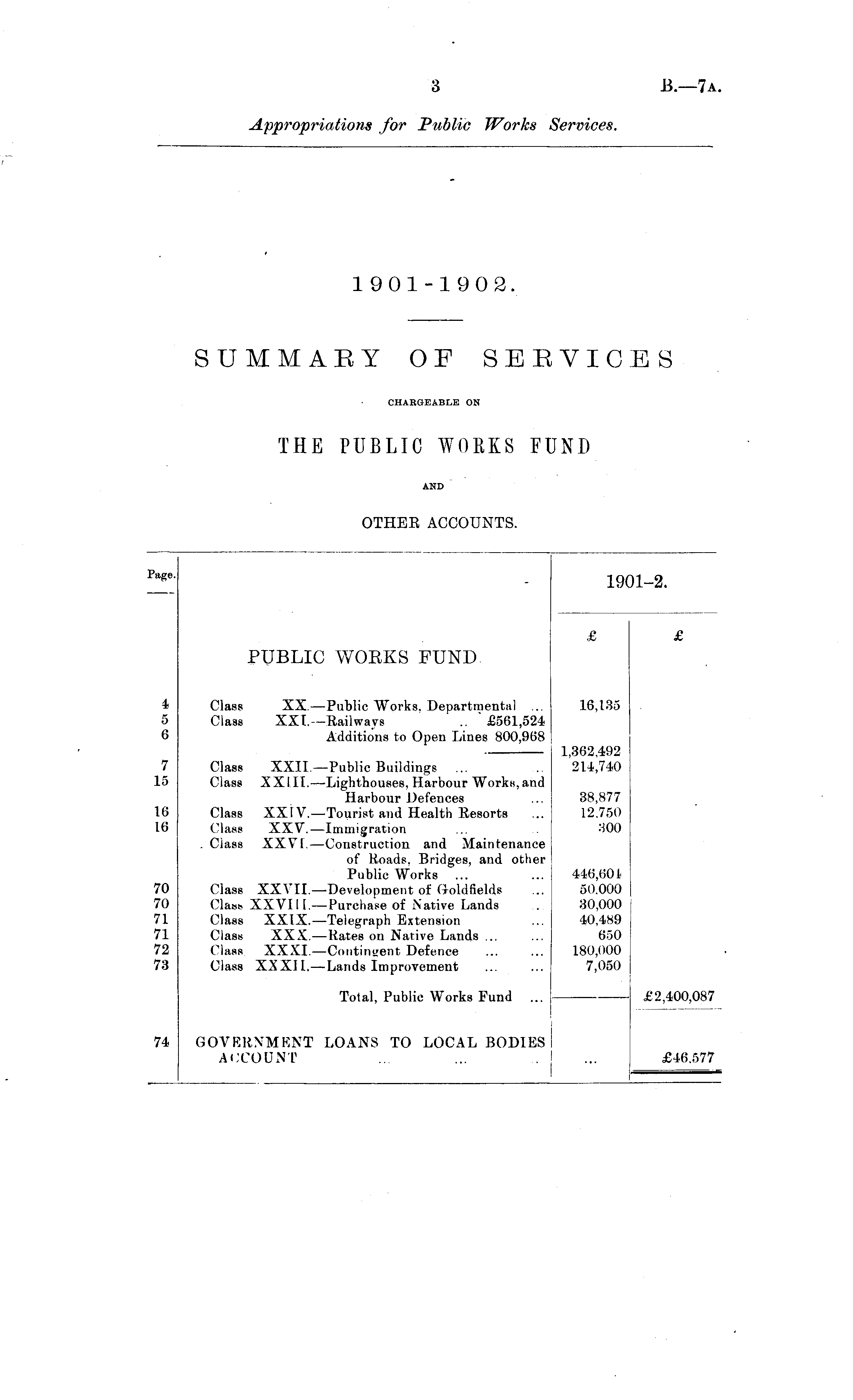 •age. 19 1-2. PUBLIC WORKS FUND £ £ 4 5 6 Class XX—Public Works. Departmental Class XXI.—Railways .. £561,524 Additions to Open Lines 800,968 16,135 7 15 1,362.492 214,740 16 16 Class XXII. —Public Buildings Class XXIII.—Lighthouses, Harbour Works,and Harbour Defences Class XXIV.—Tourist and Health Resorts Class XXV.—Immigration . Ciass XXVI. —Construction and Maintenance of Roads, Bridges, and other Public Works Class XXVII.—Development of Goldfields Cla»» XXVIII. — Purchase of Native Lands Class XXIX. —Telegraph Extension Class XXX. —Rates on Native Lands ... Class XXXI.—Contingent Defence Class XXXII. — Lands Improvement 38,877 12.750 300 446,601 50.000 30,000 40,489 650 180,000 7,050 70 70 71 71 72 73 Total, Public Works Fund ... £2,400,087 74 GOVRRNMRNT LOANS TO LOCAL BODIES ACCOUNT £46.577