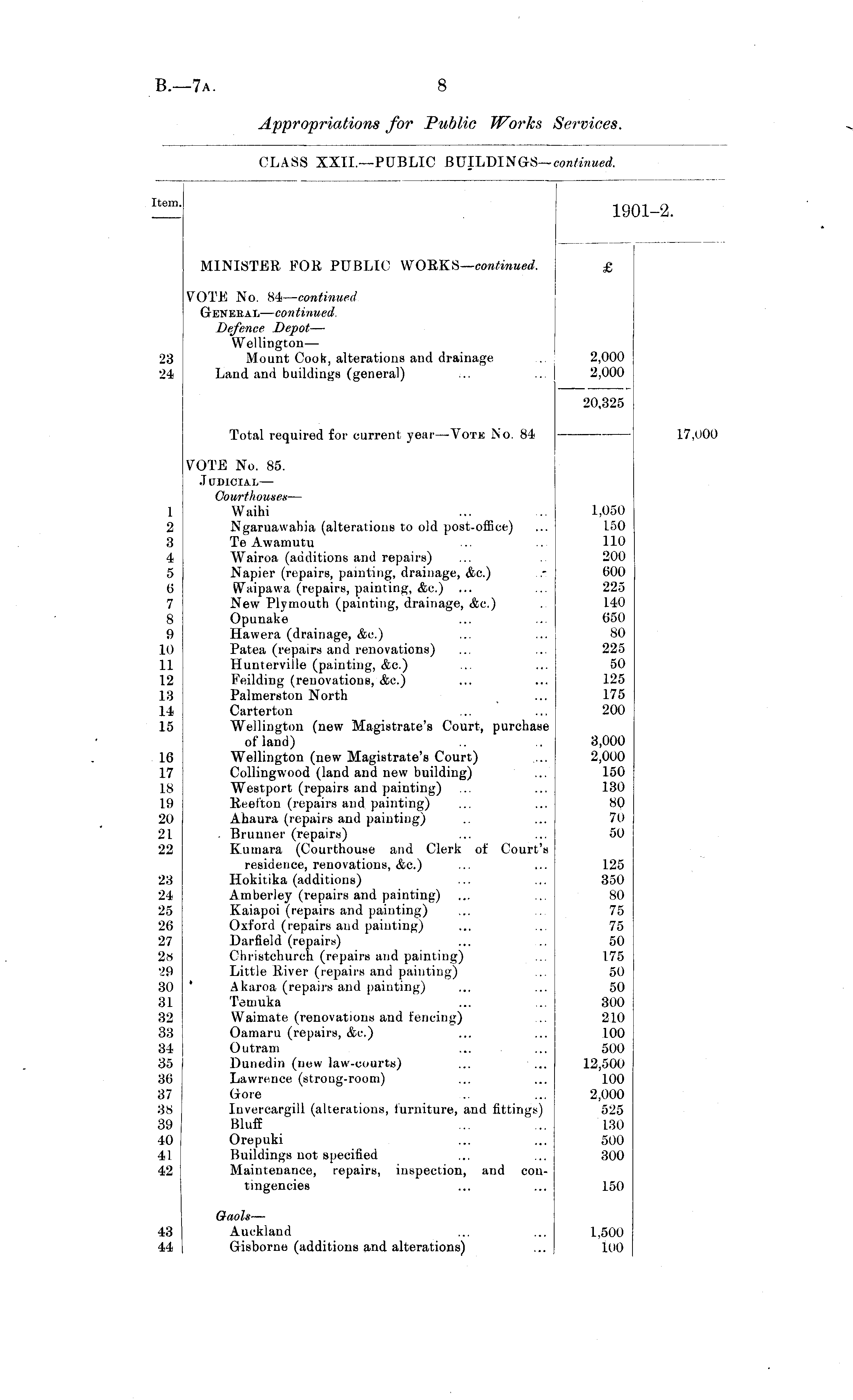 ;em. 19 1-2. MINISTER FOR PUBLIC WORKS— continued. £ VOTE No. 84— continued General — continued. Defence Depot — Wellington— Mount Cook, alterations and drainage Land and buildings (general) T.i 24 2,000 2,000 Total required for current year —-Vote No. 84 20,325 17,000 1 2 3 4 5 6 7 8 9 10 11 12 13 14 15 16 17 18 19 20 2L 22 VOTE No. 85. Judicial — Courthouses — Waihi Ngaruawahia (alterations to old post-office) Te Awamutu Wairoa (additions and repairs) Napier (repairs, painting, drainage, &c.) vVaipawa (repairs, painting, &c.) ... New Plymouth (painting, drainage, &c.) Opunake Hawera (drainage, &c.) Patea (repairs and renovations) Hunterville (painting, &c.) Feilding (renovations, &c.) Palmerston North Carterton Wellington (new Magistrate's Court, purchase of land) Wellington (new Magistrate's Court) Collingwood (land and new building) Westport (repairs and painting) Reefton (repairs and painting) Ahaura (repairs and painting) . Brunner (repairs) Kumara (Courthouse and Clerk of Court's residence, renovations, &c.) Hokitika (additions) Amberley (repairs and painting) Kaiapoi (repairs and painting) Oxford (repairs and painting) Darfield (repairs) Christchurch (repairs and painting) Little River (repairs and painting) Akaroa (repairs and painting) Tamuka Waimate (renovations and fencing) Oamaru (repairs, &c.) Outram Dunedin (new law-courts) Lawrence (strong-room) Gore Invercargill (alterations, furniture, and fittings) Bluff Orepuki Buildings not specified Maintenance, repairs, inspection, and contingencies 1,050 150 110 200 600 225 140 650 80 225 50 125 175 200 3,000 2,000 150 130 80 70 50 23 24 25 26 27 28 29 30 31 32 33 31 35 36 37 38 89 40 II 42 125 350 80 75 75 50 175 50 50 300 210 100 500 12,500 100 2,000 525 130 500 300 150 43 44 Gaols — Auckland Gisborne (additions and alterations) 1,500 loo