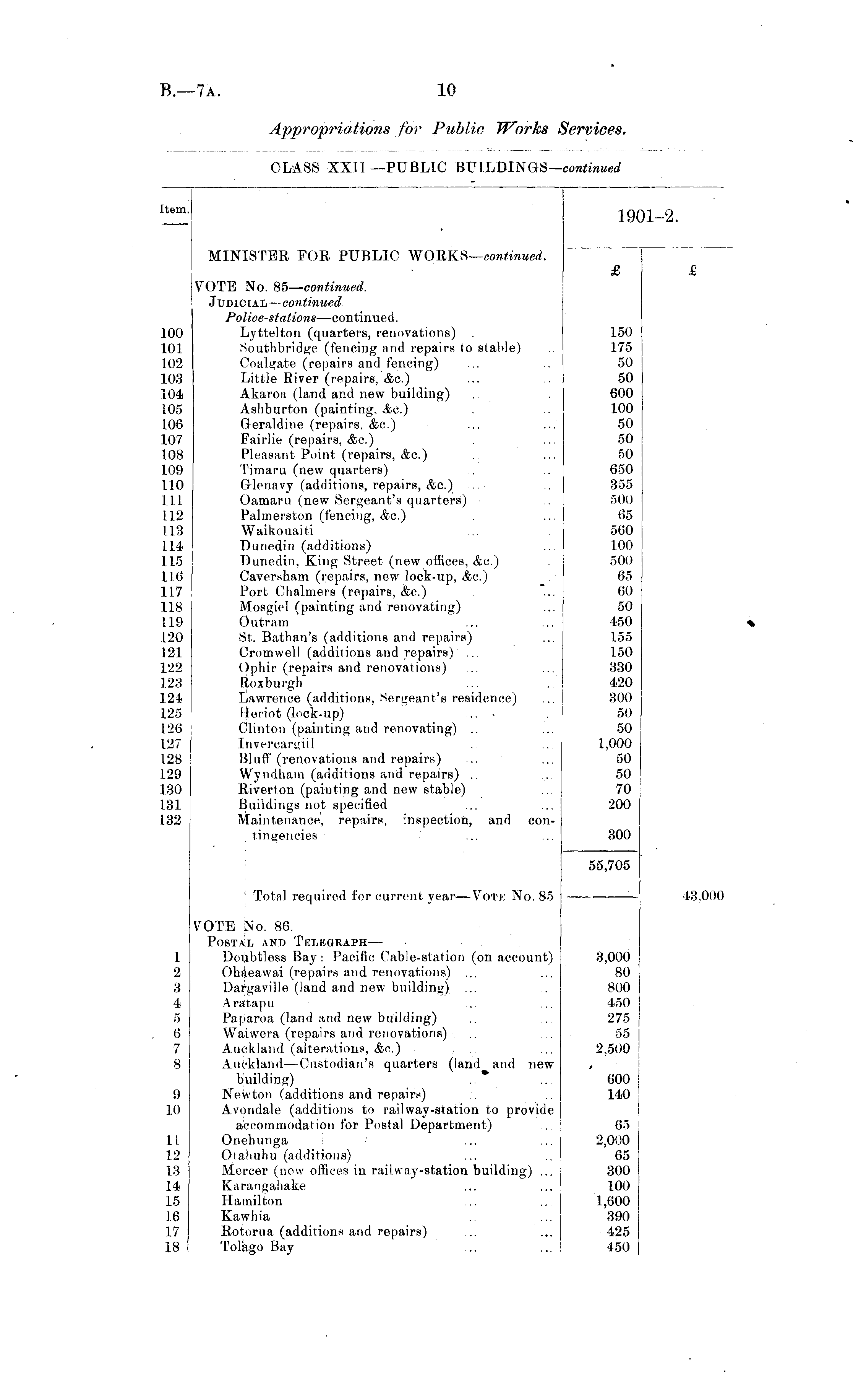 Item. 19 1-2. MINISTER FOR PUBLIC WORKS— continued. VOTE No. 85— continued. Judicial — continued. Police-stations —continued. Lyttelton (quarters, renovations) Southbridge (fencing and repairs to stable) Coalgate (repairs and fencing) Little River (repairs, &c.) Akaroa (land and new building) Ashburton (painting, &c.) Geraldine (repairs, &c.) Fairlie (repairs, &c.) Pleasant Point (repairs, &c.) Timaru (new quarters) Glenavy (additions, repairs, &c.) Oamaru (new Sergeant's quarters) Palmerston (fencing, &c.) Waikouaiti Dunedin (additions) Dunedin, King Street (new offices, &c.) Caversham (repairs, new lock-up, &c.) Port Chalmers (repairs, &c.) Mosgiel (painting and renovating) Outram St. Bathan's (additions and repairs) Cromwell (additions and repairs) ... Ophir (repairs and renovations) Roxburgh Lawrence (additions, Sergeant's residence) Heriot (lock-up) ... • Clinton (painting and renovating) Invercargill Bluff (renovations and repairs) Wyndham (additions and repairs) .. Riverton (painting and new stable) Buildings not specified Maintenance, repairs, inspection, and contingencies £ 100 101 102 103 104 105 106 107 108 109 110 111 L12 1.13 114 115 116 117 118 119 120 121 122 123 124 125 126 127 128 129 130 181 132 150 175 50 50 600 100 50 50 50 650 355 500 65 560 100 500 65 60 50 450 155 150 330 420 300 50 50 1,000 50 50 70 200 300 55,705 1 Total required for current year—Vote No. 85 43.000 1 2 3 4 5 6 7 8 9 10 VOTE No. 86 Postal and Telegraph— Doubtless Bay: Pacific Cable-station (on account) Ohaeawai (repairs and renovations) ... Dargaville (land and new building) ... Aratapu Paparoa (land and new building) Waiwera (repairs and renovations) Auckland (alterations, &c.) A iickland —Custodian's quarters (land and new building) Newton (additions and repairs) Avondale (additions to railway-station to provide accommodation for Postal Department) Onehunga Otahuhu (additions) Mercer (new offices in railway-station building) ... Karangahake Hamilton Kawhia Rotorua (additions and repairs) Tolago Bay 3,000 80 800 450 275 55 2.500 600 140 II 12 13 14 15 16 17 18 65 2,000 65 300 100 1,600 390 425 450