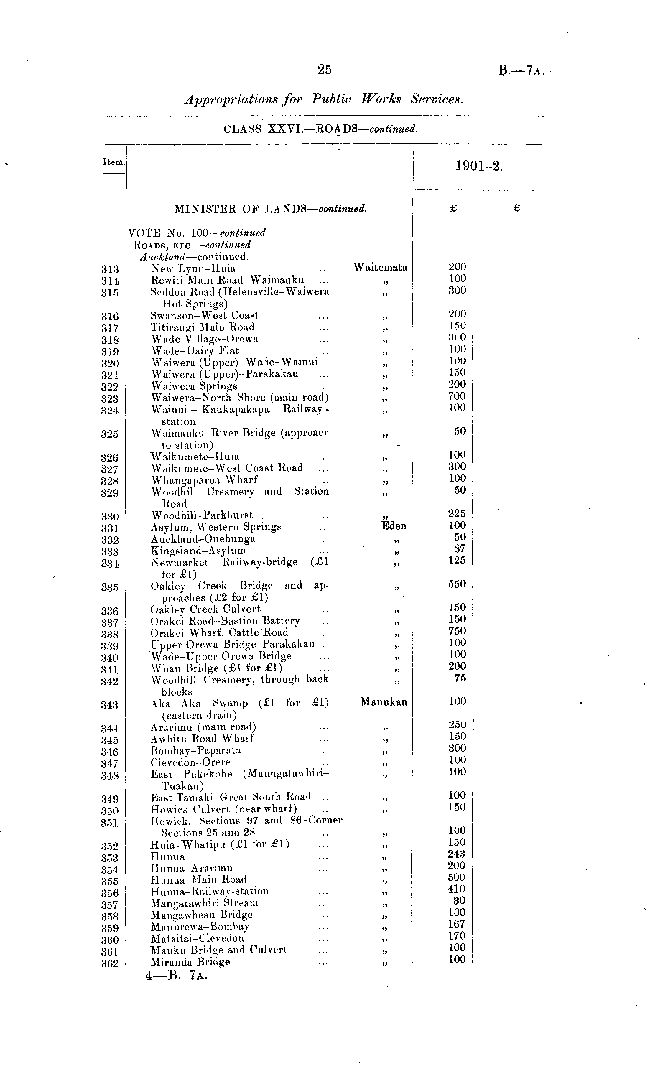 Item. 19 1-2. MINISTER OF LANDS—continued. 313 314 315 316 317 318 319 320 321 322 323 324 325 326 327 328 329 330 831 332 333 334 335 VOTE No. WO-continued. Roads, etc. — continued. Auckland —continued. New Lynn-lluia ... Waitemata Rewiti Main Road-Waimauku ... „ Seddon Road (Helensville-Waiwera „ Hot Springs) Swanson-West Coast ... ,, Titirangi Main Road ... „ Wade Village-Orewa ... „ Wade-Dairy Flat Waiwera (Upper)-Wade-Wainui .. „ Waiwera (Dpper)-Parakakau ... „ Waiwera Springs „ Waiwera-North Shore (main road) ,, Wainui - Kaukapakapa Railway - „ station Waimauku River Bridge (approach „ to station) Waikuuiete-lluia ... „ Waikumete-West Coast Road ... „ Whangaparoa Wharf ... „ Woodhill Creamery and Station „ Road Woodhill-Parkhurst . ... „ Asylum, Western Springs ... Eden Auckland-Onehunga ... „ Kingsland-Asylum ... „ Newmarket Railway-bridge (£1 ,, for £1) Oakley Creek Bridge and ap- „ preaches (£2 for £1) Oakley Creek Culvert ... ,, Orakei Road-Bastion Battery ... „ Orakei Wharf, Cattle Road ... „ Upper Orewa Bridge- Parakakau . ,, Wade-Upper Orewa Bridge ... „ Whau Bridge (£1 for £1) Woodhill Creamery, through back ,, blocks Aka Aka Swamp (£1 for £1) Manukau (eastern drain) Ararimu (main road) ... „ Awhitti Road Wharf ... ,, Bombay-Paparata .. ,, Clevedon-Orere .. ,, East Pukekohe (Maungatawhiri- „ Tuakau) East Tamaki-Great South Road ... „ Howick Culvert (near wharf) ... ,. llowick, Sections 97 and 86-Corner Sections 25 and 28 ... „ Huia-Whatipu (£1 for £1) Hunua ■■■ „ Hunua-Ararimu ... ,, Hunua-Main Road ... „ Hunua-Railway-station ... „ Mangatawhiri Stream ... ,, Mangawheaii Bridge ... ,, Manurewa-Bombay ... ,, Mataitai-Clevedon ... ,, Mauku Bridge and Culvert ... „ Miranda Bridge ... ,, 200 100 300 200 150 3i i0 100 100 150 200 700 100 50 100 300 100 50 225 100 50 87 125 550 336 337 338 339 340 341 342 150 150 750 100 100 200 75 343 100 344 345 346 347 34S 250 150 300 100 100 349 350 351 100 150 352 353 354 355 356 357 358 359 360 861 362 100 150 243 200 500 410 30 100 167 170 100 100