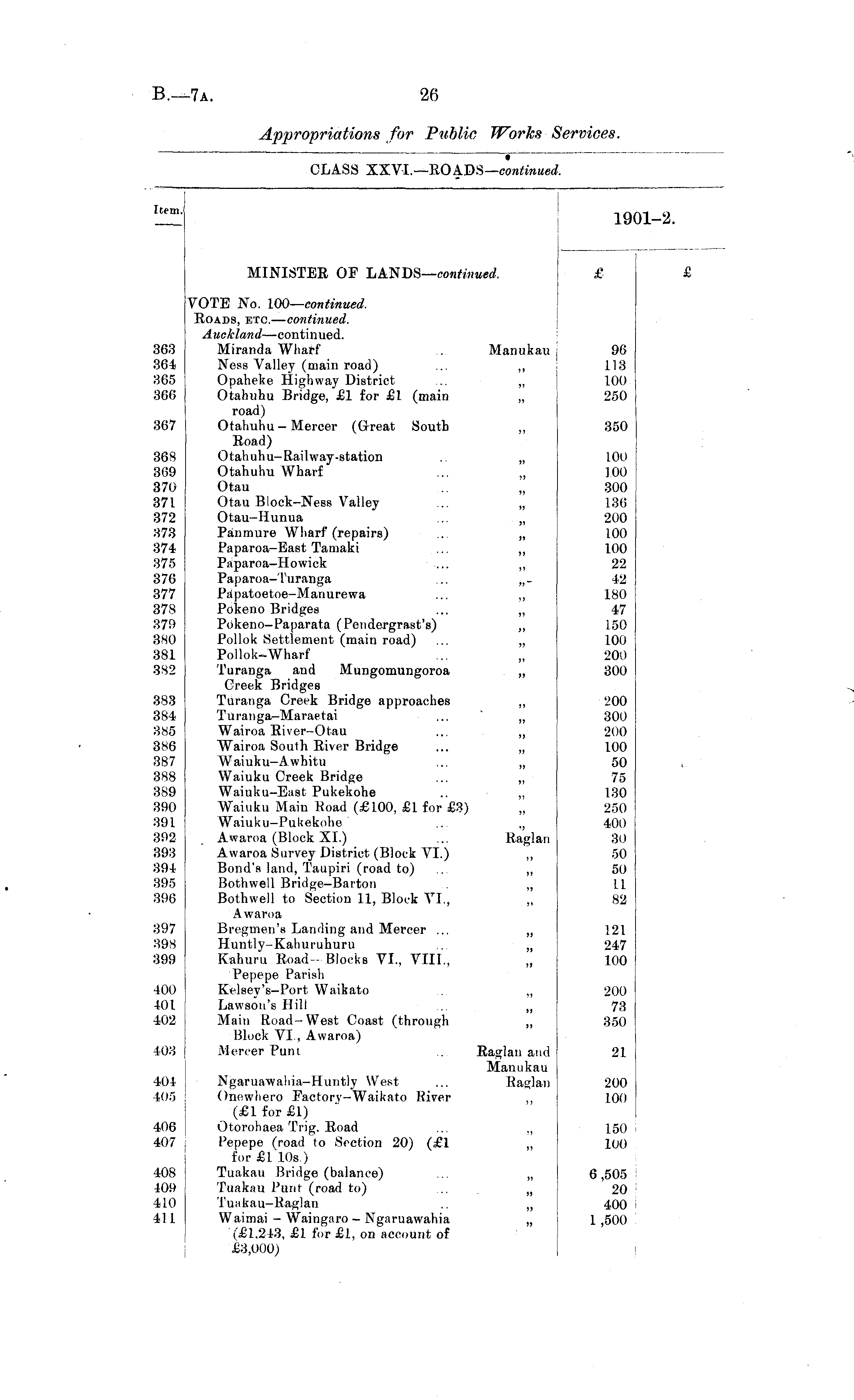 Item.! 19i 1-2. MINISTER OF LANDS— continued. £ 363 364 365 866 367 368 369 370 371 372 373 374 375 376 377 378 379 380 381 382 383 384 385 386 387 388 389 390 391 392 393 394 395 396 VOTE No. 100— continued. Roads, etc. — continued. Auckland —continued. Miranda Wharf ... Manukau Ness Valley (main road) ... ,, Opaheke Highway District ... ,, Otahuhu Bridge, £1 for £1 (main „ road) Otahuhu - Mercer (Great South „ Road) Otahuhu-Railway-station .. „ Otahuhu Wharf Otau ... „ Otau Block-Ness Valley ... „ Otau-Hunua ... „ Panmure Wharf (repairs) ... „ Paparoa-East Tamaki ... „ Paparoa-Howick ... „ Paparoa-Turanga ... „- Papatoetoe-Manurewa ... ,, Pokeno Bridges ... „ Pokeno-Paparata (Pendergrast's) „ Pollok Settlement (main road) ... „ Pollok-Wharf Turanga and Mungomungoroa „ Creek Bridges Turanga Creek Bridge approaches ,, Turanga-Maraetai ... „ Wairoa River-Otau ... ,, Wairoa South River Bridge ... „ Waiuku-Awhitu ... „ Waiuku Creek Bridge ... „ Waiuku-East Pukekohe .. ,, Waiuku Main Road (£100, £1 for £3) Waiuku-Pukekohe ... „ Awaroa (Block XL) ... Raglan Awaroa Survey District (Block VI.) ,, Bond's land, Taupiri (road to) ... „ Bothwell Bridge—Barton ,, Bothwell to Section 11, Block VI., Awaroa Bregmen's Landing and Mercer ... ,, Huntly-Kahuruhuru ... „ Kahuru Road- Blocks VI., VIII., Pepepe Parish Kelsey's-Port Waikato ... „ Lawson's Hill ... „ Main Road-West Coast (through „ Block VI., Awaroa) Mercer Punt ... Raglan and Manukau Ngaruawahia-Huntly West ... Raglan Onewhero Factorv-Waikato River ,, (£1 for £1) Otorohaea Trig. Road ... „ Pepepe (road to Section 20) (£1 „ for £1 10s.) Tuakau Bridge (balance) ... „ Tuakau Punt (road to) ... „ Tunkau-Raglan .. „ Waimai - Walngaro - Ngaruawahia „ (£1,243, £1 for £1, on account of £3,000) i 96 113 100 250 350 100 100 300 130 200 100 100 22 42 180 47 150 100 200 300 200 300 200 100 50 75 130 250 400 30 50 50 11 82 397 398 399 121 247 100 400 101 402 200 73 350 403 21 404 405 200 100 406 407 150 100 408 409 410 411 6 ,505 20 400 1 ,500