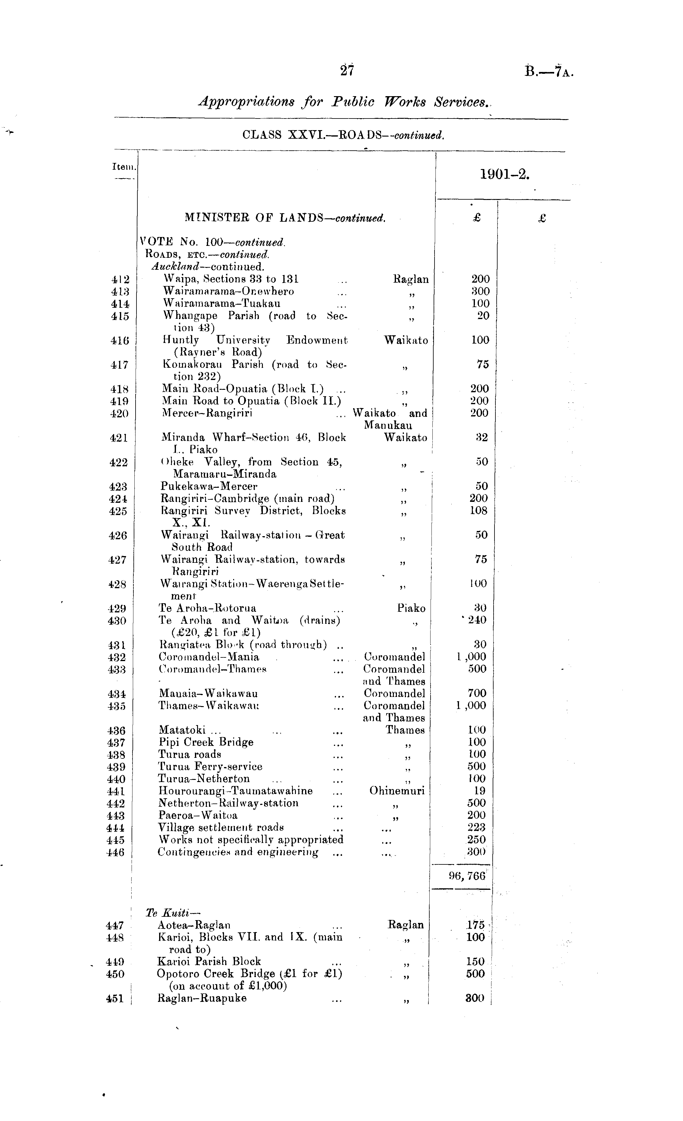 Item. 19 1-2. MINISTER OF LANDS— continued. £ 412 413 414 415 416 417 418 419 420 412 413 414 415 416 417 418 419 420 421 422 423 424 425 426 427 128 i VOTE No. 100— continued. Roads, etc. — continued. Auckland —continued. Waipa, Sections 33 to 131 .. Raglan Wairamarama-Or.ewhero ... „ Wairaniarama-Tuakau ... ,, Whangape Parish (road to Sec- ., tion 43) Huntly University Endowment Waikato (Ravner's Road) Komakorau Parish (road to Sec- ,, tion 232) Main Road-Opuatia (Block I.) ... ., Main Road to Opuatia (Block II.) ., Mercer-Rangiriri ... Waikato and Manukau Miranda Wharf-Section 46, Block Waikato I.. Piako <Mieke Valley, from Section 45, „ Maramaru-Miranda Pukekawa-Mercer ... ,, Rangiriri-Cambridge (main road) ,, Rangiriri Survey District, Blocks ,, X., XL Wairangi Railway-station - Great „ South Road Wairangi Railway-station, towards „ Rangiriri Wairangi Station-WaerengaSettle- ,, 200 300 100 20 100 75 200 200 200 421 32 422 50 423 424 425 50 200 108 426 50 427 75 428 100 429 430 431 432 433 434 435 436 437 438 439 440 441 442 443 444 445 446 129 130 131 132 133 134 135 136 137 138 139 140 141 142 43 44 45 46 ment Te Aroha-Rotorua ... Piako Te Aroha and Waitoa (drains) ., (£20, £1 for £1) Rangiatea Bio dt (road through) .. „ Coromandel-Mania ... Coromandel Coromandel—Thames ... Coromandel and Thames Mauaia— Waikawau ... Coromandel Thames—Waikawau ... Coromandel and Thames Matatoki ... ... ... Thames Pipi Creek Bridge ... ,, Turua roads ... „ Turua Ferry-service ... ,, Turua-Netherton ... ... ,, Hourourangi-Tauinatawahine ... Ohinemuri Netherton-Rail way-station ... „ Paeroa-Waitoa ... „ Village settlement roads Works not specifically appropriated Contingencies and engineering 30 ' 240 30 1 ,000 500 700 1 ,000 100 100 100 500 100 19 500 200 223 250 300 96, 766 47 48 49 •50 ,51 j Te Kuiti — Aotea-Raglan ... Raglan Karioi, Blocks VII. and IX. (main „ road to) Karioi Parish Block ... „ Opotoro Creek Bridge (£1 for £1) . „ I (on account of £1,000) Raglan-Ruapuke ... „ 175 100 | 150 500 300