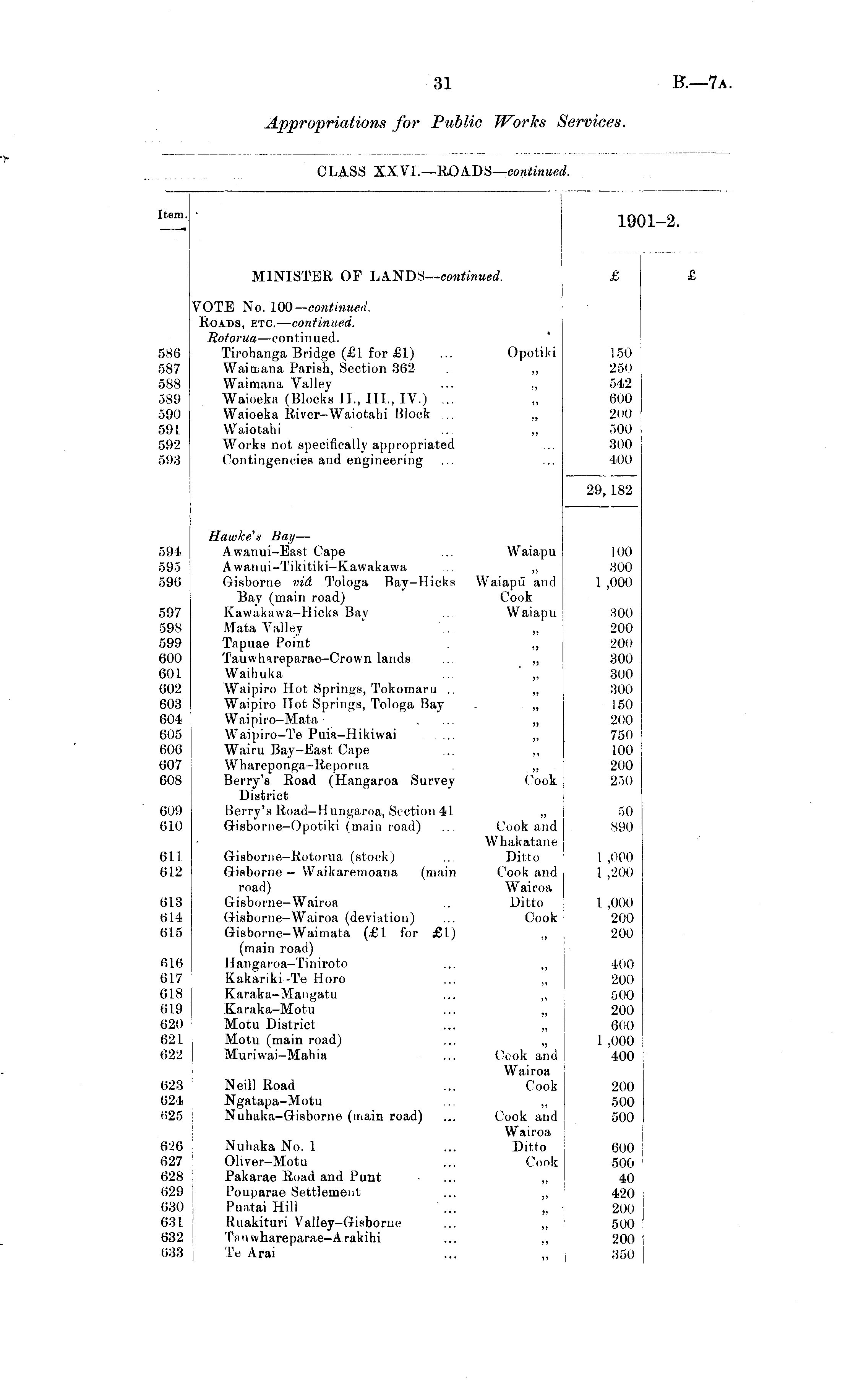 item. 19< 1-2. MINISTER OF LANDS— continued. £ £ VOTE No. 100— continued. Roads, etc. — continued. Rotorua —continued. 586 Tirohanga Bridge (£1 for £1) ... Opotiki 587 Waimana Parish, Section 362 . ,, 588 Waimana Valley ... , 589 Waioeka (Blocks II, III, IV.) ... 590 Waioeka River-Waiotahi Block ... , 591 Waiotahi 592 Works not specifically appropriated 593 Contingencies and engineering 186 187 .88 189 190 191 ,92 193 150 250 542 600 200 500 300 400 29, 182 Hawke's Bay — 594 Awanui-East Cape ... Waiapu 595 Awanui-Tikitiki-Kawakawa .. ,, 596 Gisborne vid Tologa Bay-Hicks Waiapu and Bay (main road) Cook 597 Kawakawa-llicks Bay ... Waiapu 598 Mata Valley 599 Tapuae Point , 600 Tauwhareparae—Crown lands ... „ 601 Waihuka ... ' „ 602 Waipiro Hot Springs, Tokomaru .. ,, 603 Waipiro Hot Springs, Tologa Bay . „ 604 Waipiro-Mata . ... 605 Waipiro-Te Puia-Hikiwai ... „ 606 Wairu Bay-East Cape ... ,, 607 Whareponga-Reporua ,, 608 Berry's Road (Hangaroa Survey Cook District 609 Berry's Road—Hungaroa, Section 41 „ 610 Gisborne—Opotiki (main road) ... Cook and Whakatane 611 Gisborne-Rotorua (stock) ... Ditto 6L2 Gisborne - Waikaremoana (main Cook and road) Wairoa 613 Gisborne-Wairoa .. Ditto 6L4 Gisborne—Wairoa (deviation) ... Cook 615 Gisborne-Waimata (£1 for £1) , (main road) 616 Hangaroa—Tiniroto ... u 617 Kakariki-Te Horo ... ,, 618 Karaka-Maugatu ... „ 619 Karaka-Motu 620 Motu District 621 Motu (main road) ... „ 622 Muriwai-Mahia ... Cook and Wairoa 623 Neill Road ... Cook 624 Ngatapa-Motu 625 Nuhaka-Gisborne (main road) ... Cook and Wairoa 626 ! Nuhaka No. 1 ... Ditto 627 ; Oliver-Motu ... Cook 628 Pakarae Road and Punt ... „ 629 Pouparae Settlement ... „ 630 Puatai Hill 631 Ruakituri Valley-Gisborue ... „ 632 Tauwhareparae—Arakihi ... , 633 I Te Arai ... ,, 100 300 1 ,000 300 200 200 300 300 300 150 200 750 100 200 250 50 890 1 ,000 1 ,200 1,000 200 200 1< 10 200 500 200 600 1 ,000 400 200 500 500 600 500 40 420 200 500 200