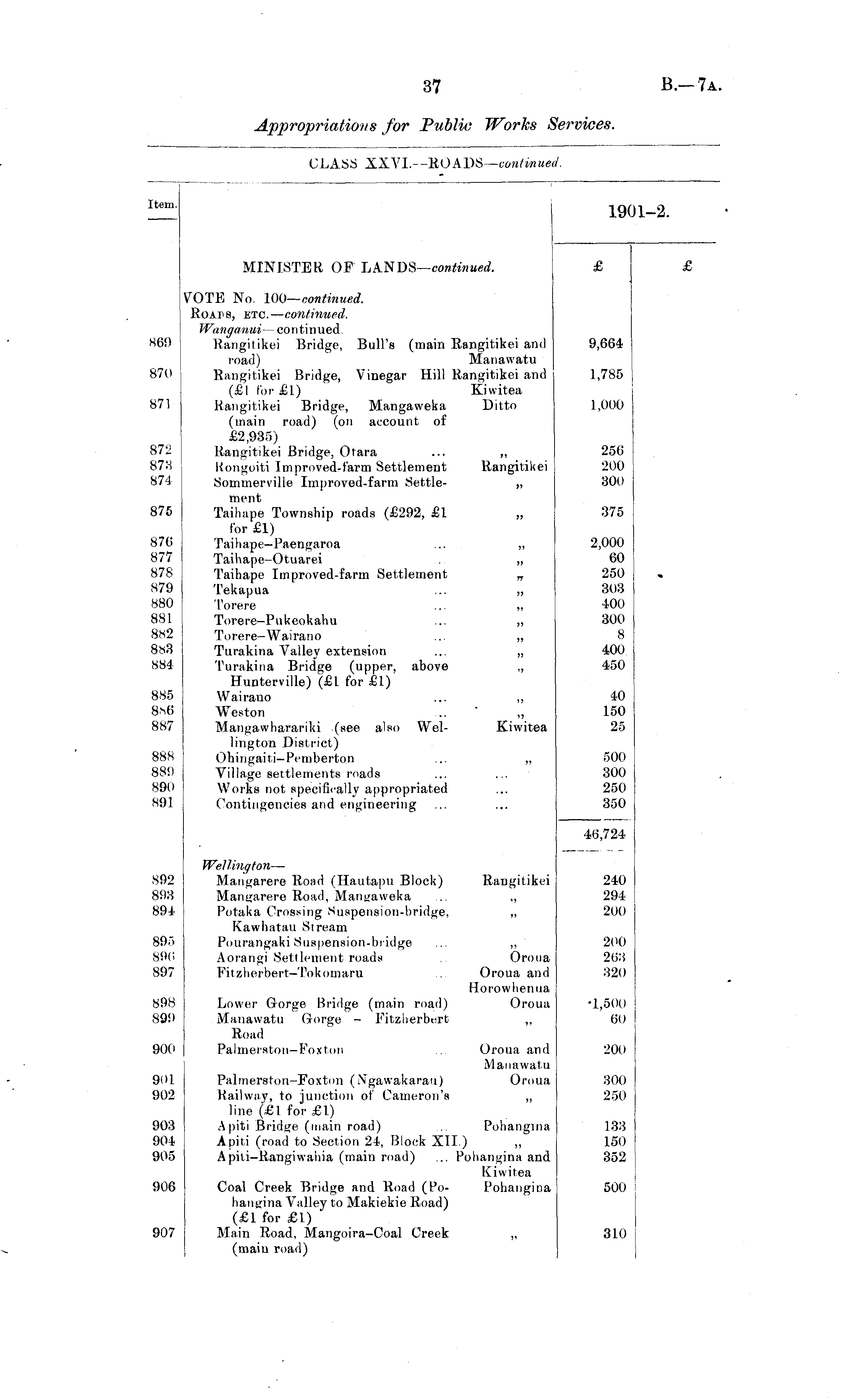 tern. 19 1-2. MINISTER OF LANDS— continued. VOTE No 100— continued. Roads, etc. — continued. Wanganui — continued. Rangitikei Bridge, Bull's (main Rangitikei and road) Manawatu Rangitikei Bridge, Vinegar Hill Rangitikei and (£1 for £l) Kiwitea Rangitikei Bridge, Mangaweka Ditto (main road) (on account of £2,935) Rangitikei Bridge, Otara ... ,, Rongoiti Improved-farm Settlement Rangitikei Sommerville Improved-farm Settle- „ ment Taihape Township roads (£292, £1 „ for £1) Taihape-Paengaroa ... „ Taihape-Otuarei „ Taihape Improved-farm Settlement „ Tekapua ... „ Torere ... „ Torere—Pukeokahu ... „ Torere-Wairano ... „ Turakina Valley extension ... „ Turakina Bridge (upper, above „ Hunterville) (£1 for £1) Wairano ... ,, Weston .. ,, Mangawharariki (see also Wei- Kiwitea lington Dist rict) Ohingaiti—Pemberto.n ... „ Village settlements roads Works not specifically appropriated Contingencies and engineering £ 9,664 869 870 1,785 871 1,000 872 873 874 256 200 300 875 375 876 877 878 879 880 881 882 8 S3 884 2,000 60 250 303 400 300 8 400 450 885 8h6 887 40 150 25 88S 880 890 891 500 300 250 350 46,724 892 893 894 895 890 897 898 899 900 Wellington — Mangarere Road (Hautapu Block) Rangitikei Mangarere Road, Mangaweka ... ,, Potaka Crossing Suspension-bridge, ,, Kawhatau Stream Pourangaki Suspension-bridge ... ,, Aorangi Settlement roads .. Oroua Fitzherbert—Tokomaru ... Oroua and Horowhenua Lower Gorge Bridge (main road) Oroua Manawatu Gorge - Fitzherbert ,, Road Palmerston—Foxton ... Oroua and Manawatu Palmerston-Foxton (Ngawakarau) Oroua Railway, to junction of Cameron's „ line (£1 for £1) Apiti Bridge (main road) .. Pohangina Apiti (road to Section 24, Block XII.) ,, Apiti—Rangiwahia (main road) .. Pohangina and Kiwitea Coal Creek Bridge and Road (Po- Pohangina hangina Valley to Makiekie Road) (£1 for £1) Main Road, Mangoira-Coal Creek ,. (main road) 240 294 200 2(H) 263 320 •1,500 60 200 901 902 300 250 903 904 905 133 150 352 906 500 310 907