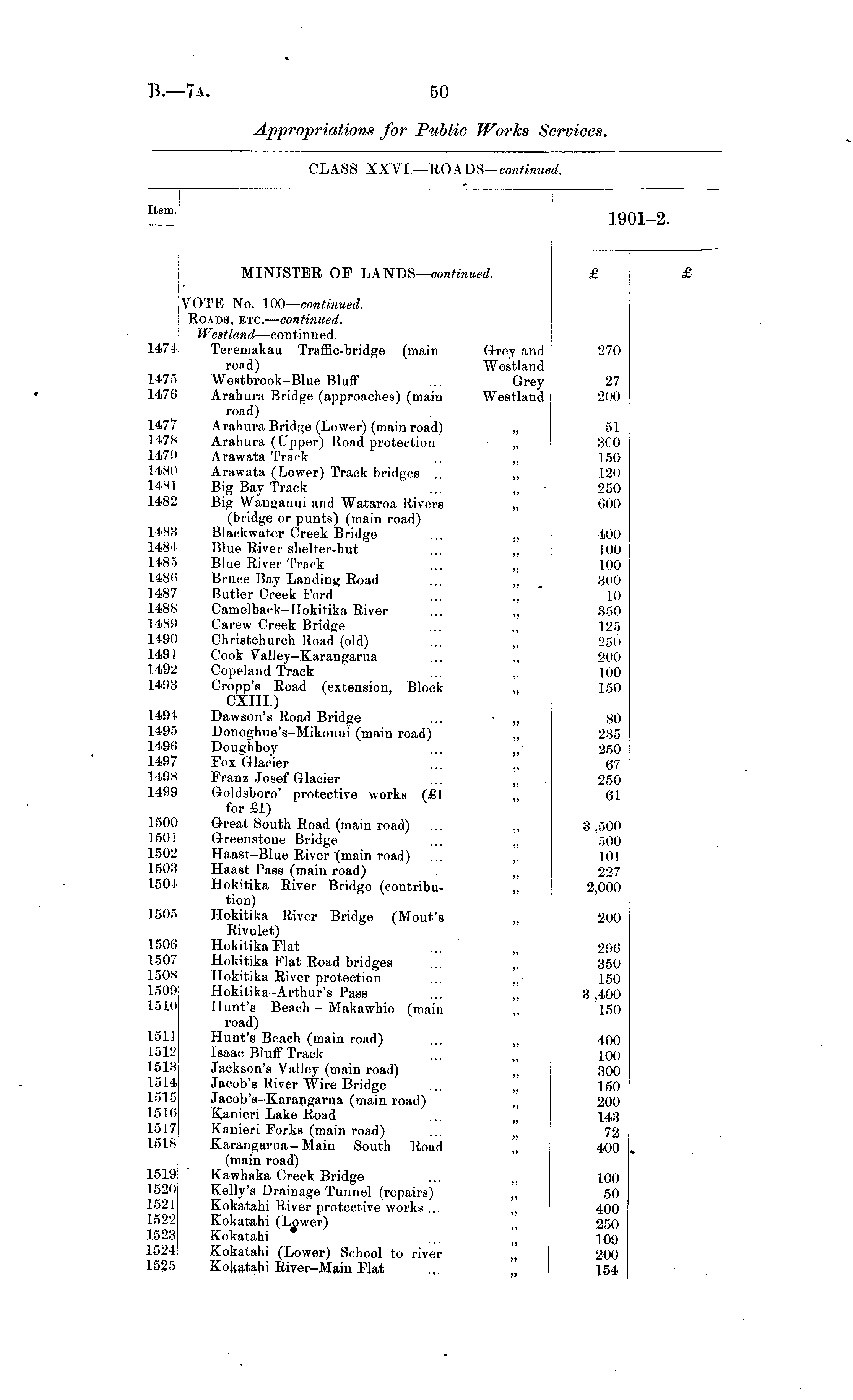 Item. 19 1-2. MINISTER OF LANDS— continued. £ 1474 1475 1476 1477 1478 1479 1480 1481 1482 1483 1484 1485 148(5 1487 1488 1489 1490 1491 1492 1493 1494 1495 1496 1497 1498 1499 VOTE No. 100— continued. Roads, etc. — continued. Westland —continued. Teremakau Traffic-bridge (main Grey and road) Westland Westbrook-Blue Bluff ... Grey Arahura Bridge (approaches) (main Westland road) Arahura Bridge (Lower) (main road) „ Arahura (Upper) Road protection „ Arawata Track ... ,, Arawata (Lower) Track bridges ... ,, Big Bay Track ... „ Big Wanganui and Wataroa Rivers „ (bridge or punts) (main road) Blackwater Creek Bridge ... „ Blue River shelter-hut ... „ Blue River Track ... Bruce Bay Landing Road ... ,, Butler Creek Ford ... , Camelbaek-Hokitika River ... „ Carew Creek Bridge ... ,, Christchurch Road (old) ... „ Cook Valley-Karangarua Copeland Track ... „ Cropp's Road (extension, Block „ CXIII.) Dawson's Road Bridge ... • „ Donoghue's-Mikonui (main road) „ Doughboy Fox Glacier ... „ Franz Josef Glacier ,; Goldsboro' protective works (£1 for £1) Great South Road (main road) ... ,, Greenstone Bridge Haast-Blue River (main road) ... ,, Haast Pass (main road) ,, Hokitika River Bridge (contribu- „ tion) Hokitika River Bridge (Mout's „ Rivulet) Hokitika Flat Hokitika Flat Road bridges ... „ Hokitika River protection Hokitika-Arthur's Pass Hunt's Beach - Makawhio (main road) Hunt's Beach (main road) Isaac Bluff Track Jackson's Valley (main road) Jacob's River Wire Bridge Jacob's-Karangarua (main road) Kanieri Lake Road Kanieri Forks (main road) Karangarua-Main South Road (main road) Kawhaka Creek Bridge Kelly's Drainage Tunnel (repairs) „ Kokatahi River protective works ... Kokatahi (Lower) Kokatahi Kokatahi (Lower) School to river „ Kokatahi River-Main Flat 270 27 200 51 8C0 150 120 250 600 400 100 100 300 10 350 125 250 200 100 150 80 235 250 67 250 61 1500 1501 1502 1503 1501 3,500 500 101 227 2,000 1505 200 1506 1507 150s 1509 1510 296 350 150 3 ,400 150 1511 1512 1513 1514 1515 1516 1517 1518 400 100 300 150 200 143 72 400 1519 1520 1521 1522! 15231 1524 1 15251 100 50 400 250 109 200 154