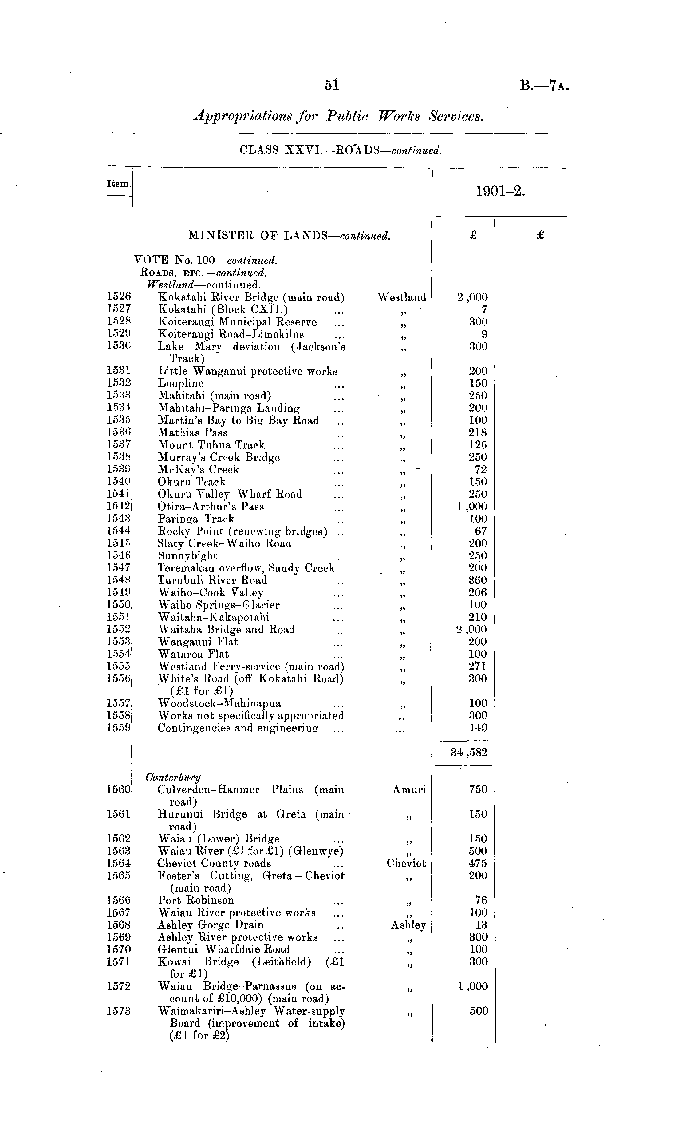 item. 19 1-2. MINISTER OF LANDS— continued. VOTE No. 100— continued. Roads, etc. — continued. Westland —continued. Kokatahi River Bridge (main road) Westland Kokatahi (Block CXII.) Koiterangi Municipal Reserve ... „ Koiterangi Road-Limekilns ... „ Lake Mary deviation (Jackson's „ Track) Little Wanganui protective works , Loopline ... ,, Mahitahi (main road) ... „ Mahitahi-Paringa Landing ... „ Martin's Bay to Big Bay Road ... „ Mathias Pass ... „ Mount Tuhua Track ... „ Murray's Creek Bridge ... „ McKay's Creek ... „ - Okuru Track ... ,, Okuru Valley-Wharf Road ... ,, Otira-Arthur's Pass ... „ Paringa Track .. „ Rocky Point (renewing bridges) .. ,, Slaty Creek-Waiho Road .. „ Sunny bight .. „ Teremakau overflow, Sandy Creek „ Turnbull River Road „ Waiho-Cook Valley ... „ Waiho Springs-Glacier ... „ Waitaha-Kakapotahi ... „ Waitaha Bridge and Road ... „ Wanganui Flat ... „ Wataroa Flat ... „ Westland Ferry-service (main road) ,, White's Road (off Kokatahi Road) „ (£1 for £1) Woodstock-Mahinapua ... ,, Works not specifically appropriated Contingencies and engineering £ 1526 1527 1528 1529 1530 2 ,000 7 300 9 300 1531 1532 1633 1534 1535 1536 1537 1538 1539 1540 1541 1542 1543 1544 1545 1546 1547 1548 1549 1550 1551 1552 1553 1554 1555 1556 200 150 250 200 100 218 125 250 72 150 250 1 ,000 100 67 200 250 200 360 206 100 210 2 ,000 200 100 271 300 1557 1558 1559 100 300 149 34 ,582 1560 1561 1562 1563 1564 1565 1566 1567 1568i 1569 1570 1571 Canterbury — Culverden-Hanmer Plains (main Amuri road) Hurunui Bridge at Greta (main - „ road) Waiau (Lower) Bridge ... „ Waiau River (£1 for £1) (Glenwye) Cheviot County roads ... Cheviot Foster's Cutting, Greta - Cheviot ,, (main road) Port Robinson ... „ Waiau River protective works ... ,, Ashley Gorge Drain .. Ashley Ashley River protective works ... „ Glentui-Wharfdale Road ... „ Kowai Bridge (Leithfield) (£1 „ for £1) Waiau Bridge-Parnassus (on ac- „ count of £10,000) (main road) Waimakariri-Ashley Water-supply ,, Board (improvement of intake) (£1 for £2) 750 150 150 500 475 200 76 100 13 300 100 300 1572 1,000 1573 500