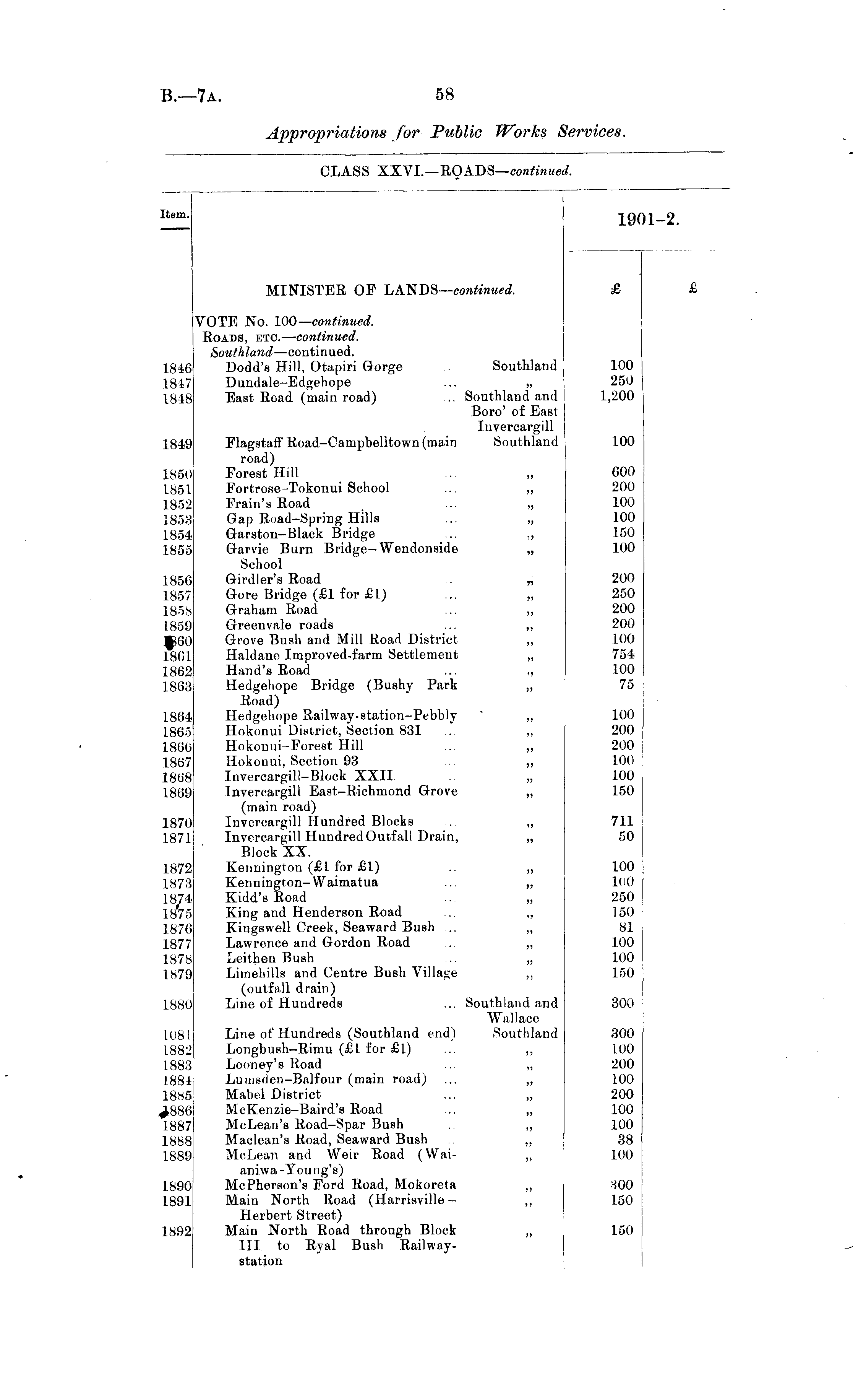 item. 19 1-2. £ £ MINISTER OF LANDS— continued. 1849 1850 1851 1852 1853 1854 1855 1856 1857 1858 1859 fS60 1861 1862 1863 1864 1865 1866 1867 1868 1869 .846 .847 .848 VOTE No. 100— continued. Roads, etc. — continued. Southland —continued. Dodd's Hill, Otapiri Gorge .. Southland Dundale-Edgehope ... „ East Road (main road) ... Southland and Boro' of East Invercargill Flagstaff Road-Campbelltown (main Southland road) Forest Hill Fortrose-Tokonui School ... ,, Frain's Road ... „ Gap Road-Spring Hills ... „ Garston-Black Bridge ... ,, Garvie Burn Bridge-Wendonside „ School Girdler's Road . „ Gore Bridge (£1 for £L) Graham Road ... ,, Greeuvale roads ... ,, Grove Bush and Mill Road District ,, Haldane Improved-farm Settlement „ Hand's Road ... „ Hedgehope Bridge (Bushy Park „ Road) Hedgehope Railway-station-Pebbly ,, Hokonui District, Section 831 .. ,, Hokonui-Forest Hill ... ,, Hokonui, Section 93 ... ,, Iuvercargill-Block XXII „ Invercargill East-Richmond Grove ,, (main road) Invercargill Hundred Blocks ... ,, Invercargill Hundred Outfall Drain, ,, Block XX. Kennington (£I for £1) .. „ Kennington-Waimatua ... „ Kidd's Road .. „ King and Henderson Road ... „ Kingswell Creek, Seaward Bush ... „ Lawrence and Gordon Road ... „ Leithen Bush „ Limehills and Centre Bush Village ,, (outfall drain) Line of Hundreds ... Southland and Wallace Line of Hundreds (Southland end) Southland Longbush-Rimu (£1 for £l) ... „ Looney's Road . „ Lumsden-Balfour (main road) ... „ Mabel District ... „ McKenzie-Baird's Road ... „ McLean's Road-Spar Bush ... „ Maclean's Road, Seaward Bush ,, McLean and Weir Road (Wai- „ aniwa-Young's) McPherson's Ford Road, Mokoreta ,, Main North Road (Harrisville - ,, Herbert Street) Main North Road through Block „ III to Ryal Bush Railwaystation 100 250 1,200 100 600 200 100 100 150 100 200 250 200 200 100 754 100 75 100 200 200 100 100 150 1870 1871 711 50 1872 1873 1874 1875 1876 1877 1878 1879 100 100 250 150 81 100 100 150 1880 300 1081 1882 1883 1884 1885 *886' 1887! 1888 1889 300 LOO 200 100 200 100 100 38 100 1890 1891 300 150 1892 150