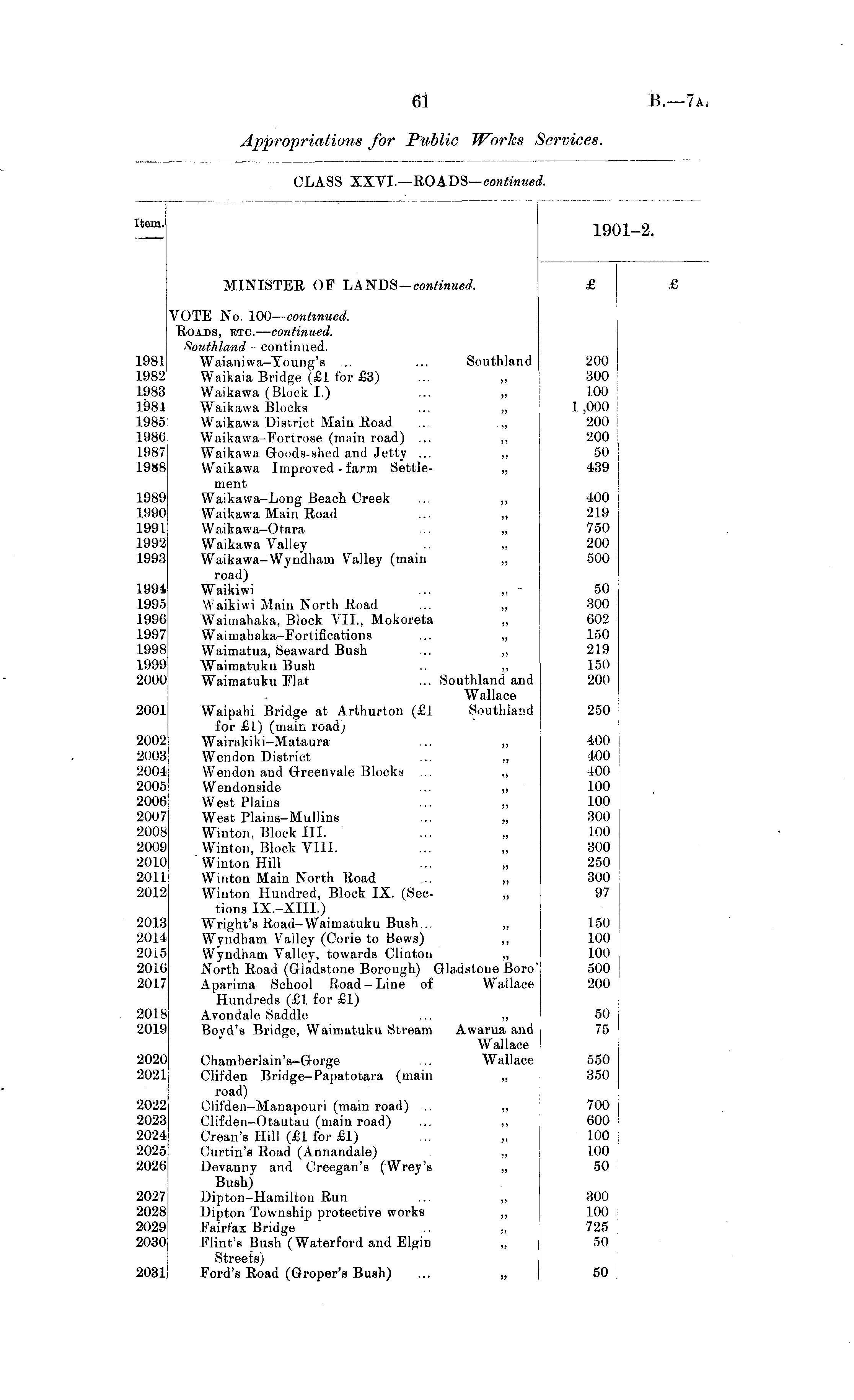[tern. 1901-2. MINISTER OF LANDS-continued. £ 1981 1982 1983 1984 1985 1986 1987 1988 1989 1990 1991 1992 1993 1994 1995 1996 1997 1998 1999 2000 2001 2002 2003 2004 2005 2006 2007 2008 2009 2010 2011 2012 VOTE No 100— continued. Roads, etc. — continued. Southland - continued. Waianiwa-Toung's ... ... Southland Waikaia Bridge (£1 for £3) Waikawa (Block 1.) ... ,, Waikawa Blocks ... „ Waikawa District Main Road ... „ Waikawa-Fortrose (main road) ... ,, Waikawa Goods-shed and Jetty ... ,, Waikawa Improved-farm Settle- „ ment Waikawa-Long Beach Creek ... ,, Waikawa Main Road ... ,, Waikawa—Otara ... „ Waikawa Valley .. „ Waikawa-Wyndham Valley (main ,, road) Waikiwi ... ,, - Waikiwi Main North Road ... „ Waimahaka, Block VII, Mokoreta „ Waimahaka-Fortifications ... „ Waimatua, Seaward Bush ... ,, Waimatuku Bush .. „ Waimatuku Flat ... Southland and Wallace Waipahi Bridge at Arthurton (£1 Southland for £L) (main road; Wairakiki-Mataura ... „ Wendon District ... „ Wendon and Greenvale Blocks ... „ Wendonside ... „ West Plains ... „ West Plains-Mullins Winton, Block III. Winton, Block VIII. Winton Hill Winton Main North Road ... ,, Winton Hundred, Block IX. (Sec- „ tions IX.-XII1.) Wright's Road-Waimatuku Bush .. „ Wyndham Valley (Corie to Bows) ,, Wyndham Valley, towards Clinton „ North Road (Gladstone Borough) Gladstone Boro' Aparima School Road-Line of Wallace Hundreds (£1 for £1) Avondale Saddle ... „ Boyd's Bridge, Waimatuku Stream Awarua and Wallace 1 Chamberlain's-Gorge ... Wallace Clifden Bridge-Papatotara (main „ road) Clifden-Manapouri (main road) .. „ Clifden-Otautau (main road) ... ,, Crean's Hill (£1 for £1) Curtin's Road (Annandale) ,, Devanny and Creegan's (Wrey's „ Bush) Dipton-Hamilton Run ... „ Dipton Township protective works ,, Fairfax Bridge .. „ Flint's Bush (Waterford and Elgin „ Streets) Ford's Road (Groper's Bush) ... „ 200 300 100 1 ,000 200 200 50 439 400 219 750 200 500 50 300 602 150 219 150 200 250 400 400 400 100 100 300 100 300 250 300 97 2013 2014 20l5 2016 2017 150 100 100 500 200 2018 2019 50 75 2020 2021 550 350 2022 2023 2024 2025 2026 700 600 100 100 50 2027 2028 2029 2030 300 100 725 50 203li 50