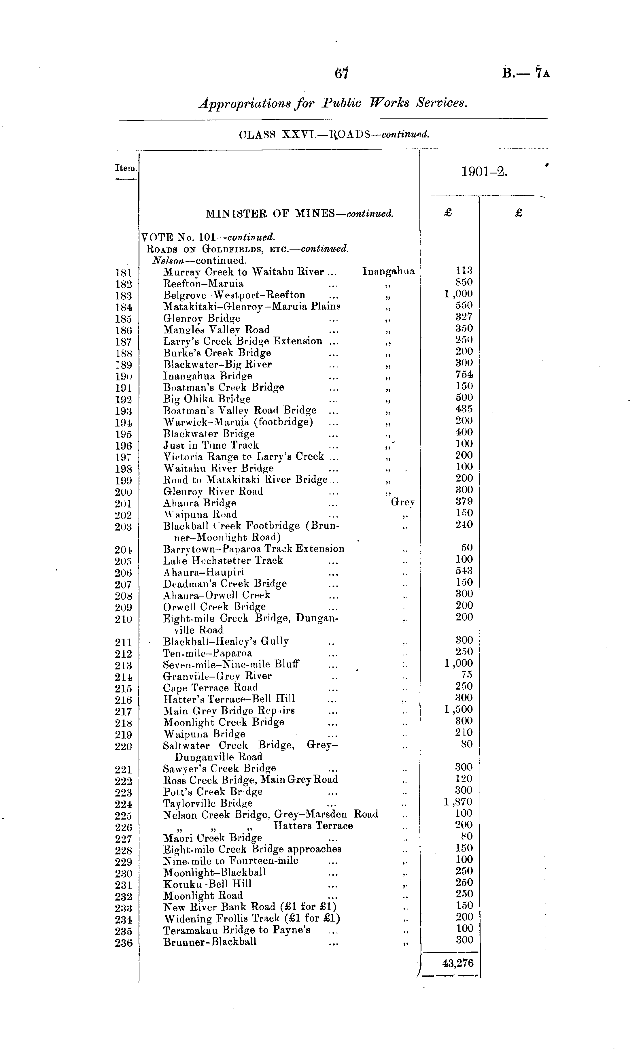 item. 19C 1-2. MINISTER OF MINES— continued. £ £ 18L 182 183 184 185 186 187 188 :89 19o 191 192 193 194 195 196 197 198 199 200 201 202 203 201 205 206 207 208 209 210 VOTE No. 101— continued. Roads on Goldfields, etc. — continued. Nelson —continued. Murray Creek to Waitahu River ... Inangahua Reefton—Maruia ... ,, Belgrove-Westport-Reefton ... „ Matakitaki-Glenroy -Maruia Plains „ Glenroy Bridge ... ,, Mangles Valley Road ... „ Larry's Creek Bridge Extension ... ,, Burke's Creek Bridge ... ,, Blackwater-Big River ... „ Inangahua Bridge ... „ Boatman's Creek Bridge ... „ Big Ohika Bridge ... „ Boatman's Valley Road Bridge ... „ Warwick-Maruia (footbridge) ... „ Blackwater Bridge ... ,, Just in Time Track ... „" Victoria Range to Larry's Creek ... „ Waitahu River Bridge ... „ Road to Matakitaki River Bridge . „ Glenroy River Road ... ,, Ahaura Bridge ... Grey Waipuna Road ... ,, Blackball (reek Footbridge (Brun- ,. ner-Moonlight Road) Barrvtown-Paparoa Track Extension Lake Hochstetter Track Ahaura-Haupiri Deadman's Creek Bridge Ahaura-Orwell Creek Orwell Creek Bridge Eight-mile Creek Bridge, Dungan- , ville Road ■ Blackball-Healey's Gully Ten-mile—Paparoa Seven-mile—Nine-mile Bluff Granville-Grev River Cape Terrace Road Hatter's Terrace-Bell Hill Main Grey Bridge Rep.irs Moonlight Creek Bridge Waipuna Bridge Saltwater Creek Bridge, Grey- ,. Dunganville Road Sawyer's Creek Bridge Ross Creek Bridge, Main Grey Road Pott's Creek Br dge Tavlorville Bridge Nelson Creek Bridge, Grey-Marsden Road „ „ „ Hatters Terrace Maori Creek Bridge Eight-mile Creek Bridge approaches Nine-mile to Fourteen-mile ... ,. Moonlight-Blackball ... ,. Kotuku-Bell Hill Moonlight Road ... , New River Bank Road (£1 for £1) Widening Frollis Track (£1 for £1) Teramakau Bridge to Payne's Brunner-Blackball ... „ 113 850 1 ,000 550 327 350 250 200 300 754 150 500 435 200 400 100 200 100 200 300 379 150 240 50 100 543 150 300 200 200 211 212 213 214 215 216 217 218 219 220 300 250 1,000 75 250 300 1 ,500 300 210 80 221 222 223 224 225 226 227 228 229 230 231 232 233 234 235 236 300 120 300 1,870 100 200 80 150 100 250 250 250 150 200 100 300 43,276