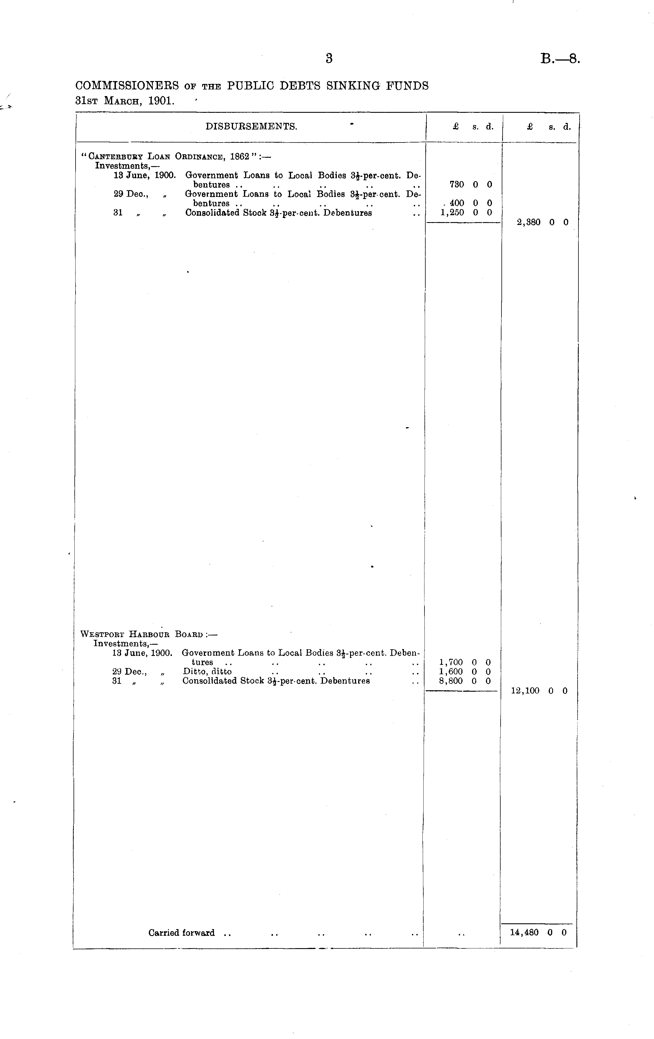 DISBURSEMENTS. £ s. d. £ s. d. " Cantebbory Loan Oedinancb, 1862 " :— Investments, — 13 June, 1900. Government Loans to Local Bodies 3J-per-cent. Debentures 29 Dec, „ Government Loans to Local Bodies 3J-per cent. Debentures 31 „ „ Consolidated Stock Debentures 730 0 0 .400 0 0 1,250 0 0 2,380 0 0 Westpoet Haebocb Boaed ;— Investments, — 13 June, 1900. Government Loans to Local Bodies 3J-per-cent. Debentures 29 Dec, „ Ditto, ditto 31 „ „ Consolidated Stock Debentures 1,TOO 0 0 1,600 0 0 8,800 0 0 12,100 0 0 Carried forward 14,480 0 0