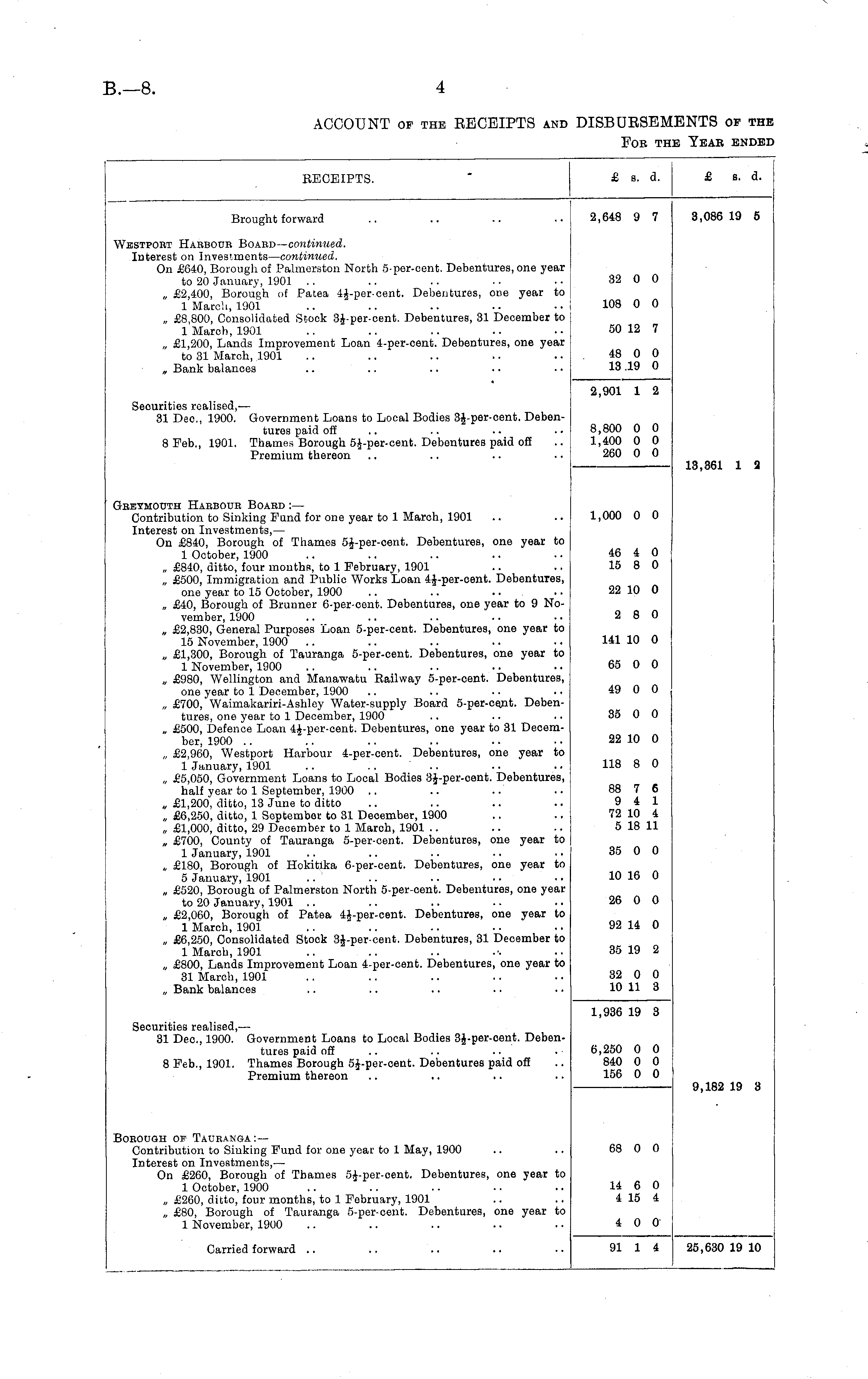 RECEIPTS. £ s. d. £ s. d. Brought forward 2,648 9 7 3,086 19 5 Wkstport Habboue Board— continued. Interest on Investments— continued. On £640, Borough of Palmcrston North 5-per-eent. Debentures, one year to 20 January, 1901 .. „ £2,400, Borough of Patea 4J-percent. Debentures, oue year to 1 March, 1901 „ £8,800, Consolidated Stock 3£-per-cent. Debentures, 31 December to 1 March, 1901 .. .. „ £1,200, Lands Improvement Loan 4-per-cent. Debentures, one year to 31 March, 1901 „ Bank balances 32 0 0 108 0 0 50 12 7 48 0 0 13 19 0 Securities realised, — 31 Dec, 1900. Government Loans to Local Bodies 3J-per-cent. Debentures paid off 8 Feb., 1901. Thames Borough 5J-per-cent. Debentures paid off Premium thereon 2,901 1 2 8,800 0 0 1,400 0 0 260 0 0 13,361 1 2 Greymouth Harboub Board :— Contribution to Sinking Fund for one year to 1 March, 1901 Interest on Investments, — On £840, Borough of Thames 5J-per-cent. Debentures, one year to 1 October, 1900 „ £840, ditto, four months, to 1 February, 1901 „ £500, Immigration and Public Works Loan 4J-per-cent. Debentures, one year to 15 October, 1900 „ £40, Borough of Brunner 6-percent. Debentures, one year to 9 November, 1900 „ £2,830, General Purposes Loan 5-per-cent. Debentures, one year to 15 November, 1900 .. „ £1,300, Borough of Tauranga 5-per-cent. Debentures, one year to 1 November, 1900 „ £980, Wellington and Manawatu Railway 5-per-cent. Debentures, one year to 1 December, 1900 „ £700, Waimakariri-Ashley Water-supply Board 5-per-cent. Debentures, one year to 1 December, 1900 „ £500, Defence Loan 4£-per-cent. Debentures, one year to 31 December, 1900 .. „ £2,960, Westport Harbour 4-per-cent. Debentures, one year to 1 January, 1901 „ £5,050, Government Loans to Local Bodies 3£-per-cent. Debentures, half year to 1 Septembor, 1900 .. „ £1,200, ditto, 13 June to ditto „ £6,250, ditto, 1 September to 31 December, 1900 „ £1,000, ditto, 29 December to 1 March, 1901 .. „ £700, County of Tauranga 5-per-cent. Debentures, one year to 1 January, 1901 „ £180, Borough of Hokitika 6-per-cent. Debentures, one year to 5 January, 1901 „ £520, Borough of Palmerston North 5-per-cent. Debentures, one year to 20 January, 1901 .. .. „ £2,060, Borough of Patea 4J-per-cent. Debentures, one year to 1 March, 1901 „ £6,250, Consolidated Stock 3J-per-cent. Debentures, 31 December to 1 March, 1901 „ £800, Lands Improvement Loan 4-per-cent. Debentures, one year to 31 March, 1901 „ Bank balances 1,000 0 0 46 4 0 15 8 0 22 10 0 2 8 0 141 10 0 65 0 0 49 0 0 35 0 0 22 10 0 118 8 0 88 7 6 9 4 1 72 10 4 5 18 11 35 0 0 10 16 0 26 0 0 92 14 0 35 19 2 32 0 0 10 11 3 Securities realised, — 31 Dec, 1900. Government Loans to Local Bodies 3|-per-eent. Debentures paid off 8 Feb., 1901. Thames Borough 5J-per-cent. Debentures paid off Premium thereon 1,936 19 3 6,250 0 0 840 0 0 156 0 0 9,182 19 3 Bobough op Tauranga:—Contribution to Sinking Fund for one year to 1 May, 1900 Interest on Investments, — On £260, Borough of Thames 5£-per-oent. Debentures, one year to 1 October, 1900 „ £260, ditto, four months, to 1 February, 1901 „ £80, Borough of Tauranga 5-per-cent. Debentures, one year to 1 November, 1900 68 0 0 14 6 0 4 15 4 4 0 0 Carried forward 91 1 4 25,630 19 10