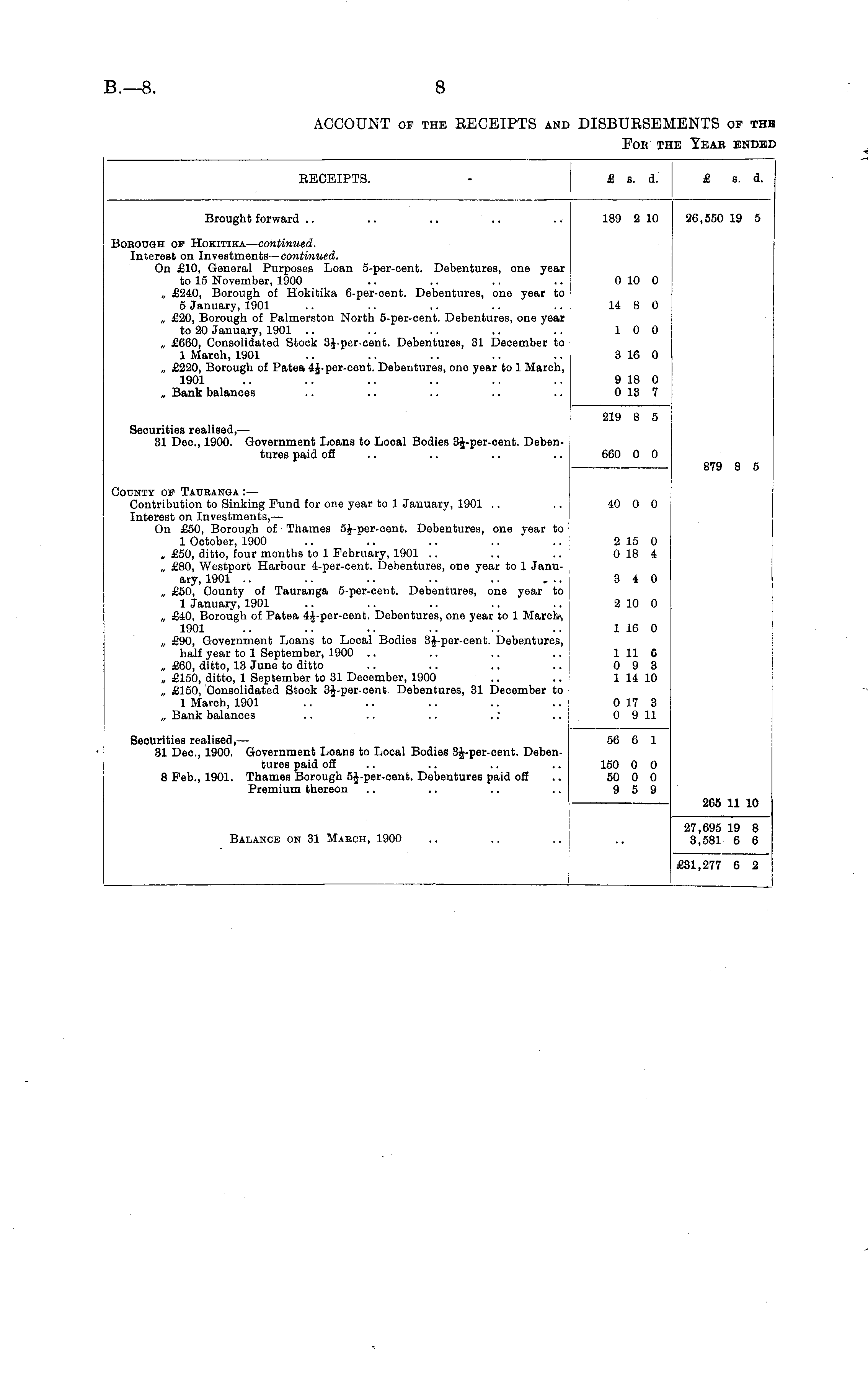 RECEIPTS. I £ 8. a. £ s. a. Brought forward .. 189 2 10 26,550 19 5 iORorjGH op Hokitika — continued. Interest on Investments— continued. On £10, General Purposes Loan 5-per-cent. Debentures, one year to 15 November, 1900 „ £240, Borough of Hokitika 6-per-oent. Debentures, one year to 5 January, 1901 „ £20, Borough of Palmerston North 5-per-cent. Debentures, one year to 20 January, 1901 .. .. „ £660, Consolidated Stock 3J-per-cent. Debentures, 31 December to 1 March, 1901 „ £220, Borough of Patea 4£-per-cent. Debentures, one year to 1 March, 1901 „ Bank balances 0 10 0 14 8 0 10 0 3 16 0 9 18 0 0 13 7 Securities realised, — 31 Dec, 1900. Government Loans to Local Bodies 3J-per-cent. Debentures paid off 219 8 5 660 0 0 879 8 5 Iounty of Tauranga :— Contribution to Sinking Fund for one year to 1 January, 1901 Interest on Investments, — On £50, Borough of Thames 5J-per-cent. Debentures, one year to 1 October, 1900 „ £50, ditto, four months to 1 February, 1901 .. „ £80, Westport Harbour 4-per-cent. Debentures, one year to 1 January, 1901 .. „ £50, County of Tauranga 5-per-cent. Debentures, one year to 1 January, 1901 .. .. „ £40, Borough of Patea Debentures, one year to 1 March, 1901 „ £90, Government Loans to Local Bodies 3J-per-cent. Debentures, half year to 1 September, 1900 .. „ £60, ditto, 13 June to ditto „ £150, ditto, 1 September to 31 December, 1900 „ £150, Consolidated Stock SJ-per-cent. Debentures, 31 December to 1 March, 1901 „ Bank balances 40 0 0 2 15 0 0 18 4 3 4 0 2 10 0 1 16 0 1 11 6 0 9 3 1 14 10 0 17 3 0 9 11 Securities realised, — 31 Dec, 1900. Government Loans to Local Bodies 3J-per-cent. Debentures paid off 8 Feb., 1901. Thames Borough 5J-per-cent. Debentures paid off Premium thereon 56 6 1 150 0 0 50 0 0 9 5 9 265 11 10 Balance on 31 March, 1900 27,695 19 8 3,581 6 6 £31,277 6 2