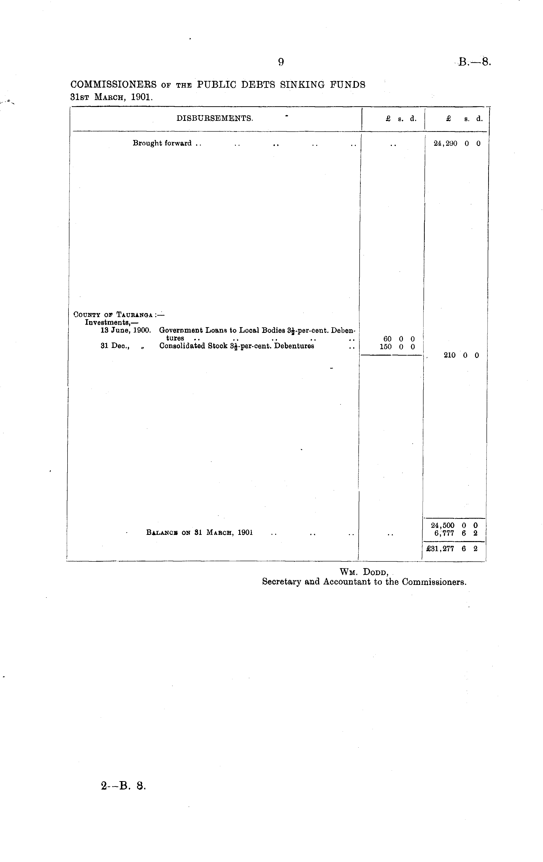 s. s. Brought forward 24,290 0 0 County of Taubanqa :— Investments, — 13 June, 1900. Government Loans to Local Bodies 3J-per-cent. Debentures 31 Dec, „ Consolidated Stock 3J-per-cent. Debentures 60 0 0 150 0 0 210 0 0 Balahcb on 31 March, 1901 24,500 0 0 6,777 6 2 £31,277 6 2