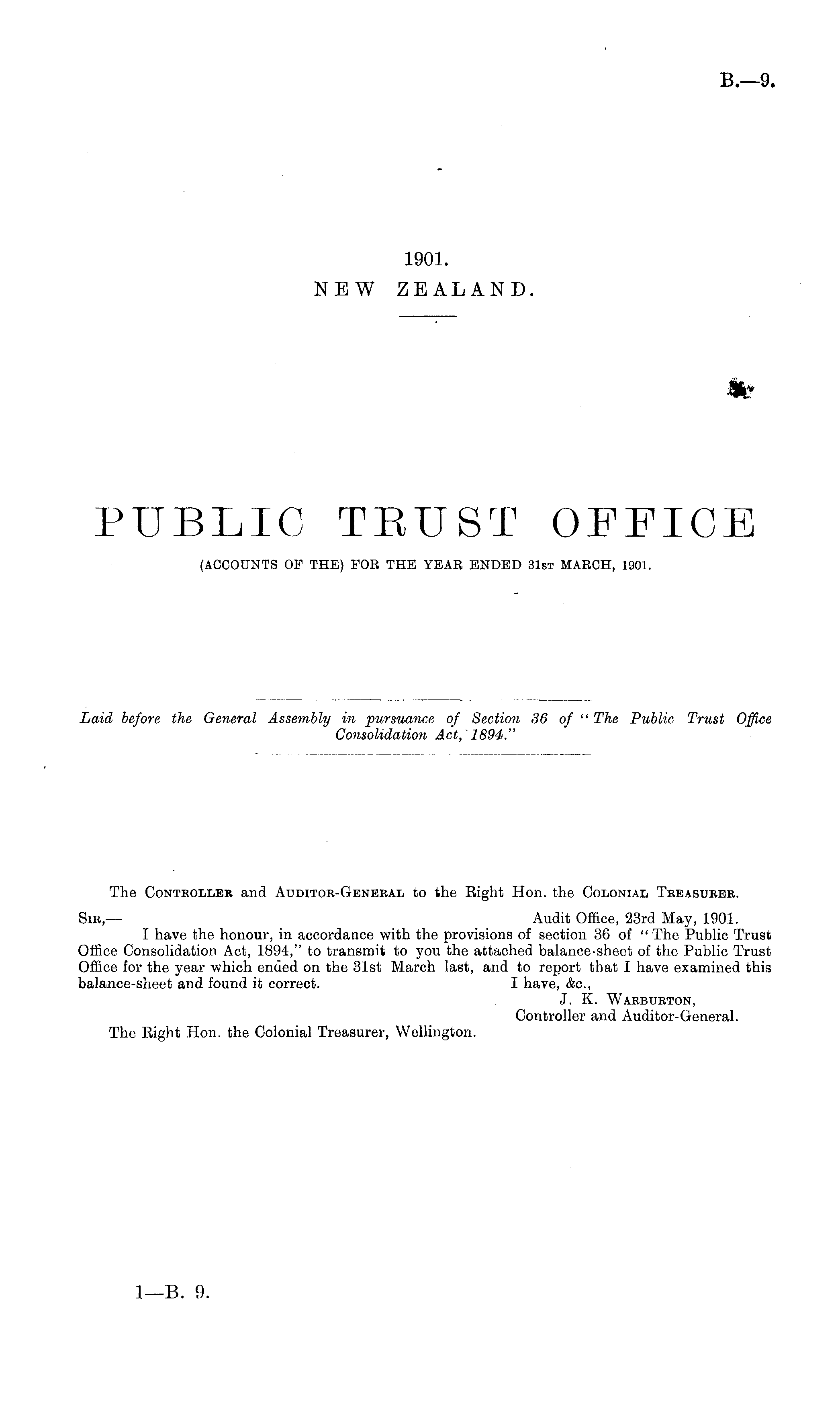 The Controller and Auditor-Geneeal to the Right Hon. the Colonial Treasurer. Sir,— Audit Office, 23rd May, 1901. I have the honour, in accordance with the provisions of section 36 of "The Public Trust Office Consolidation Act, 1894," to transmit to you the attached balance-sheet of the Public Trust Office for the year which ended on the 31st March last, and to report that I have examined this balance-sheet and found it correct. I have, &c, J. K. Warburton, Controller and Auditor-General. The Eight Hon. the Colonial Treasurer, Wellington.