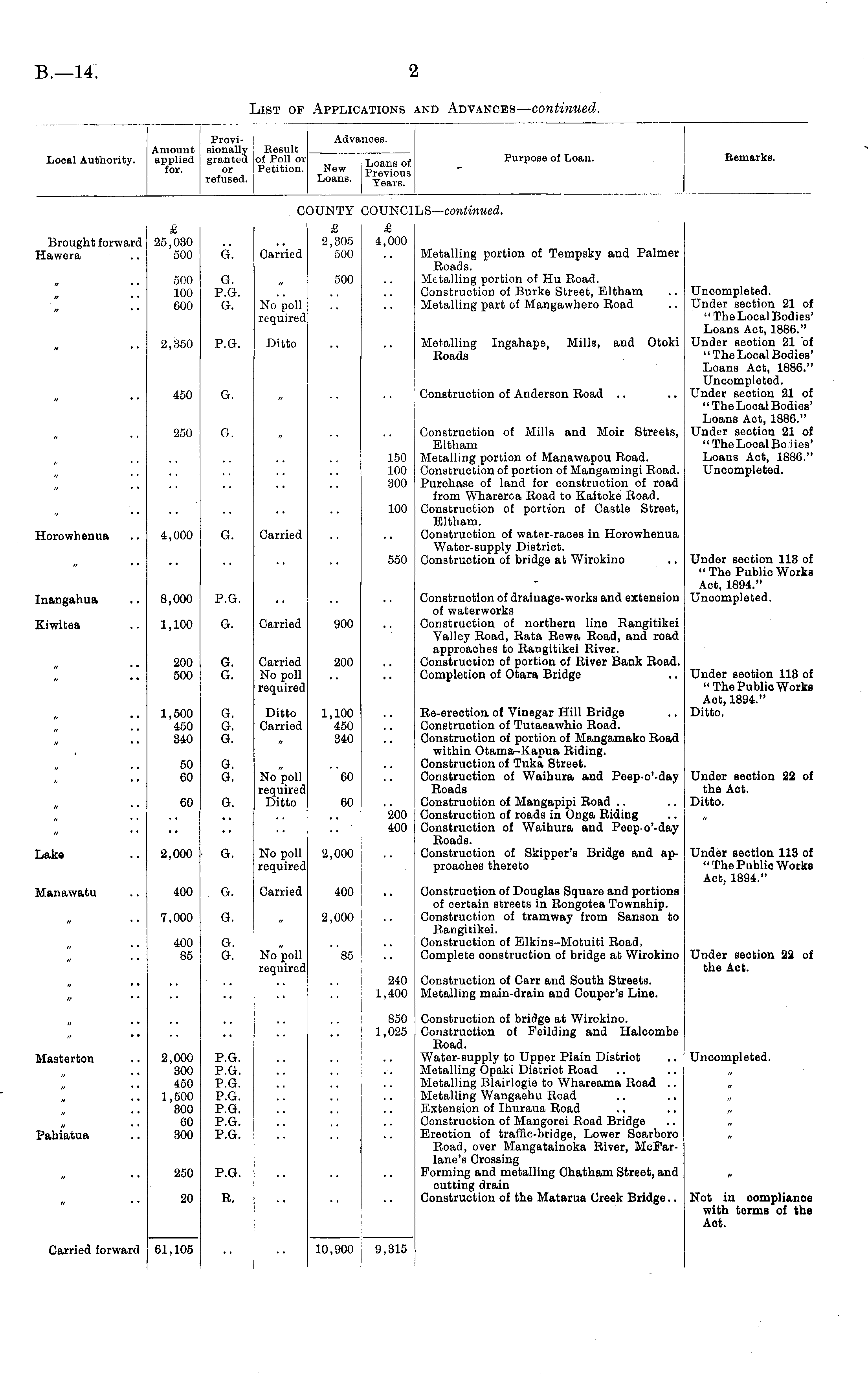 Local Authority. Amount applied for. Provisionally granted or refused. Result of Poll or Petition. ■it Loans o: j*ew p re vious Loans. Years Advances. Purpose of Loan. Remarks. O 'UNTY JOUNC LS — continued. Brought forward 3awera 25,030 500 Carried & 2,305 500 £ 4,000 Metalling portion of Tempsky and Palmer Roads. Metalling portion of Hu Road. Construction of Burke Street, Eltbam Metalling part of Mangawhero Road G. it • • 500 100 600 G. P.G. G. 500 Uncompleted. Under section 21 of "TheLocal Bodies' Loans Act, 1886." Under section 21 of "The Local Bodies' Loans Act, 1886." Uncompleted. Under section 21 of "The Local Bodies' Loans Act, 1886." Under section 21 of " The Local Bo iies' Loans Act, 1886." Uncompleted. No poll required 2,350 P.G. Ditto Metalling Ingahape, Mills, and Otoki Roads 450 G. Construction of Anderson Road 250 G. 150 100 300 Construction of Mills and Moir Streets, E 1th am Metalling portion of Manawapou Road. Construction of portion of Mangamingi Road. Purchase of land for construction of road from Whareroa Road to Kaitoke Road. Construction of portion of Castle Street, Eltham. Construction of water-races in Horowhenua Water-supply District. Construction of bridge at Wirokino 100 rlorowhenua 4,000 G. Carried 550 Under section 113 of "The PublioWorks Act, 1894." Uncompleted. Inangahua 8,000 P.G. Construction of drainage-works and extension of waterworks Construction of northern line Rangitikei Valley Road, Rata Rewa Road, and road approaches to Rangitikei River. Construction of portion of River Bank Road. Completion of Otara Bridge iiwitea 1,100 G. Carried 900 200 500 G. G. Carried No poll required 200 Under section 113 of "The Publio Works Aot, 1894." Ditto. 1,500 450 340 G. G. G. Ditto Carried 1,100 450 340 Re-erection, of Vinegar Hill Bridge Construction of Tutaeawhio Road. Construction of portion of Mangamako Road within Otama-Kapua Riding. Construction of Tuka Street. Construction of Waihura and Peep-o'-day Roads Construction of Mangapipi Road Construction of roads in Onga Riding Construction of Waihura and Peep o'-day Roads. Construction of Skipper's Bridge and approaches thereto 50 60 G. G. No "poll required Ditto 60 Under section 22 of the Act. Ditto. 60 G. 60 200 400 Lake VTanawatu 2,000 400 G. G. No poll required 2,000 400 Under section 113 of " The Public Works Act, 1894." Carried Construction of Douglas Square and portions of certain streets in Rongotea Township. Construction of tramway from Sanson to Rangitikei. Construction of Elkins-Motuiti Road, Complete construction of bridge at Wirokino 7,000 G. 2,000 400 85 G. G. No poll required "85 Under section 22 of the Act. 240 1,400 Construction of Carr and South Streets. Metalling main-drain and Couper's Line. 850 1,025 Construction of bridge at Wirokino. , Construction of Peilding and Halcombe Road. Water-supply to Upper Plain District Metalling Opaki District Road Metalling Blairlogie to Whareama Road .. Metalling Wangaehu Road Extension of Ihuraua Road Construction of Mangorei Road Bridge Erection of traffic-bridge, Lower Scarboro Road, over Mangatainoka River, McFarlane's Crossing Forming and metalling Chatham Street, and cutting drain Construction of the Matarua Creek Bridge.. Uncompleted. Hasterton 2,000 300 450 1,500 300 60 300 P.G. P.G. P.G. P.G. P.G. P.G. P.G. Pahiatua 250 P.G. 20 R. Not in compliance with terms of the Aot. Carried forward 61,105 10,900 9,315