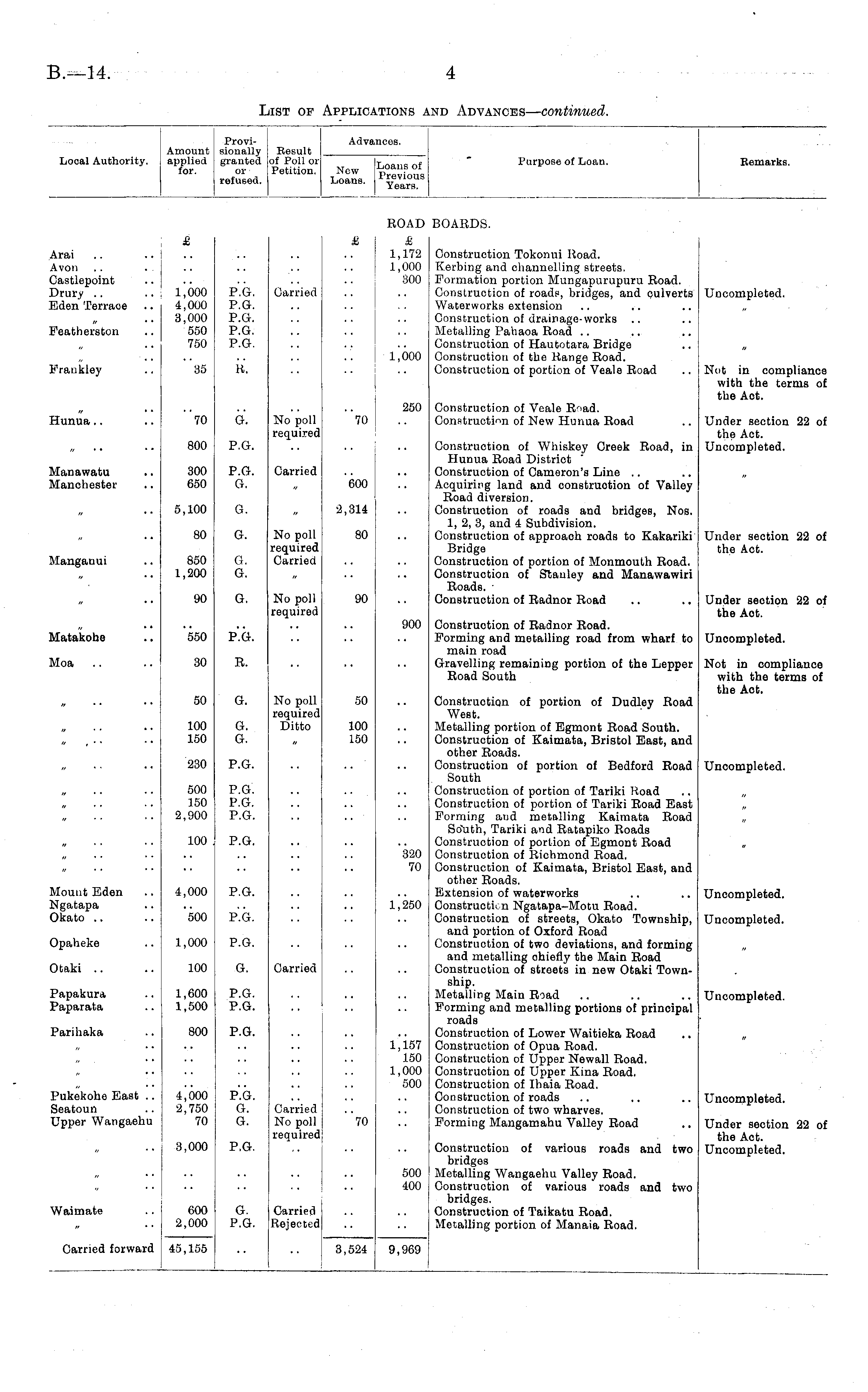 Provisionally granted or refused. Advances. Remarks. Local Authority. Amount applied for. Result of Poll or Petition. N Loans of Loans Previous Loans. Yearg Purpose of Loan. ROAD BOARDS. Arai Avon Gastlepoint Drury Eden Terrace £ £ £ 1,172 1,000 300 Construction Tokonui Koad. Ket'bing and channelling streets. Formation portion Mungapurupuru Road. Construction of road?, bridges, and culverts Waterworks extension Construction of drainage-works Metalling Pahaoa Road Construction of Hautotara Bridge Construction of the Range Road. Construction of portion of Veale Road 1,000 4,000 3,000 550 750 P.G. P.G. P.G. P.G. P.G. Carried Uncompleted. Featherston 35 R. l^000 Fraukley Not in compliance with the terms of the Act. Hunua G. 70 250 Construction of Veale R'>ad. Construction of New Hunua Road "70 800 P.G. No poll required Construction of Whiskey Creek Road, in Hunua Road District Construction of Cameron's Line Acquiring land and construction of Valley Road diversion. Construction of roads and bridges, Nos. 1, 2, 3, and 4 Subdivision. Construction of approaoh roads to Kakariki Bridge Construction of portion of Monmouth Road. Construction of Stanley and Manawawiri Roads. ■ Construction of Radnor Road Under section 22 of the Act. Uncompleted. Manawatu Manchester .. 300 650 P.G. G. Carried 600 5,100 G. 2,314 Under section 22 of the Act. 80 G. No poll required Carried 80 Mangauui 850 1,200 G. G. 90 G. No poll required 90 Under section 22 of the Aot. Matakohe 550 P.G. 900 Construction of Radnor Road. Forming and metalling road from wharf to main road Gravelling remaining portion of the Lepper Road South Uncompleted. Moa 30 R. Not in compliance with the terms of the Act. 50 G. No poll required Ditto 50 Construction of portion of Dudley Road West. Metalling portion of Egmont Road South. Construction of Kaimata, Bristol East, and other Roads. Construction of portion of Bedford Road South Construction of portion of Tariki Road Construction of portion of Tariki Road East Forming and metalling Kaimata Road South, Tariki and Ratapiko Roads Construction of portion of Egmont Road Construction of Richmond Road. Construction of Kaimata, Bristol East, and other Roads. Extension of waterworks Construeti< n Ngatapa-Motu Road. Construction of streets, Okato Township, and portion of Oxford Road Construction of two deviations, and forming and metalling ohiefly the Main Road Construction of streets in new Otaki Township. Metalling Main Road Forming and metalling portions of principal roads Construction of Lower Waitieka Road Construction of Opua Road. Construction of Upper Newall Road. Construction of Upper Kina Road. Construction of Ihaia Road. Construction of roads Construction of two wharves. Forming Mangamahu Valley Road 100 150 G. G. 100 150 230 P.G. Uncompleted. 500 150 2,900 P.G. P.G. P.G. 100 P.G. 320 70 Mount Eden Ngatapa Okato 4,000 P.G. 1,250 Uncompleted. - 500 P.G. Uncompleted. Opaheke 1,000 P.G. Otaki .. 100 G. Carried Papakura Paparata 1,600 1,500 P.G. P.G. Uncompleted. Parihaka 800 P.G. 1,157 150 1,000 500 Pukekohe East .. Seatoun Upper Wangaehu 4,000 2,750 70 P.G. G. G. Carried No poll required 70 Uncompleted. 3,000 P,G. Under section 22 of the Act. Uncompleted. 500 400 Construction of various roads and two bridges Metalling Wangaehu Valley Road. Construction of various roads and two bridges. Construction of Taikatu Road. Metalling portion of Manaia Road. Waimate 600 2,000 G. P.G. Carried Rejected Carried forward 45,155 3,524 9,969