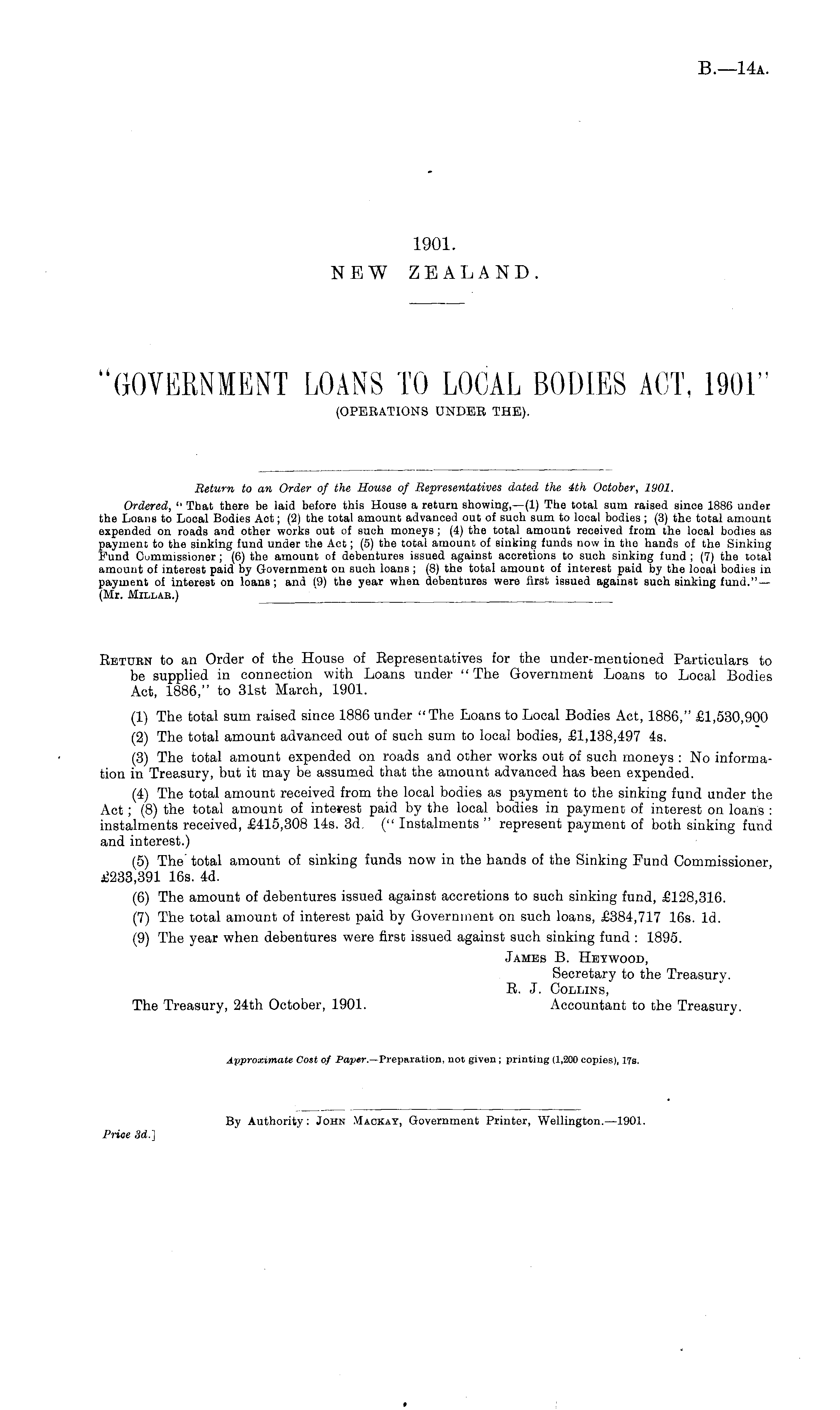 Return to an Order of the House of Representatives for the under-mentioned Particulars to be supplied in connection with Loans under " The Government Loans to Local Bodies Act, 1886," to 31st March, 1901. (1) The total sum raised since 1886 under "The Loans to Local Bodies Act, 1886," £1,530,900 (2) The total amount advanced out of such sum to local bodies, £1,138,497 4s. (3) The total amount expended on roads and other works out of such moneys : No information in Treasury, but it may be assumed that the amount advanced has been expended. (4) The total amount received from the local bodies as payment to the sinking fund under the Act ; (8) the total amount of interest paid by the local bodies in payment of interest on loans : instalments received, £415,308 14s. 3d. (" Instalments " represent payment of both sinking fund and interest.) (5) The' total amount of sinking funds now in the hands of the Sinking Fund Commissioner, £233,391 16s. 4d. (6) The amount of debentures issued against accretions to such sinking fund, £128,316. (7) The total amount of interest paid by Government on such loans, £384,717 16s. Id. (9) The year when debentures were first issued against such sinking fund : 1895. James B. Heywood, Secretary to the Treasury. R. J. Collins, The Treasury, 24th October, 1901. Accountant to the Treasury. Approximate Cost of Paper.— Preparation, not given ; printing (1,200 copies), 17s.