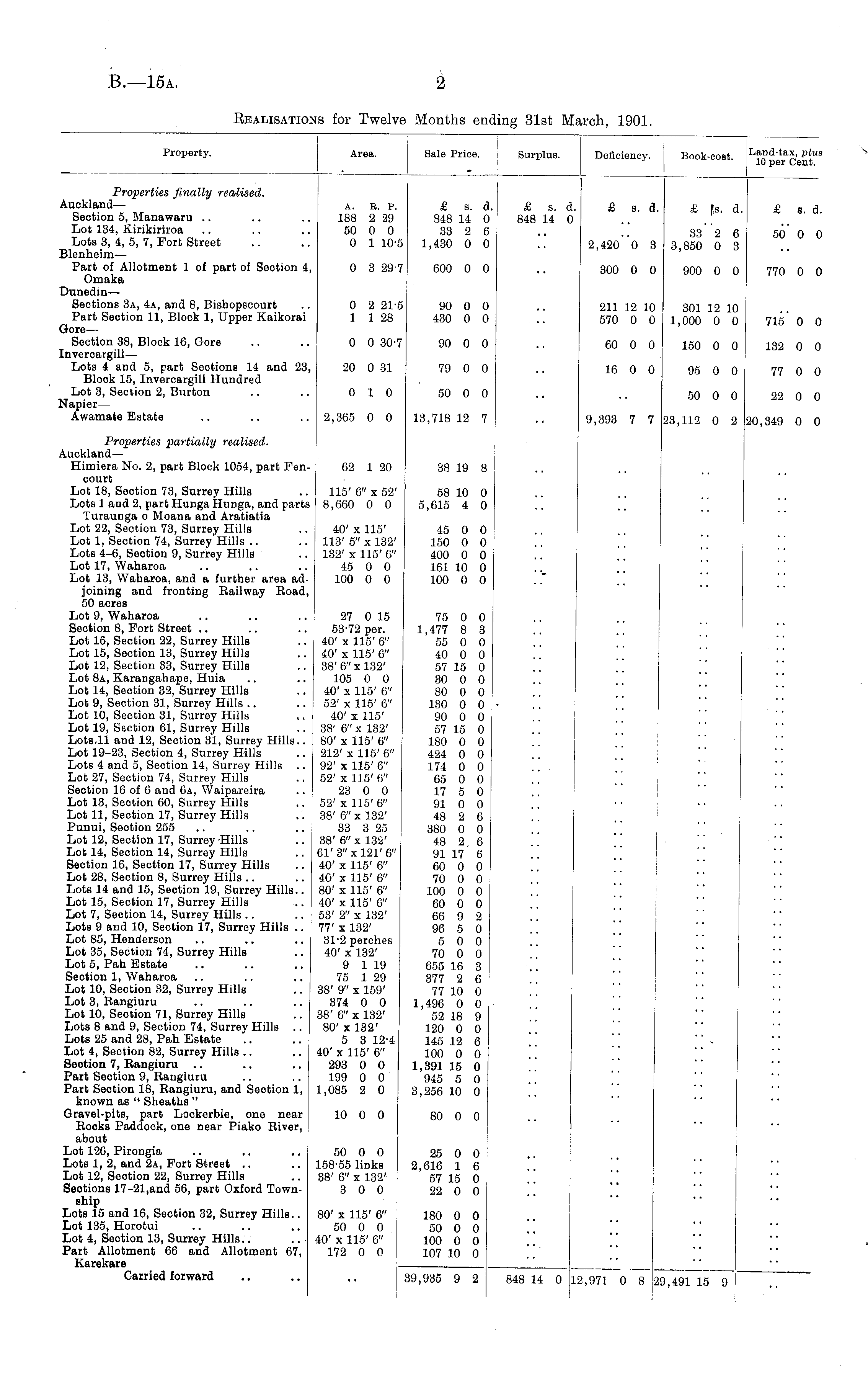 Property. Area. Sale Price. Surplus. Deficiency. Book-cost Land-tax, plus uooK cost. 1Q per Cen( . Properties finally realised. Auckland— Section 5, Manawaru Lot 134, Kirikiriroa Lots 3, 4, 5, 7, Fort Street Blenheim— Part of Allotment 1 of part of Section 4, Omaka Dunedin— Sections 3a, 4a, and 8, Bishopscourt Part Section 11, Block 1, Upper Kaikorai Gore— Section 38, Block 16, Gore Invercargill— Lots 4 and 5, part Seotions 14 and 23, Block 15, Invercargill Hundred Lot 3, Section 2, Burton Napier— Awamate Estate A. B. p. 188 2 29 50 0 0 0 1 10-5 0 3 29-7 0 2 21-5 1 1 28 £ s. d. 848 14 0 33 2 6 1,430 0 0 600 0 0 90 0 0 430 0 0 £ s. d. 848 14 0 £ s. d. 2,42o"o 3 300 0 0 211 12 10 570 0 0 £ fs. d. 33 2 6 3,850 0 3 900 0 0 301 12 10 1,000 0 0 £ s. d. 50 0 0 770 0 0 715' 0 0 0 0 30-7 90 0 0 60 0 0 150 0 0 132 0 0 20 0 31 79 0 0 16 0 0 95 0 0 77 0 0 0 10 50 0 0 50 0 0 22 0 0 2,365 0 0 13,718 12 7 9,393 7 7 23,112 0 2 20,349 0 0 Properties partially realised. Auckland— Himiera No. 2, part Block 1054, part Fencourt Lot 18, Section 73, Surrey Hills Lots 1 and 2, part HungaHunga, and parts Turaunga o Moana and Aratiatia Lot 22, Section 73, Surrey Hills Lot 1, Section 74, Surrey Hills Lots 4-6, Section 9, Surrey Hills Lot 17, Waharoa Lot 13, Waharoa, and a further area adjoining and fronting Railway Road, 50 acres Lot 9, Waharoa Section 8, Fort Street Lot 16, Section 22, Surrey Hills Lot 15, Section 13, Surrey Hills Lot 12, Section 33, Surrey Hills Lot 8a, Karangahape, Huia Lot 14, Seotion 32, Surrey Hills Lot 9, Section 31, Surrey Hills Lot 10, Section 31, Surrey Hills Lot 19, Section 61, Surrey Hills Lots.11 and 12, Section 31, Surrey Hills.. Lot 19-23, Section 4, Surrey Hills Lots 4 and 5, Seotion 14, Surrey Hills .. Lot 27, Section 74, Surrey Hills Section 16 of 6 and 6a, Waipareira Lot 13, Section 60, Surrey Hills Lot 11, Section 17, Surrey Hills Punui, Seotion 255 Lot 12, Section 17, Surrey -Hills Lot 14, Section 14, Surrey Hills Section 16, Section 17, Surrey Hills Lot 28, Section 8, Surrey Hills Lots 14 and 15, Section 19, Surrey Hills.. Lot 15, Section 17, Surrey Hills Lot 7, Section 14, Surrey Hills Lots 9 and 10, Section 17, Surrey Hills .. Lot 85, Henderson Lot 35, Section 74, Surrey Hills Lot 5, Pah Estate Section 1, Waharoa Lot 10, Section 32, Surrey Hills Lot 3, Rangiuru Lot 10, Section 71, Surrey Hills Lots 8 and 9, Section 74, Surrey Hills .. Lots 25 and 28, Pah Estate Lot 4, Section 82, Surrey Hills Section 7, Rangiuru Part Section 9, Rangiuru Part Section 18, Rangiuru, and Section 1, known as " Sheaths " Gravel-pits, part Lockerbie, one near Rooks Paddock, one near Piako River, about Lot 126, Pirongia Lots 1, 2, and 2a, Fort Street Lot 12, Section 22, Surrey Hills Seotions 17-21,and 56, part Oxford Township Lots 15 and 16, Section 32, Surrey Hills.. Lot 135, Horotui Lot 4, Section 13, Surrey Hills.. Part Allotment 66 and Allotment 67, Karekare Carried forward 62 1 20 115' 6" x 52' 8,660 0 0 40' x 115' 113' 5" x 132' 132' x 115' 6" 45 0 0 100 0 0 27 0 15 53-72 per. 40' x 115' 6" 40' x 115' 6" 38'6"x 132' 105 0 0 40' x 115' 6" 52' x 115' 6" 40' x 115' 38' 6" x 132' 80' x 115' 6" 212' x 115' 6" 92' x 115' 6" 52' x 115'6" 23 0 0 52' xll5'6" 38' 6" x 132' 33 3 25 38' 6" x 132' 61'3" x 121'6" 40' x 115' 6" 40' x 115' 6" 80' x 115' 6" 40' x 115' 6" 53' 2" x 132' 77' x 132' 31-2 perches 40' x 132' 9 1 19 75 1 29 38' 9" x 159' 374 0 0 38' 6" x 132' 80' x 132' 5 3 12-4 40' x 115' 6" 293 0 0 199 0 0 1,085 2 0 38 19 8 58 10 0 5,615 4 0 45 0 0 150 0 0 400 0 0 161 10 0 100 0 0 75 0 0 1,477 8 3 55 0 0 40 0 0 57 15 0 30 0 0 80 0 0 130 0 0 90 0 0 57 15 0 180 0 0 424 0 0 174 0 0 65 0 0 17 5 0 91 0 0 48 2 6 380 0 0 48 2. 6 91 17 6 60 0 0 70 0 0 100 0 0 60 0 0 66 9 2 96 5 0 5 0 0 70 0 0 655 16 3 377 2 6 77 10 0 1,496 0 0 52 18 9 120 0 0 145 12 6 100 0 0 1,391 15 0 945 5 0 3,256 10 0 10 0 0 80 0 0 50 0 0 158-55 links 38' 6" x 132' 3 0 0 25 0 0 2,616 1 6 57 15 0 22 0 0 80' x 115' 6" 50 0 0 40' x 115' 6" 172 0 0 180 0 0 50 0 0 100 0 0 107 10 0 39,935 9 2 848 14 0 12,971 0 8 29,491 15 9
