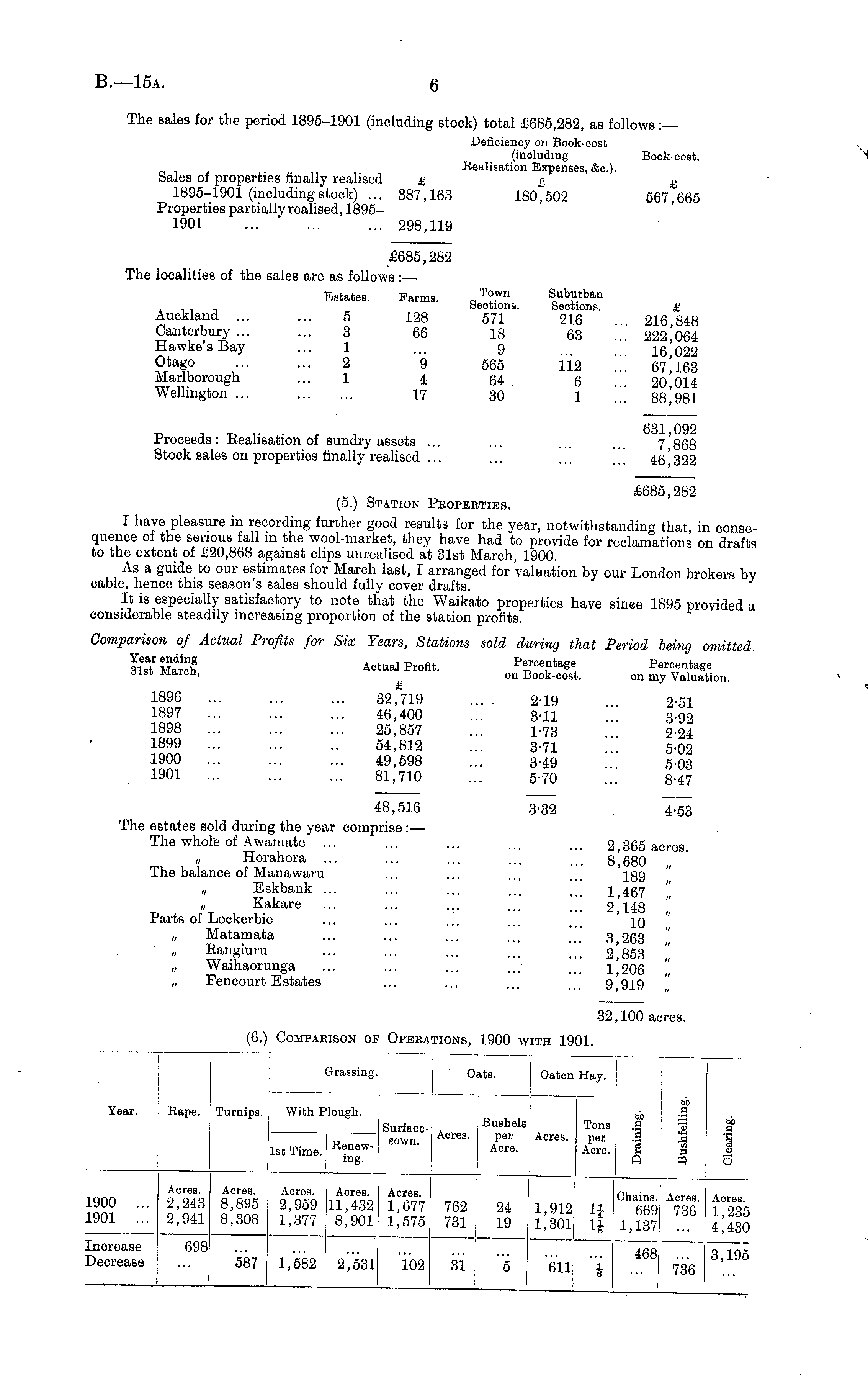 The sales for the period 1895-1901 (including stock) total £685,282, as follows :— Deficiency on Book-cost (including Book cost. Realisation Expenses, &c). bales of properties finally realised £ £ £ 1895-1901 (includingstock) ... 387,163 180,502 567,665 Properties partially realised, 1895--1901 ... 298,119 £685,282 The localities of the sales are as follows :— Estates. Farms. _ Town Suburban , . , . Sections. Sections. £ Auckland ... ... 5 128 571 216 . 216 848 Canterbury ... ... 3 66 18 63 ... 222,064 Hawke's Bay ... 1 ... 9 26 022 Otago 2 9 565 112 '.'.] 67463 Marlborough ... 1 4 64 6 20 014 Wellington ... 17 30 1 ... 88.981 _ __»•._■ , -, 631,092 Proceeds: Beahsation of sundry assets ... ... ... 7 g6B Stock sales on properties finally realised ... ... ... 46*322 £685,282 (5.) Station Properties. I have pleasure in recording further good results for the year, notwithstanding that, in consequence of the serious fall m the wool-market, they have had to provide for reclamations on drafts to the extent of £20,868 against clips unrealised at 31st March, 1900. As a guide to our estimates for March last, I arranged for valuation by our London brokers by cable, hence this season's sales should fully cover drafts. It is especially satisfactory to note that the Waikato properties have since 1895 provided a considerable steadily increasing proportion of the station profits. Comparison of Actual Profits for Six Years, Stations sold during that Period being omitted. flsY March Actual Profit. Percentage Percentage aia. marcn, on Book-oost. on my Valuation. 1896 32,719 .... 2-19 ... 2-51 1897 46,400 ... 3*ll ... 3-92 1898 25,857 ... 1-73 ... 2-24 1899 54,812 ... 3-71 ... 5-02 1900 49,598 ... 3-49 ... 503 1901 81,710 ... 5-70 ... 8-47 48,516 3-32 453 The estates sold during the year comprise :— The whole of Awamate ... ... ... ... ... 2 365 acres. Horahora ... ... ... ... ... 8.680 „ The balance of Manawaru ... ... ... Ig9 „ Eskbank ... ... ... ... ... 1 457 „ Kakare ... ... ... ... ... 2,148 Parts of Lockerbie ... ... ..,'. ... ' „ Matamata ... ... ... ... 3 263 Bangiuru ... ... ... ... [" 2*853 "„ „ Waihaorunga ... ... ... ... \ 206 „ Fencourt Estates ... ... ... ... 9 919 32,100 acres.