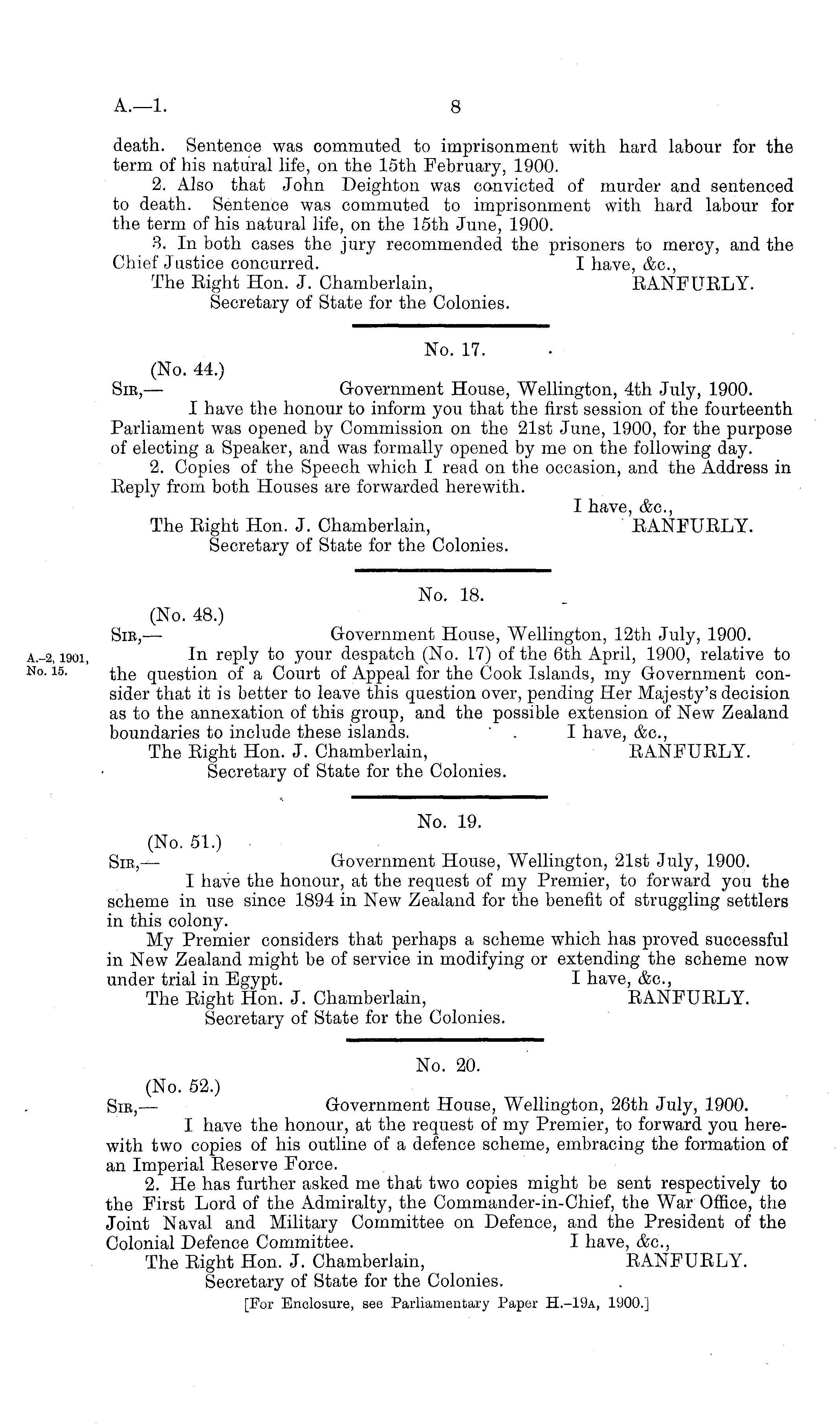 No. 17. (No. 44.) Sic, — Government House, Wellington, 4th July, 1900. I have the honour to inform you that the first session of the fourteenth Parliament was opened by Commission on the 21st June, 1900, for the purpose of electing a Speaker, and was formally opened by me on the following day. 2. Copies of the Speech which I read on the occasion, and the Address in Eeply from both Houses are forwarded herewith. I have, &c, The Eight Hon. J. Chamberlain, EANFUELY. Secretary of State for the Colonies.