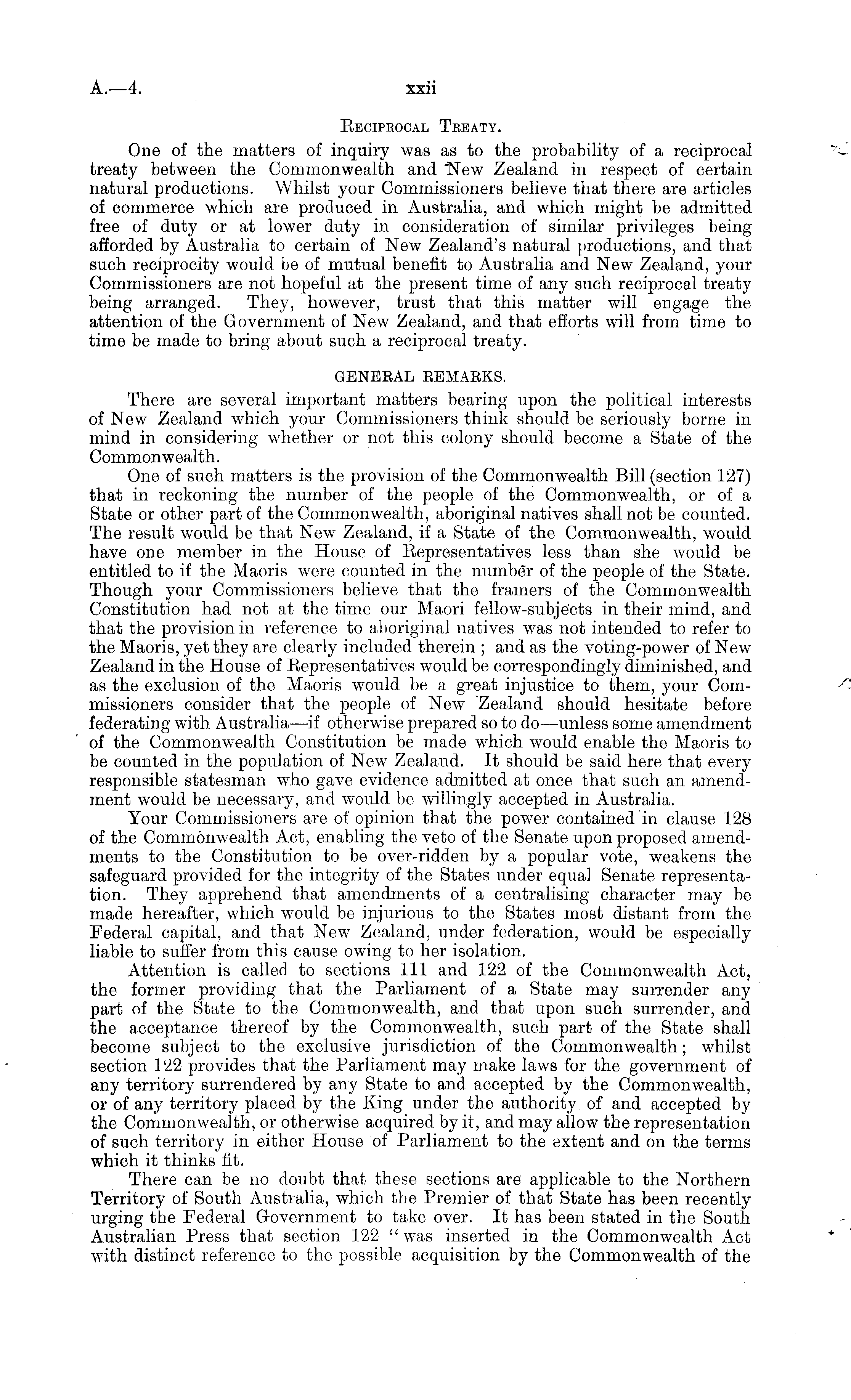 Recipbocal Treaty. One of the matters of inquiry was as to the probability of a reciprocal treaty between the Commonwealth and "New Zealand in respect of certain natural productions. Whilst your Commissioners believe that there are articles of commerce which are produced in Australia, and which might be admitted free of duty or at lower duty in consideration of similar privileges beingafforded by Australia to certain of New Zealand's natural productions, and that such reciprocity would be of mutual benefit to Australia and New Zealand, your Commissioners are not hopeful at the present time of any such reciprocal treaty being arranged. They, however, trust that this matter will engage the attention of the Government of New Zealand, and that efforts will from time to time be made to bring about such a reciprocal treaty. GENERAL EEMAEKS. There are several important matters bearing upon the political interests of New Zealand which your Commissioners think should be seriously borne in mind in considering whether or not this colony should become a State of the Commonwealth. One of such matters is the provision of the Commonwealth Bill (section 127) that in reckoning the number of the people of the Commonwealth, or of a State or other part of the Commonwealth, aboriginal natives shall not be counted. The result would be that New Zealand, if a State of the Commonwealth, would have one member in the House of Kepresentatives less than she would be entitled to if the Maoris were counted in the number of the people of the State. Though your Commissioners believe that the framers of the Commonwealth Constitution had not at the time our Maori fellow-subjects in their mind, and that the provision in reference to aboriginal natives was not intended to refer to the Maoris, yet they are clearly included therein ; and as the voting-power of New Zealand in the House of Representatives would be correspondingly diminished, and as the exclusion of the Maoris would be a great injustice to them, your Commissioners consider that the people of New "Zealand should hesitate before federating with Australia —if otherwise prepared so to do—unless some amendment of the Commonwealth Constitution be made which would enable the Maoris to be counted in the population of New Zealand. It should be said here that every responsible statesman w 7 ho gave evidence admitted at once that such an amendment would be necessary, and would be willingly accepted in Australia. Your Commissioners are of opinion that the power contained in clause 128 of the Commonwealth Act, enabling the veto of the Senate upon proposed amendments to the Constitution to be over-ridden by a popular vote, weakens the safeguard provided for the integrity of the States under equal Senate representation. They apprehend that amendments of a centralising character may be made hereafter, which would be injurious to the States most distant from the Federal capital, and that New Zealand, under federation, would be especially liable to suffer from this cause owing to her isolation. Attention is called to sections 111 and 122 of the Commonwealth Act, the former providing that the Parliament of a State may surrender any part of the State to the Commonwealth, and that upon such surrender, and the acceptance thereof by the Commonwealth, such part of the State shall become subject to the exclusive jurisdiction of the Commonwealth ; whilst section 122 provides that the Parliament may make laws for the government of any territory surrendered by any State to and accepted by the Commonwealth, or of any territory placed by the King under the authority of and accepted by the Commonwealth, or otherwise acquired by it, and may allow the representation of such territory in either House of Parliament to the extent and on the terms which it thinks fit. There can be no doubt that these sections are applicable to the Northern Territory of South Australia, which the Premier of that State has been recently urging the Federal Government to take over. It has been stated in the South Australian Press that section 122 " was inserted in the Commonwealth Act with distinct reference to the possible acquisition by the Commonwealth of the