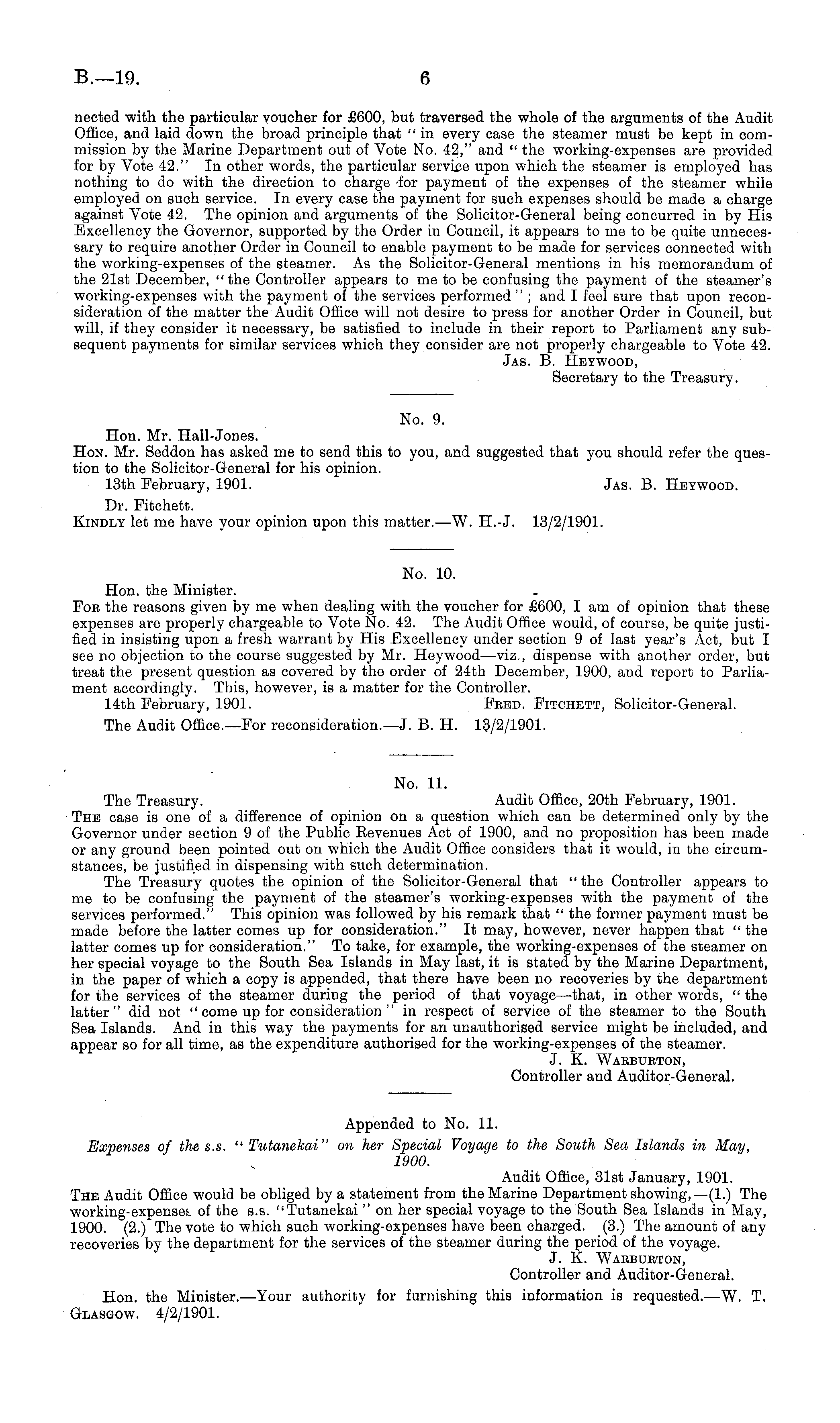 No. 10. Hon. the Minister. Foe the reasons given by me when dealing with the voucher for £600, I am of opinion that these expenses are properly chargeable to Vote No. 42. The Audit Office would, of course, be quite justified in insisting upon a fresh warrant by His Excellency under section 9 of last year's Act, but I see no objection to the course suggested by Mr. Heywood—viz,, dispense with another order, but treat the present question as covered by the order of 24th December, 1900, and report to Parliament accordingly. This, however, is a matter for the Controller. 14th February, 1901. Feed. Fitchett, Solicitor-General. The Audit Office.—For reconsideration.— J. B. H. 13/2/1901.